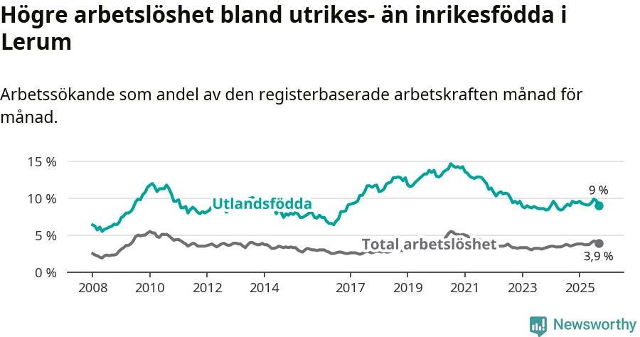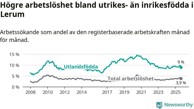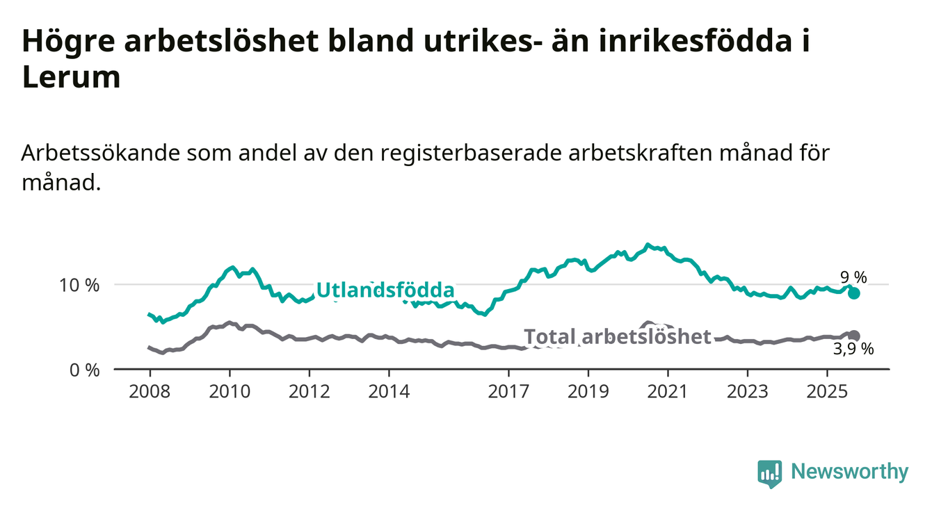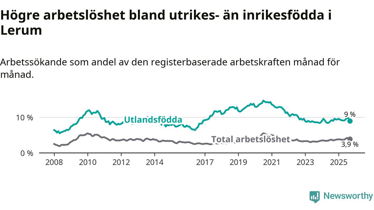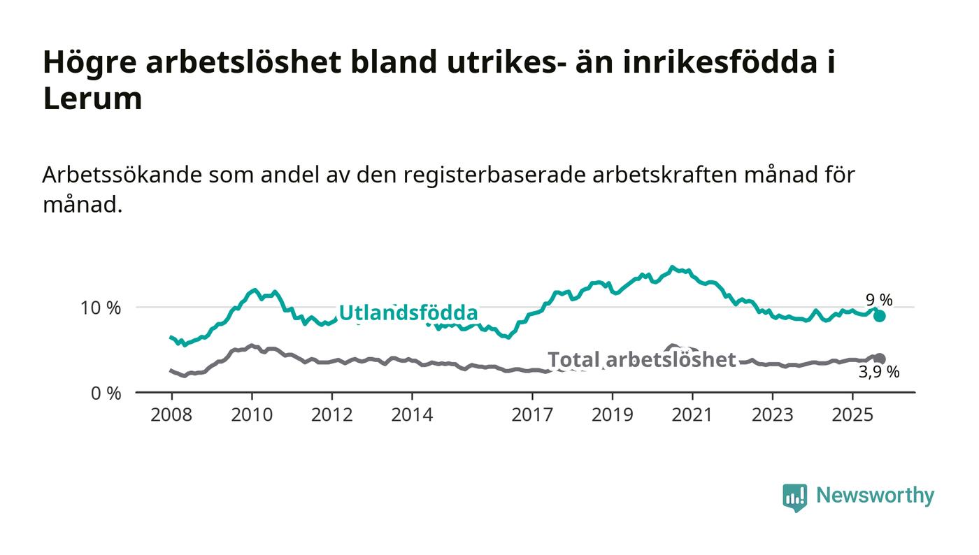 Arbetslösheten bland utlandsfödda var 9,0 procent i Lerum under september månad, motsvarande 274 av 3 044 personer. Det är i stort sett lika stor andel som i fjol.
