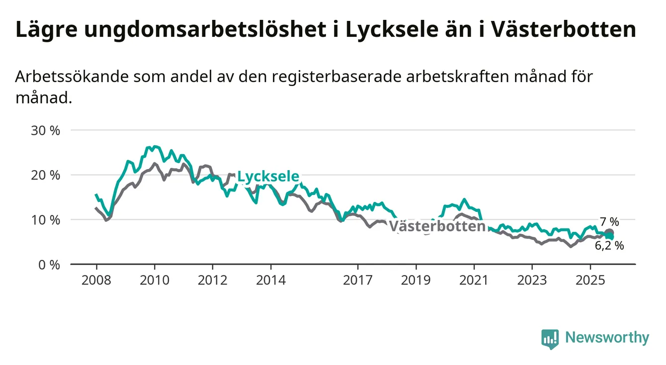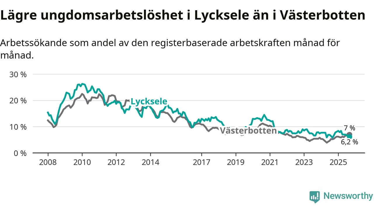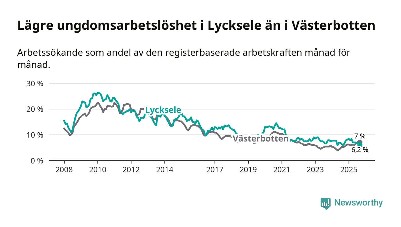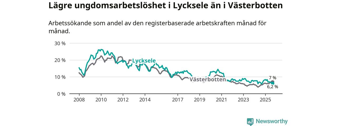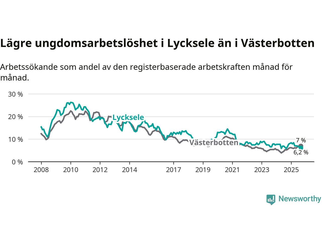 Precis som den totala arbetslösheten ligger ungdomsarbetslösheten i Lycksele lägre än i Västerbotten som helhet. Skillnaden mellan kommunen och länet är 0,8 procentenheter.