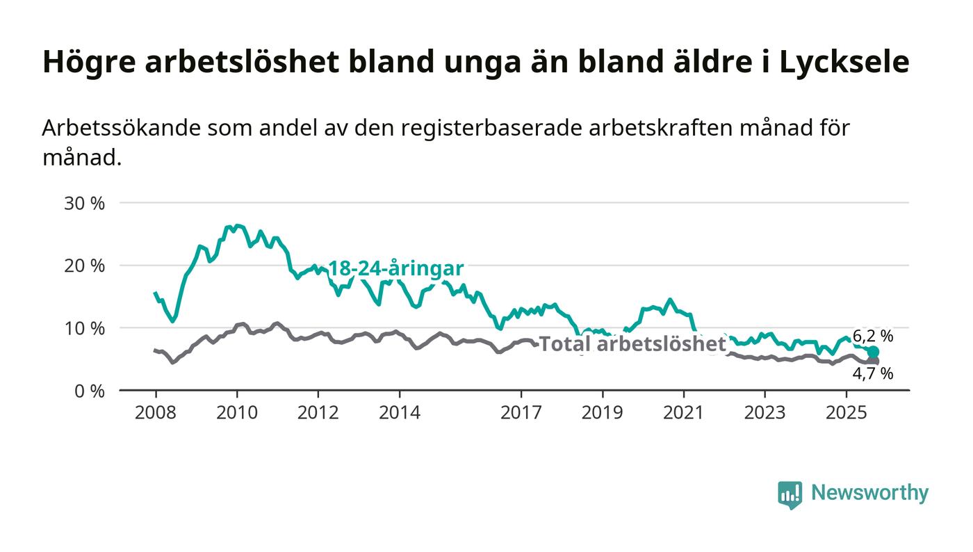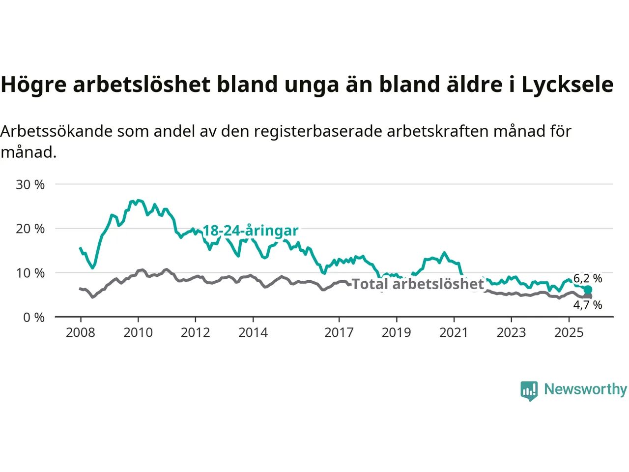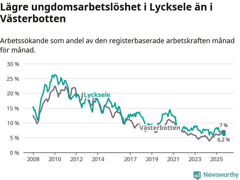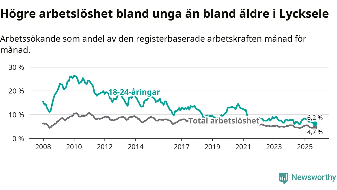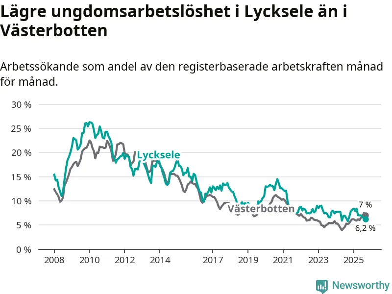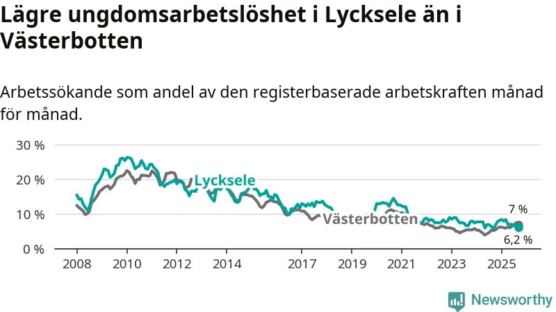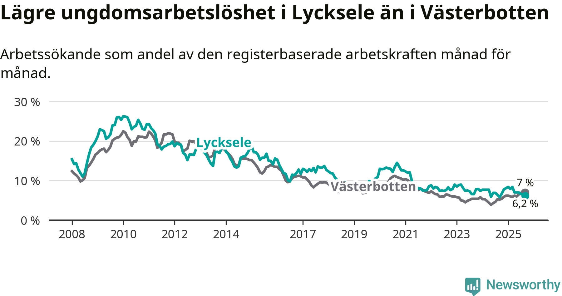 Precis som den totala arbetslösheten ligger ungdomsarbetslösheten i Lycksele lägre än i Västerbotten som helhet. Skillnaden mellan kommunen och länet är 0,8 procentenheter.