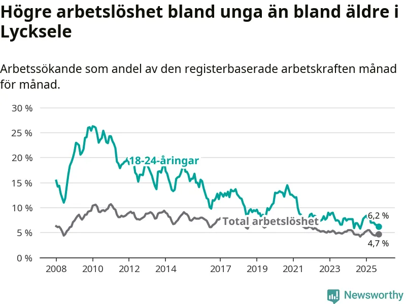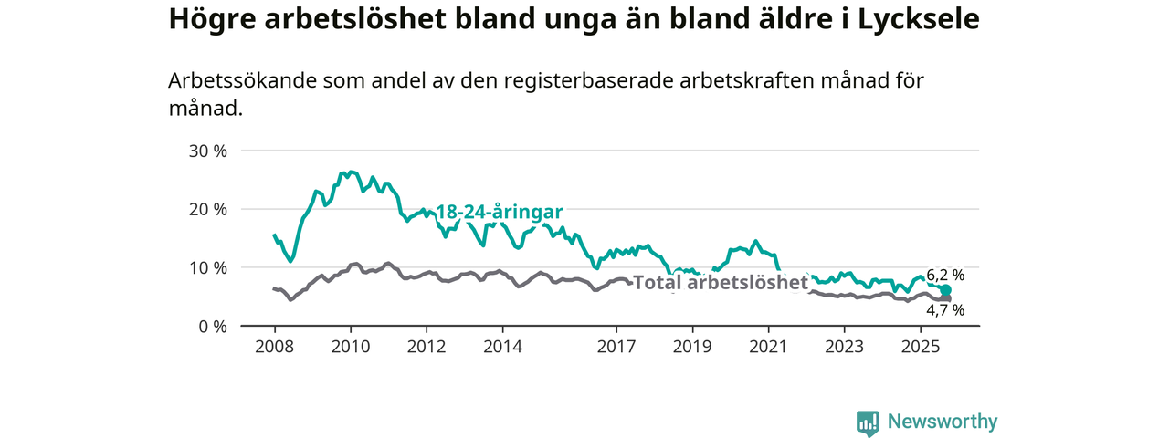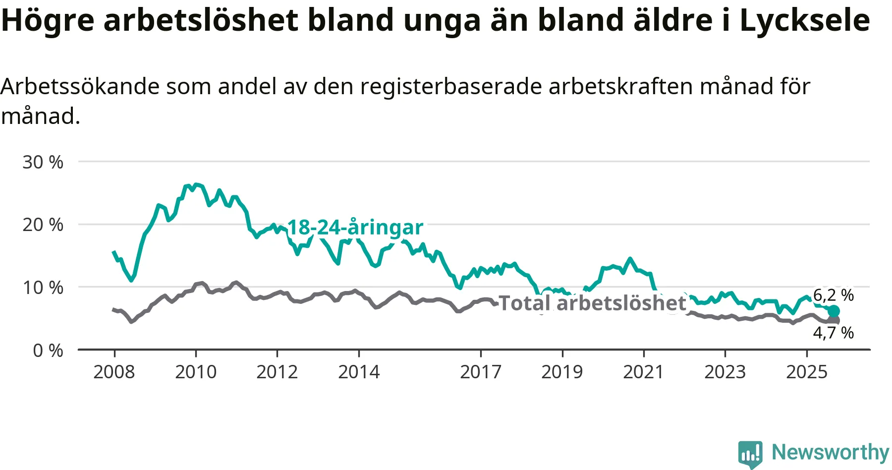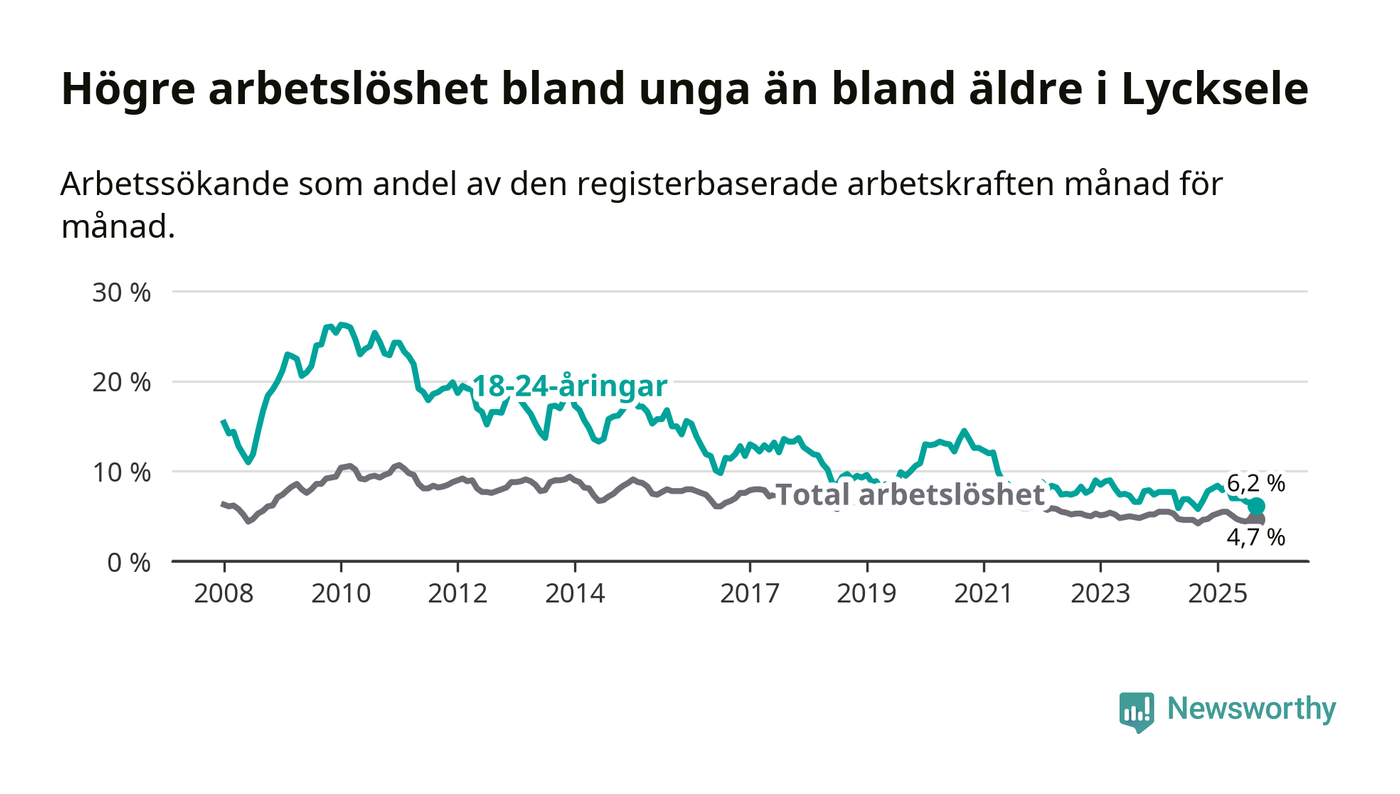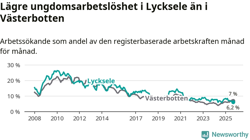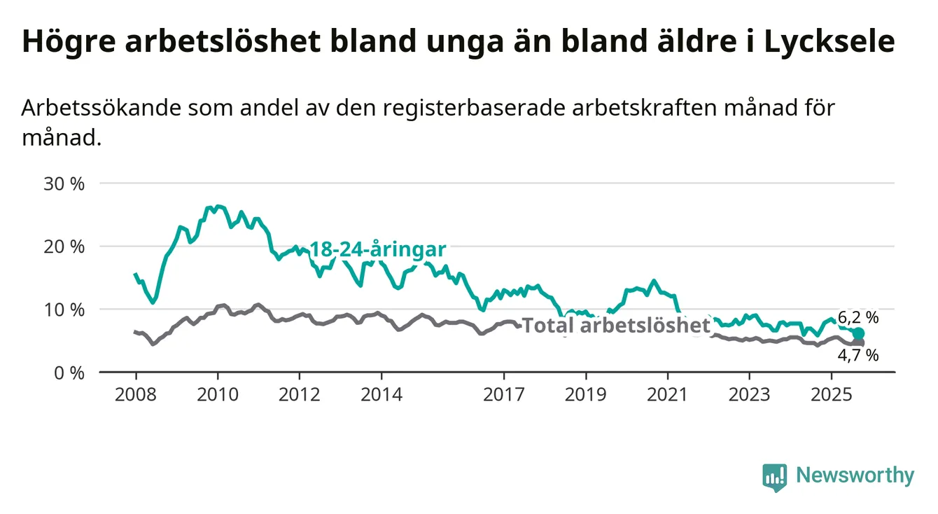Precis som den totala arbetslösheten ligger ungdomsarbetslösheten i Lycksele lägre än i Västerbotten som helhet. Skillnaden mellan kommunen och länet är 0,8 procentenheter.