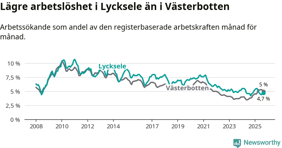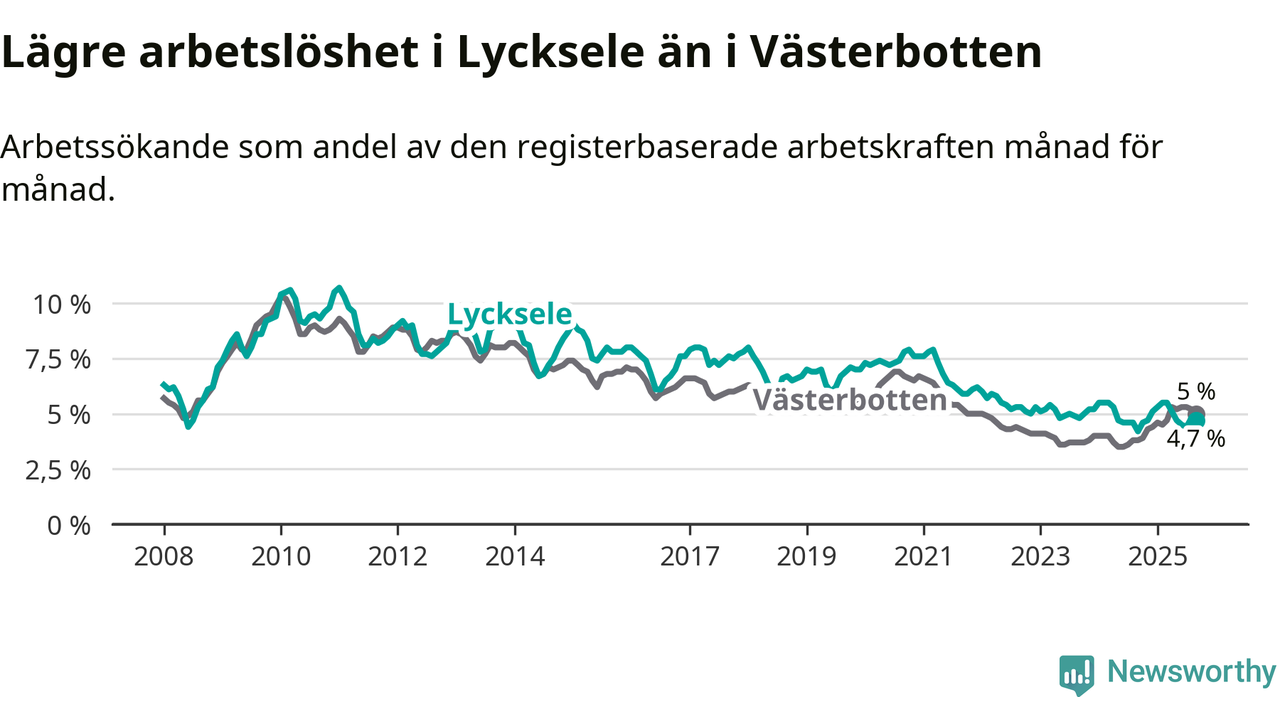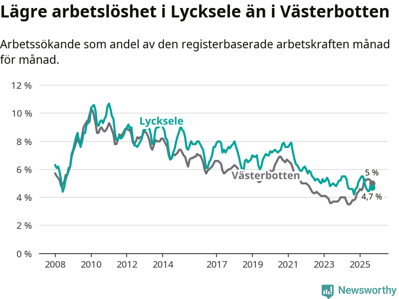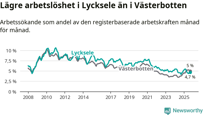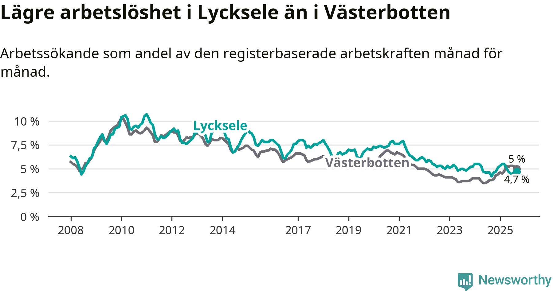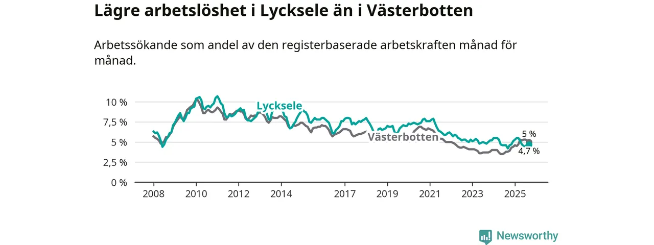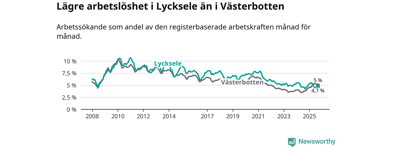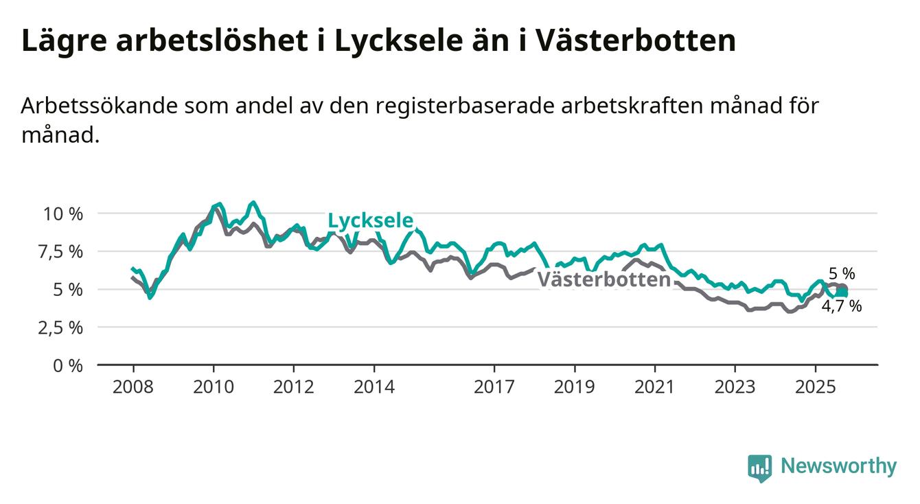 Även om arbetslösheten i Lycksele alltså ökar, så ligger den fortfarande under snittet i hela Västerbottens län (4,7 procent i kommunen, jämfört med 5,0 procent i hela länet). Vindeln har den lägsta arbetslösheten i länet (3,2 procent), medan Skellefteå har den högsta (7,0 procent). För att Lycksele skulle komma ner i samma arbetslöshetsnivå som Vindeln skulle 87 personer behöva sysselsättas.