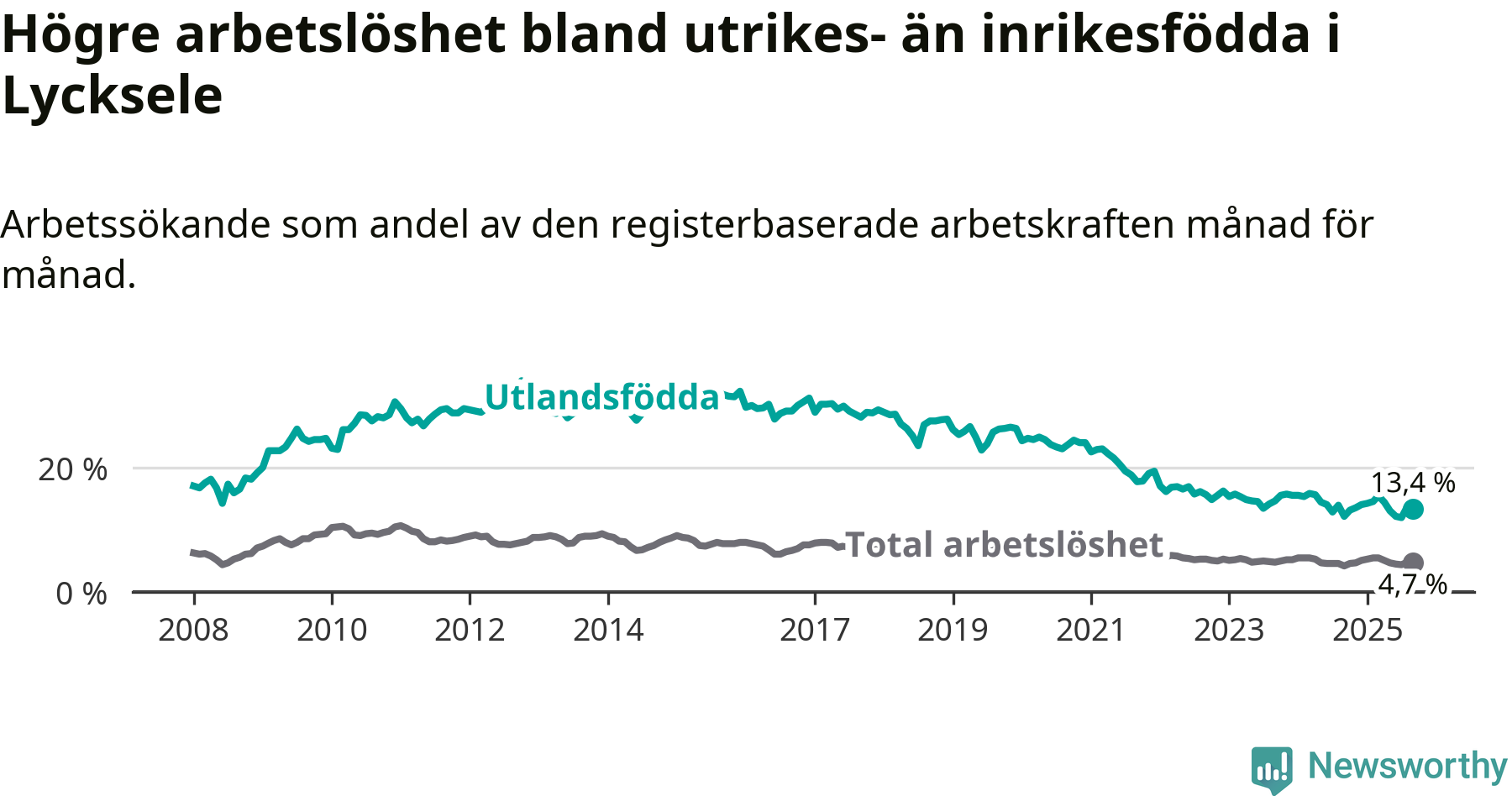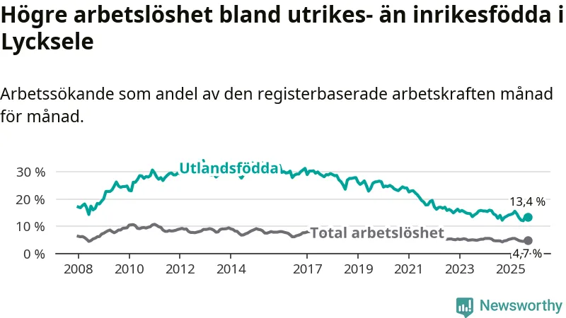 Arbetslösheten bland utlandsfödda var 13,4 procent i Lycksele under september månad, motsvarande 118 av 881 personer. Det är 1,2 procentenheter fler än vid samma tidpunkt i fjol (+14 om man räknar personer). Den senaste månadens uppgång innebär ett trendbrott. Under de 16 föregående månaderna hade arbetslösheten bland utlandsfödda varit lägre än motsvarande tidpunkt året innan.