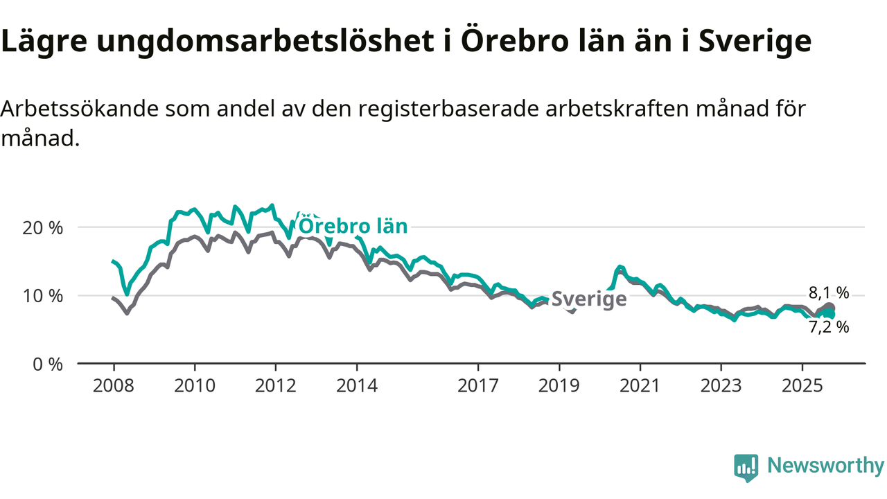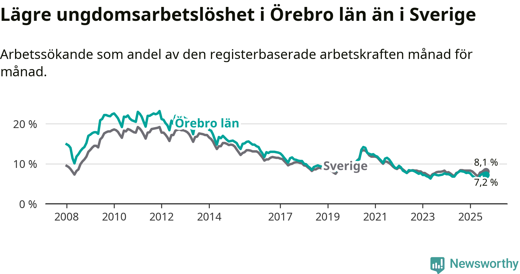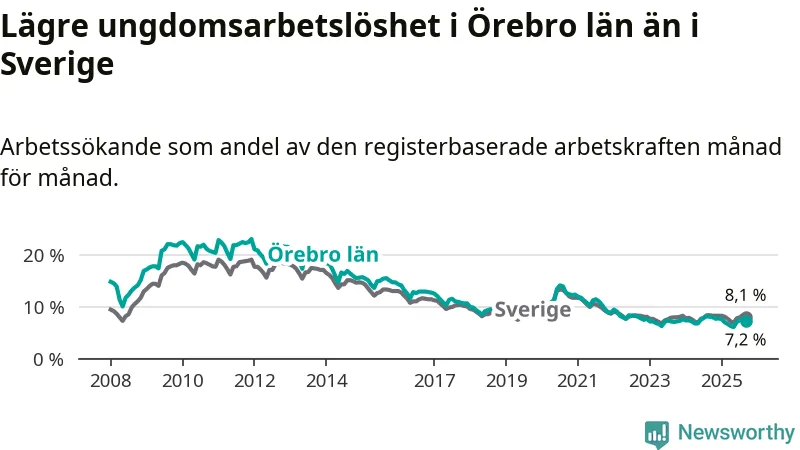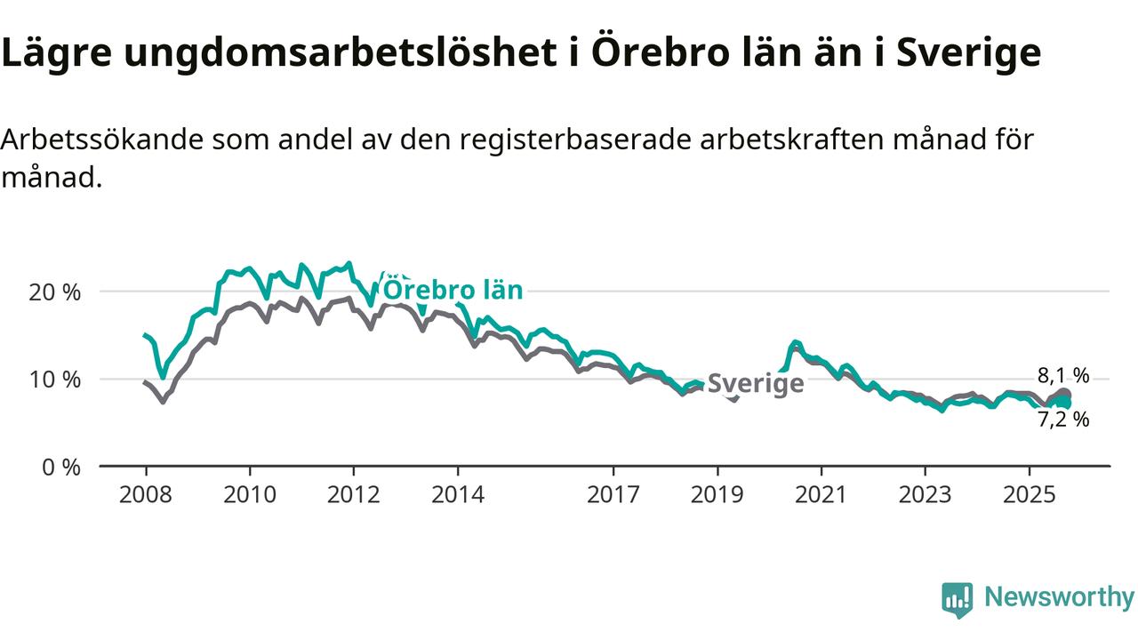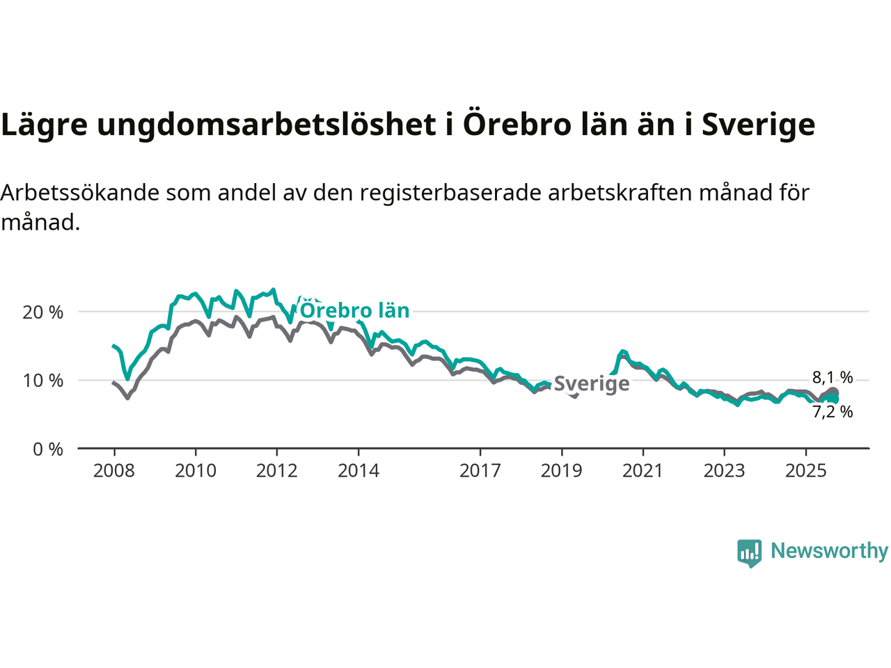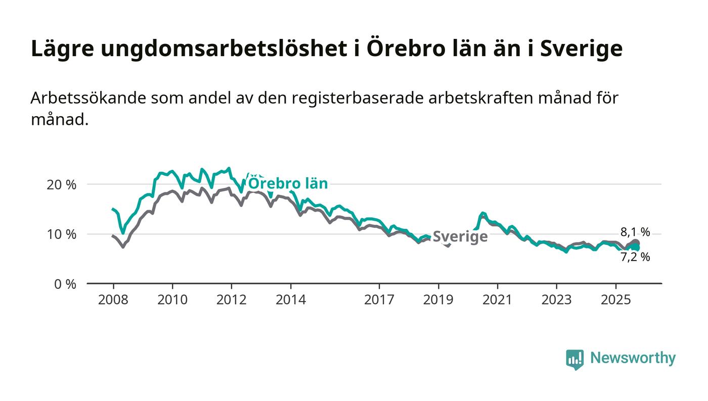 Precis som den totala arbetslösheten ligger ungdomsarbetslösheten i Örebro lägre än i Sverige som helhet. Skillnaden mellan länet och riket är 0,9 procentenheter.