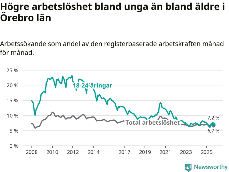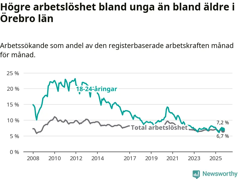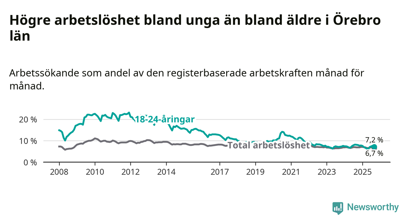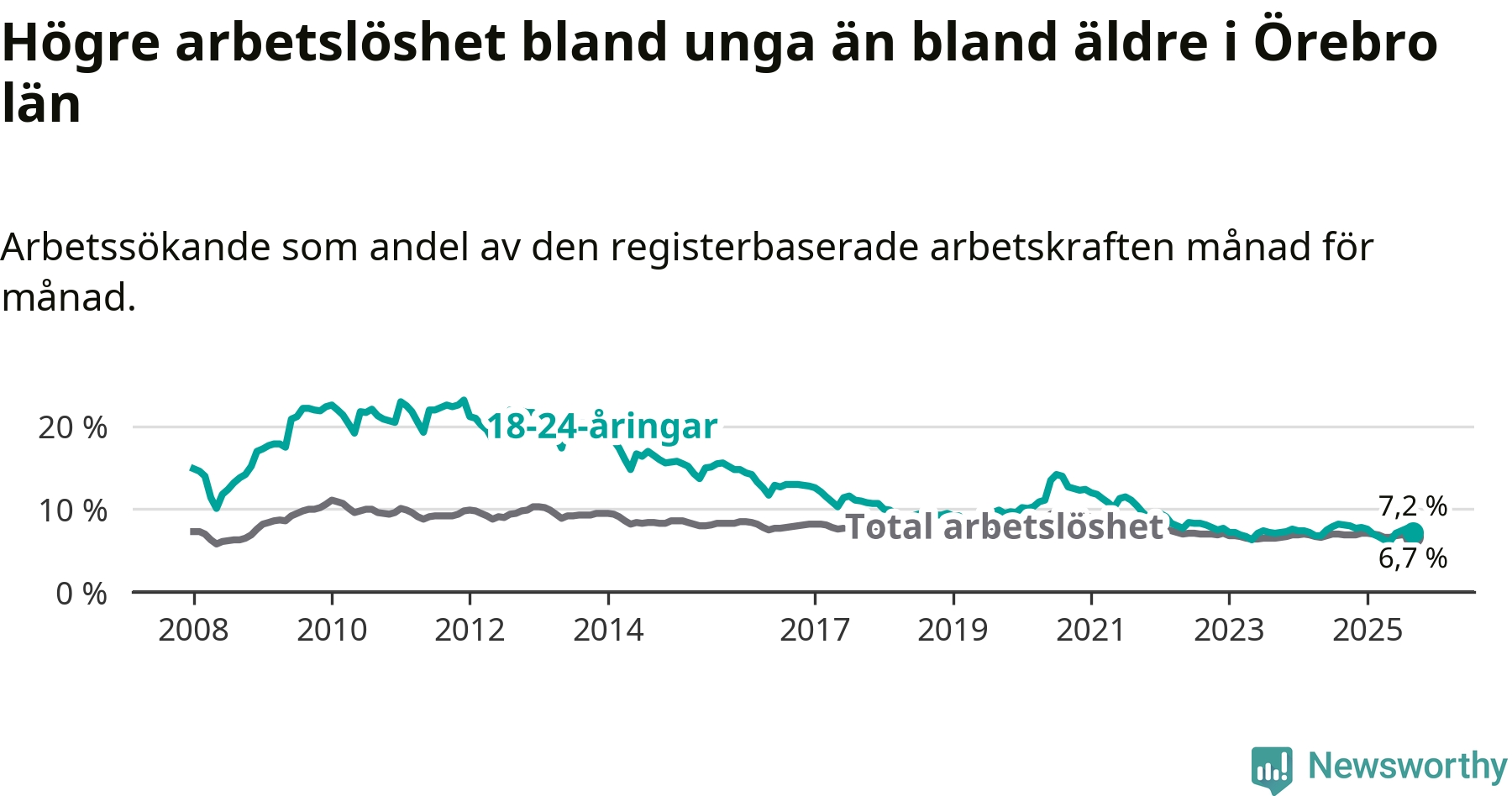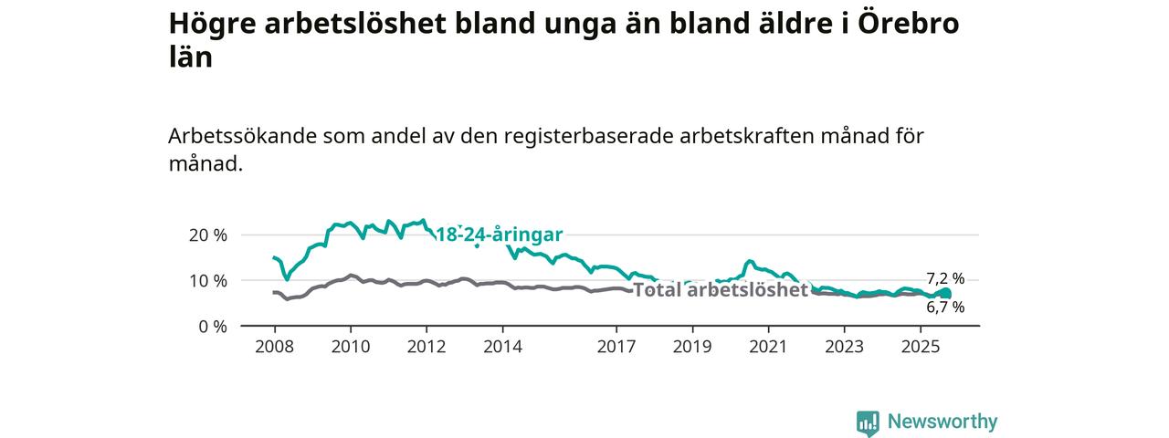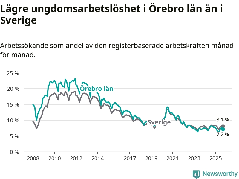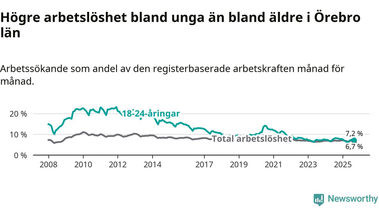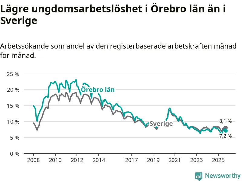 Precis som den totala arbetslösheten ligger ungdomsarbetslösheten i Örebro lägre än i Sverige som helhet. Skillnaden mellan länet och riket är 0,9 procentenheter.