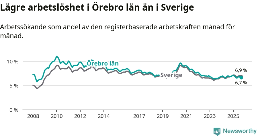 Under september månad rapporterade Örebro län en total arbetslöshet på 6,7 procent. Det är en minskning jämfört med samma tidpunkt i fjol (−0,2 procentenheter). I Sverige däremot stiger arbetslösheten något.