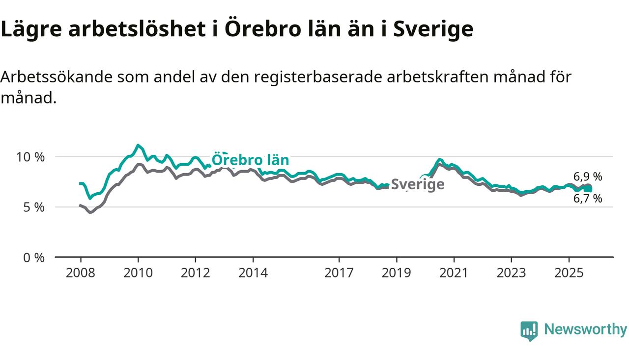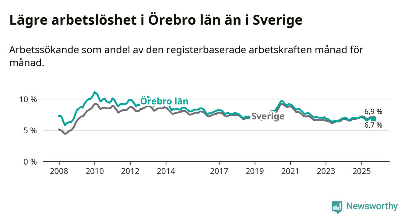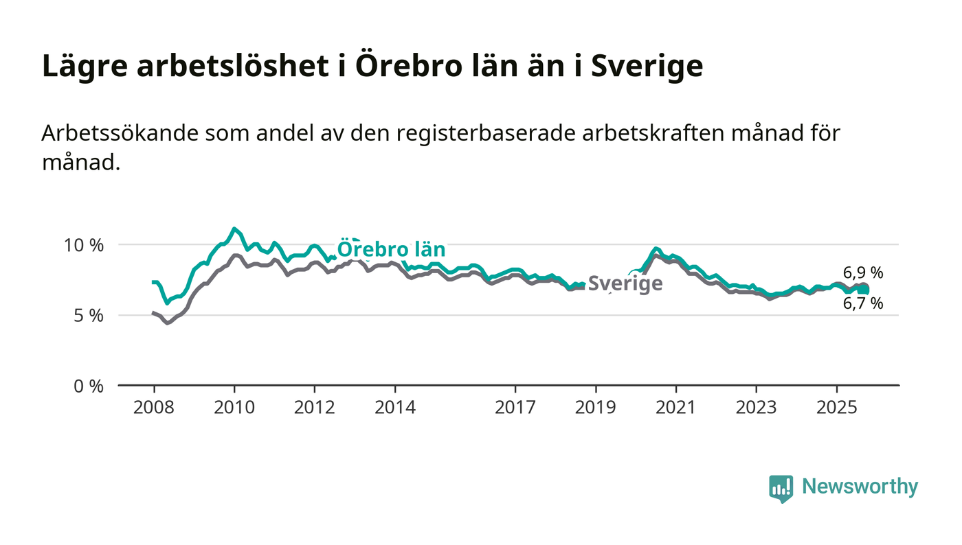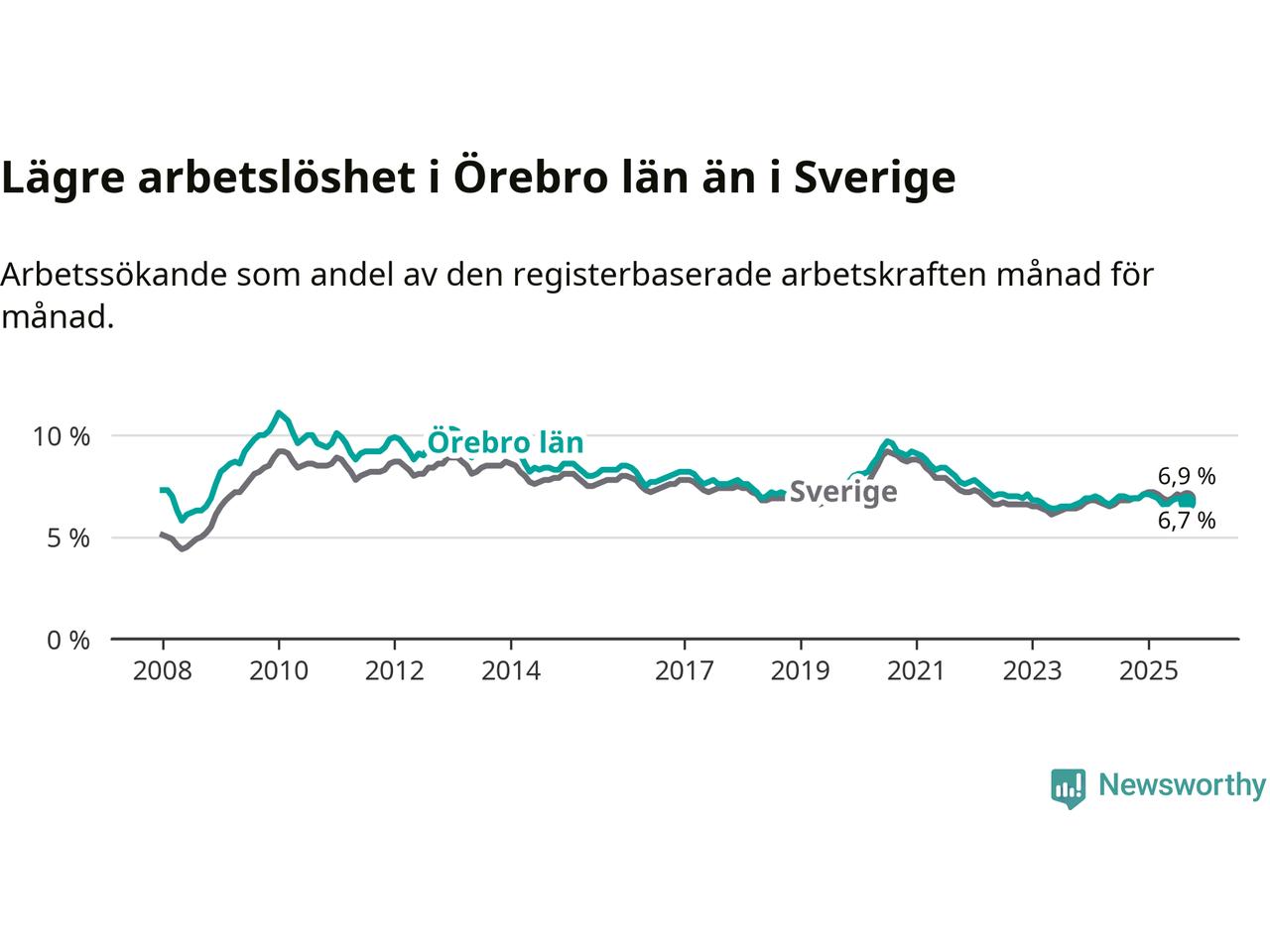Örebro hade redan tidigare lägre arbetslöshet än snittet i hela Sverige och nu växer klyftan (6,7 procent i länet, jämfört med 6,9 procent i hela riket). Norrbotten har den lägsta arbetslösheten i riket (3,8 procent), medan Skåne har den högsta (8,9 procent). För att Örebro skulle komma ner i samma arbetslöshetsnivå som Norrbotten skulle 4 376 personer behöva sysselsättas.