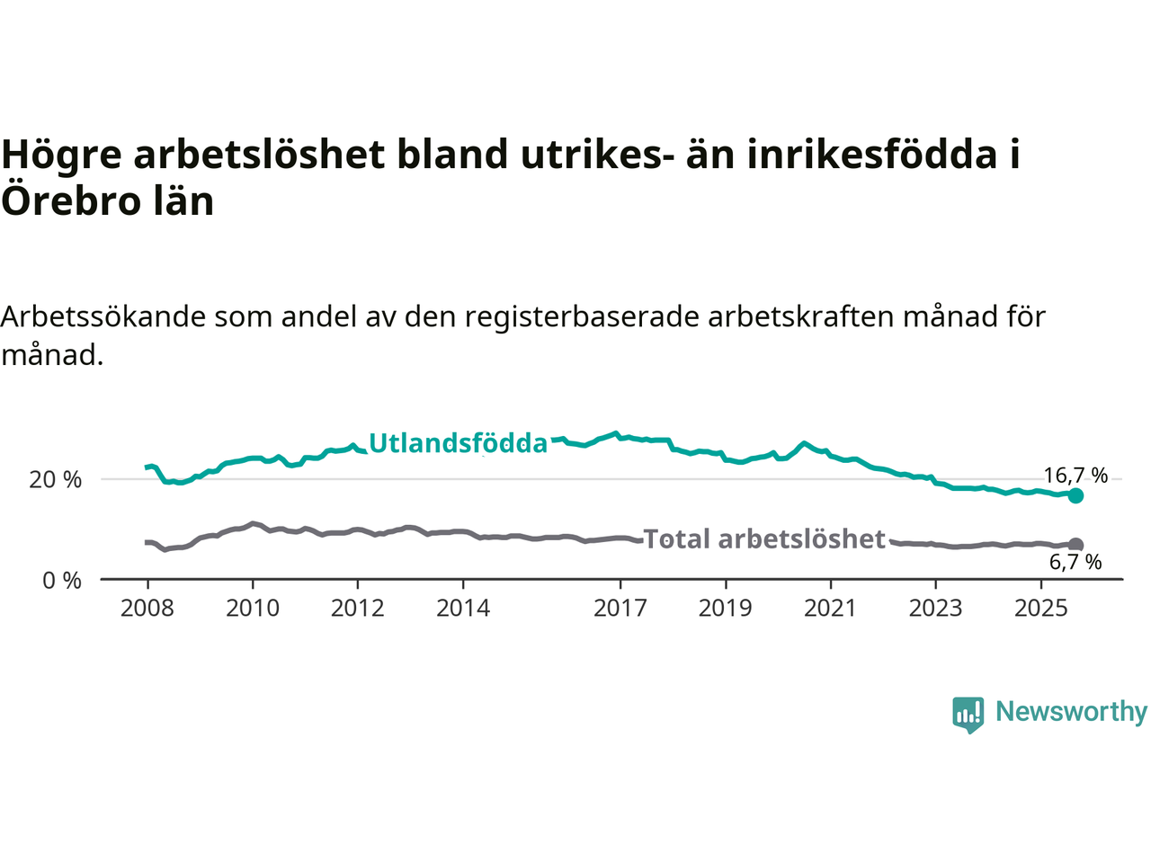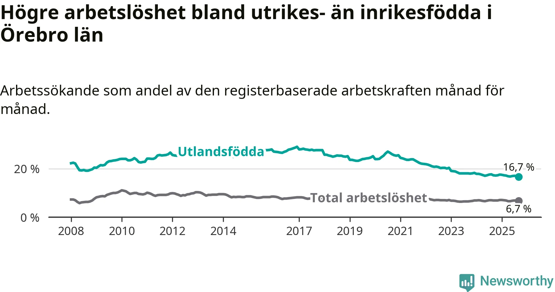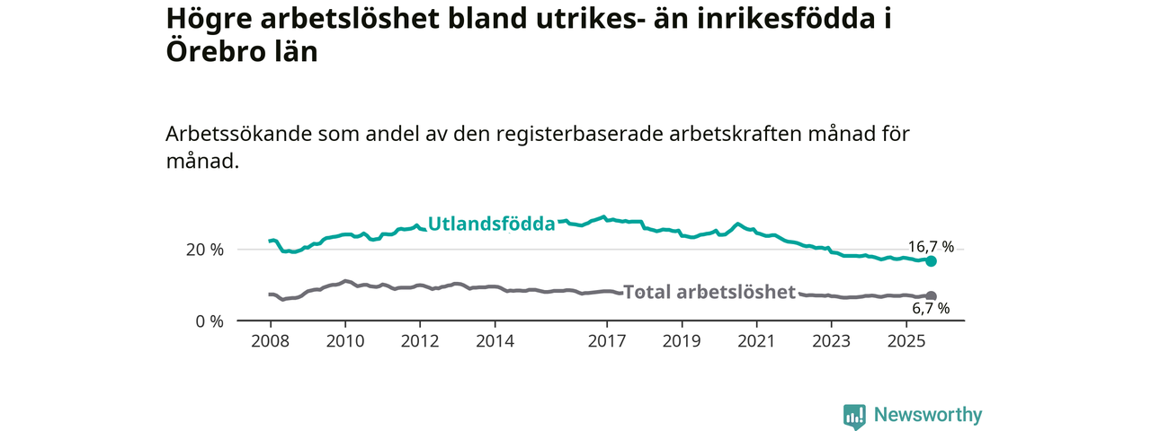 Arbetslösheten bland utlandsfödda var 16,7 procent i Örebro under september månad, motsvarande 5 302 av 31 749 personer. Det är 0,6 procentenheter färre än vid samma tidpunkt i fjol (−174 om man räknar personer). Därmed har de utlandsföddas arbetslöshet varit lägre än vid samma tidpunkt i fjol i över fyra år i sträck. Sedan februari 2021 har arbetslösheten bland utlandsfödda minskat från 24,3 till 16,7 procent. Den nuvarande arbetslöshetsnivån är den lägsta sedan januari 2008.