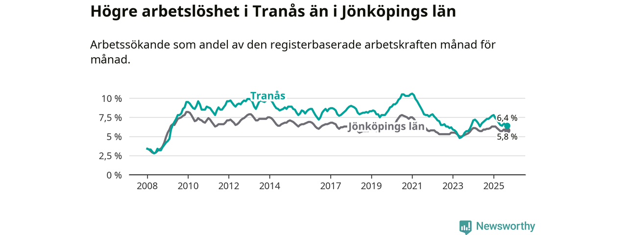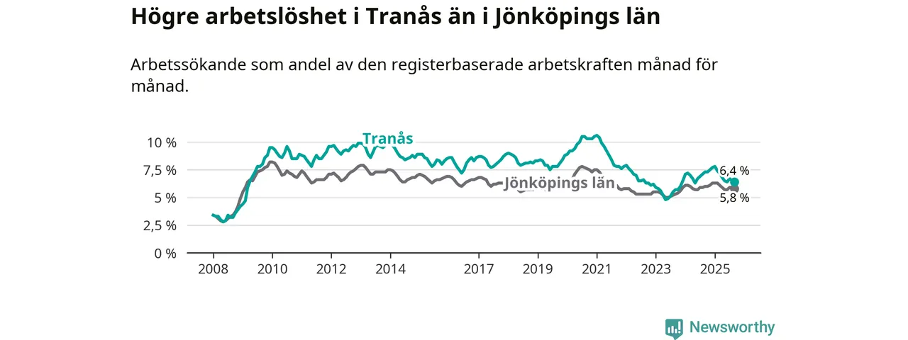 Även om arbetslösheten i Tranås alltså minskar, så ligger den fortfarande över snittet i hela Jönköpings län (6,4 procent i kommunen, jämfört med 5,8 procent i hela länet). Habo har den lägsta arbetslösheten i länet (3,6 procent), medan Nässjö har den högsta (7,7 procent). För att Tranås skulle komma ner i samma arbetslöshetsnivå som Habo skulle 245 personer behöva sysselsättas.