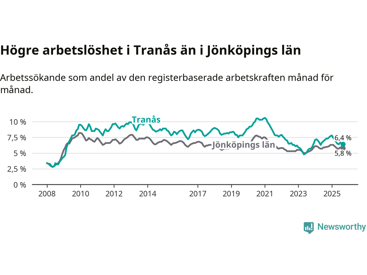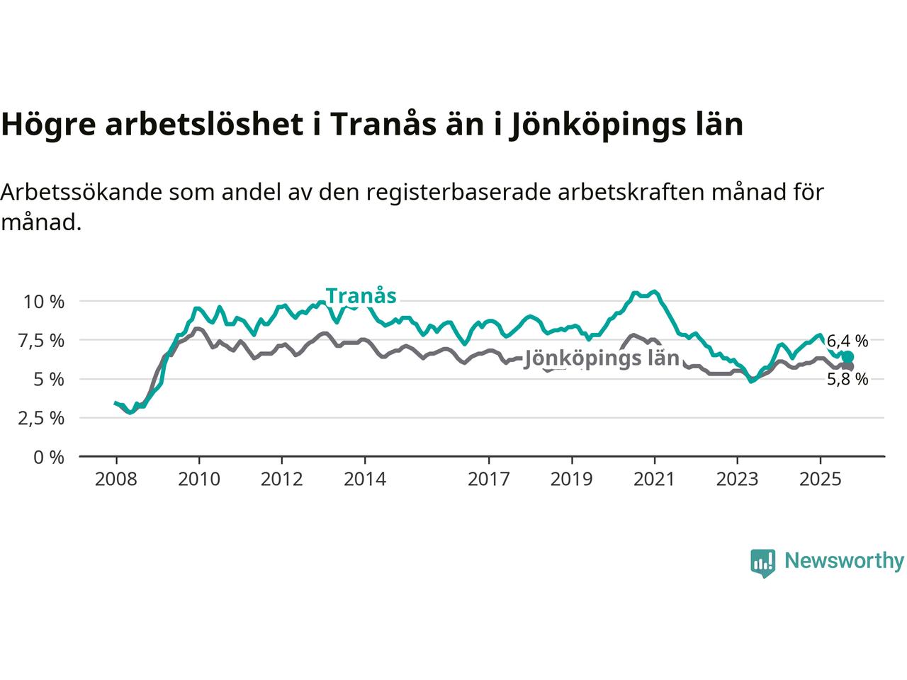 Under september månad rapporterade Tranås kommun en total arbetslöshet på 6,4 procent. Det är en minskning jämfört med samma tidpunkt i fjol (−0,9 procentenheter). Även i Jönköpings län sjunker arbetslösheten något.