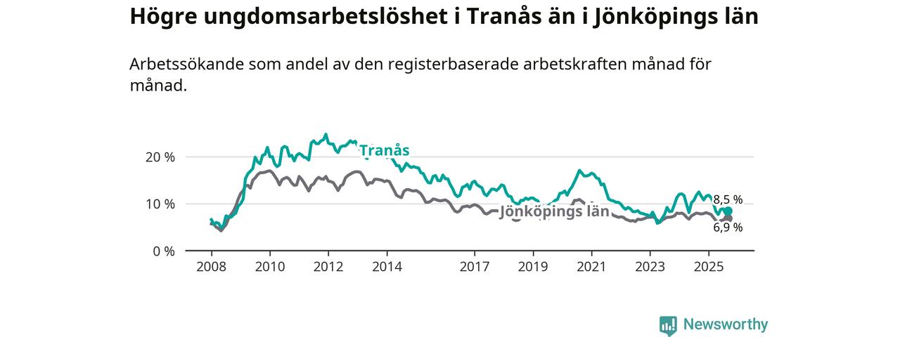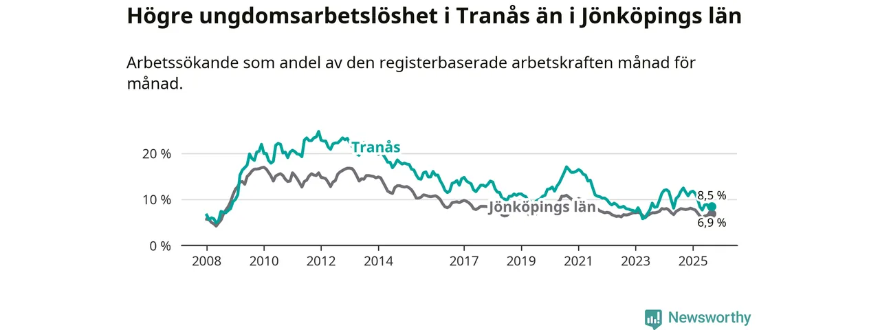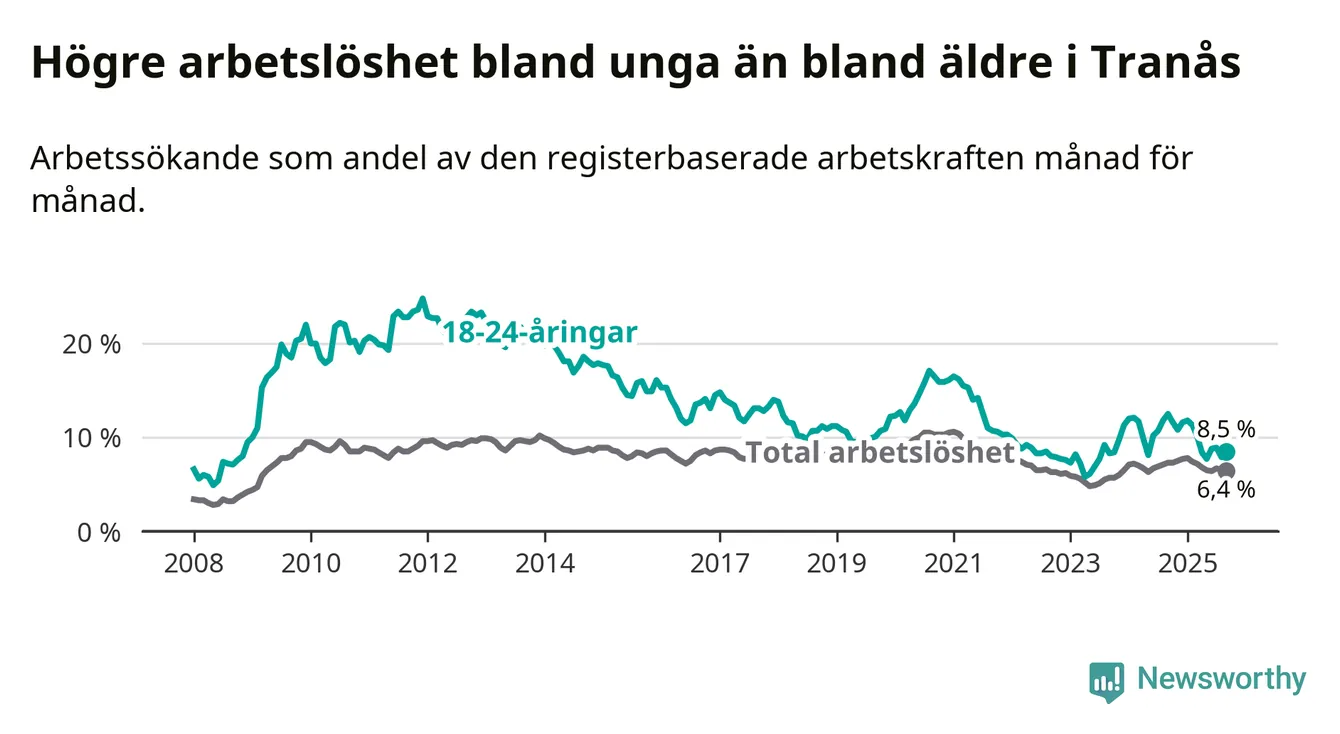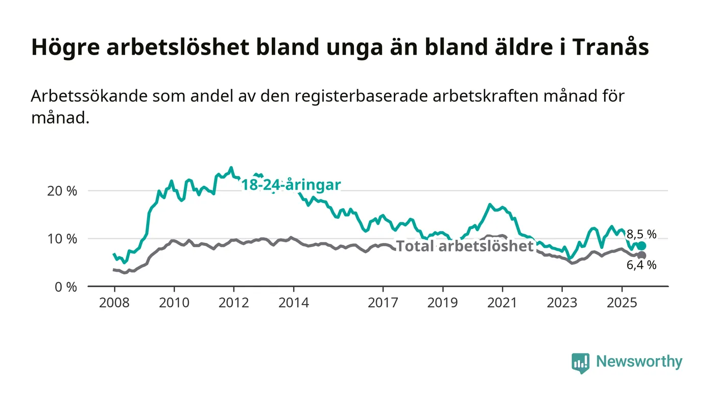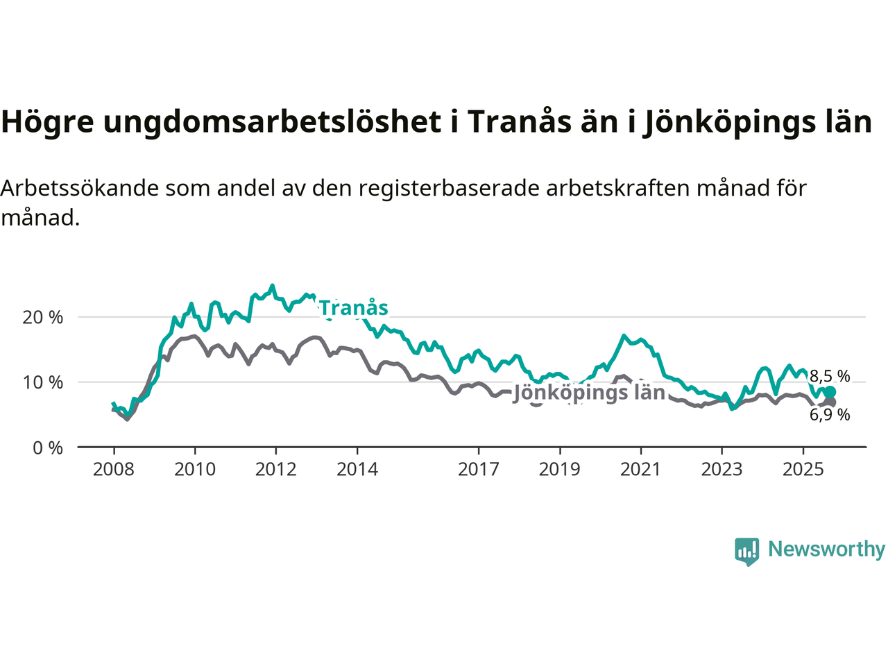 I och med den senaste månadens nedgång har de ungas arbetslöshet i Tranås sjunkit nio månader i följd (ner från 11,6 procent i december 2024 till 8,5 procent nu).