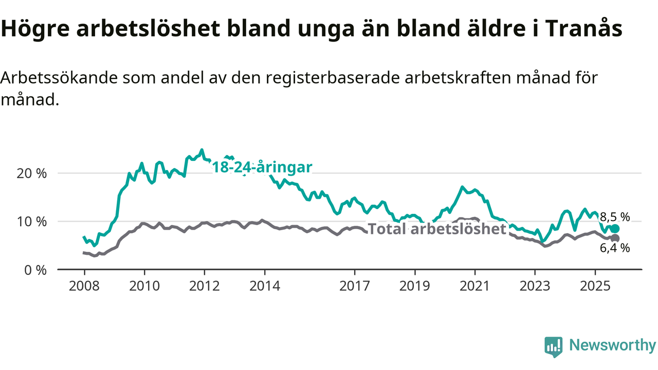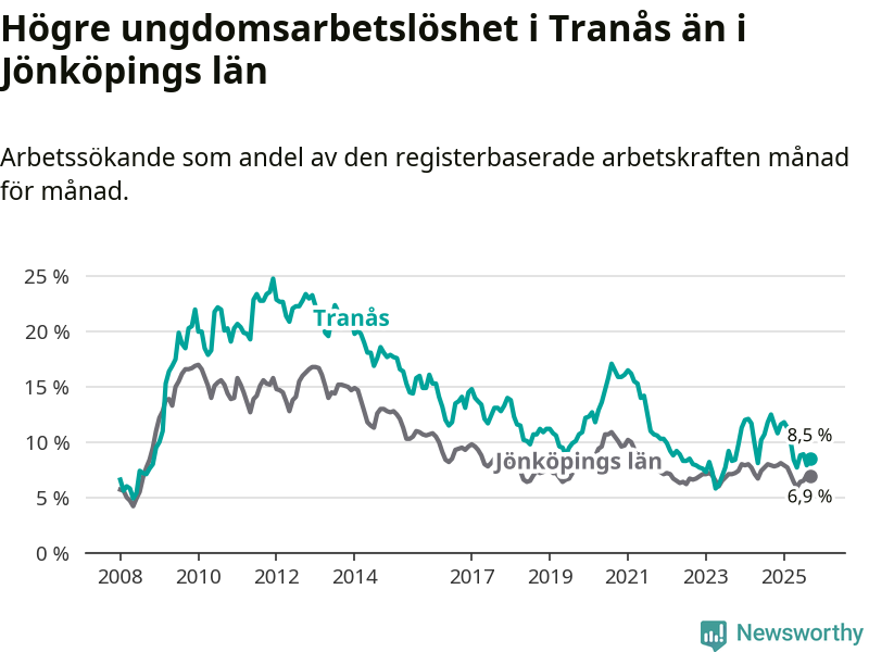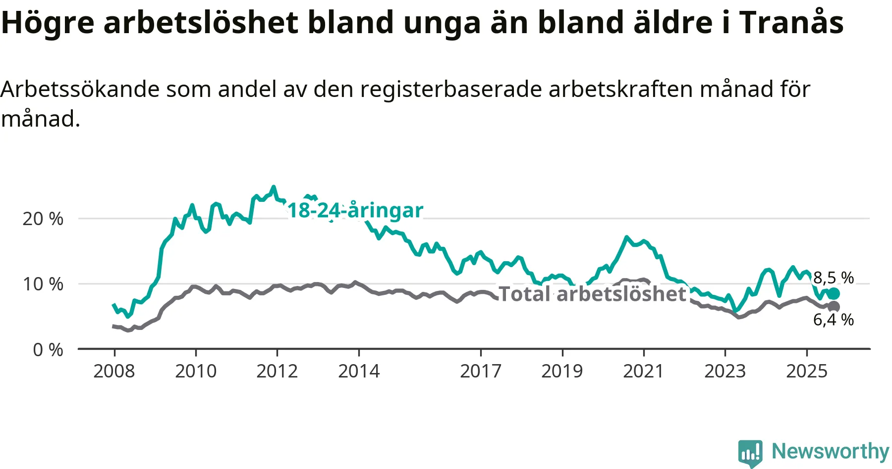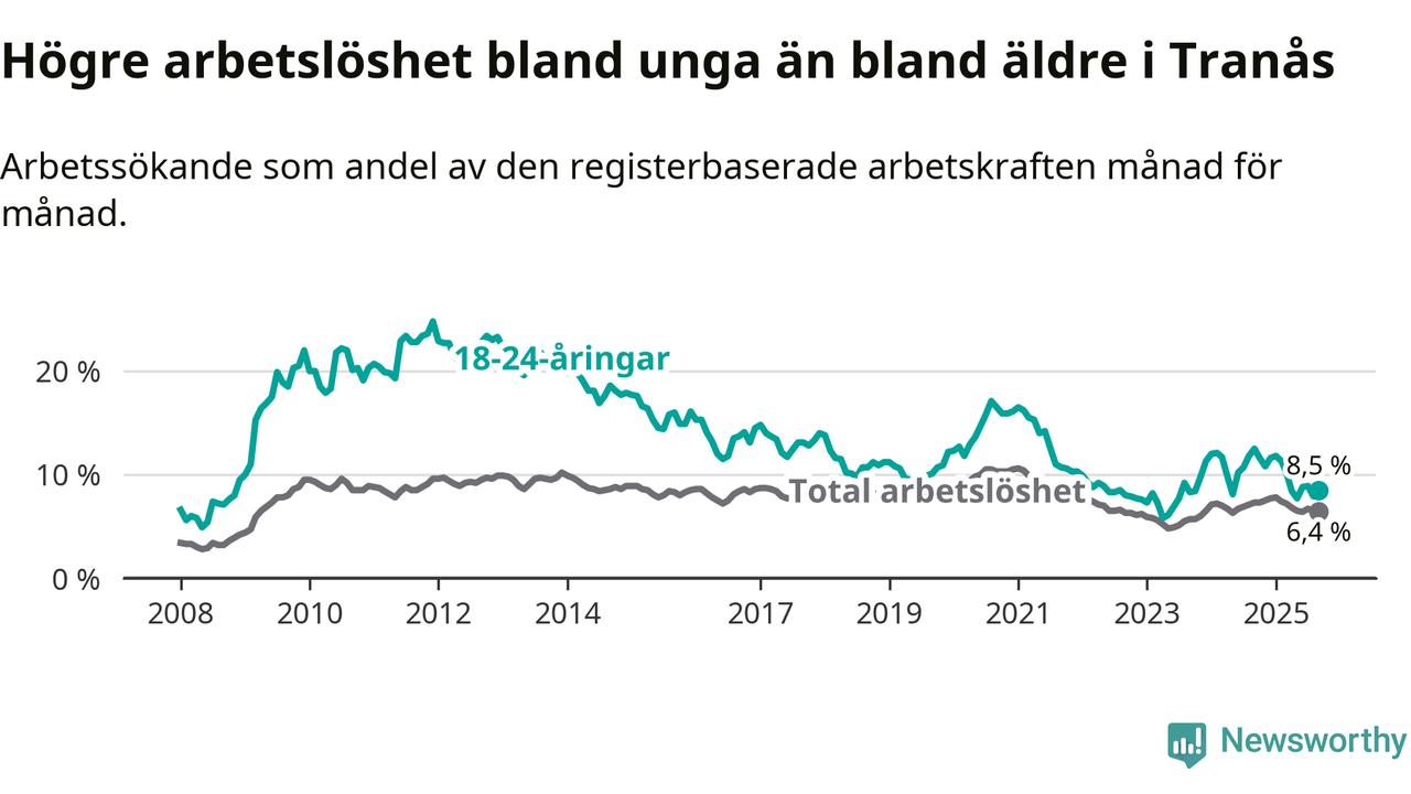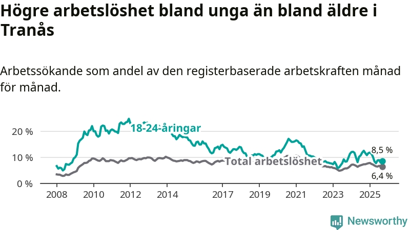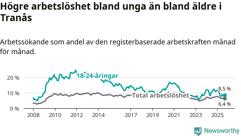 I och med den senaste månadens nedgång har de ungas arbetslöshet i Tranås sjunkit nio månader i följd (ner från 11,6 procent i december 2024 till 8,5 procent nu).