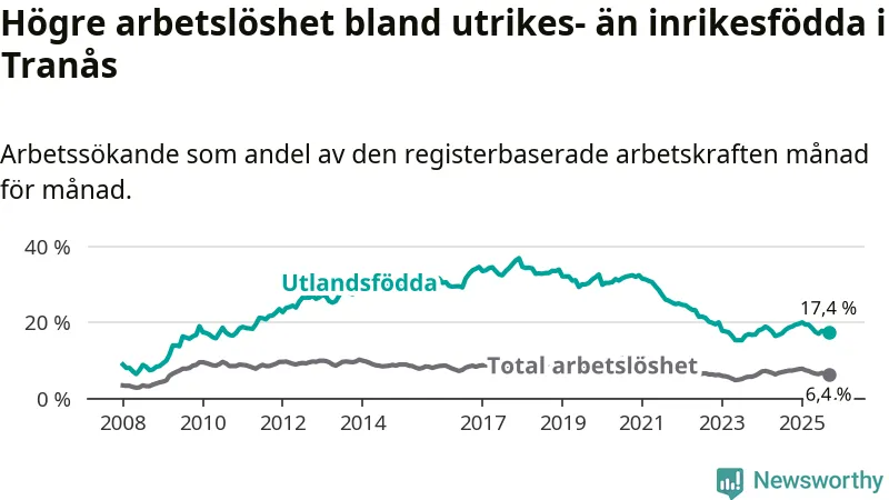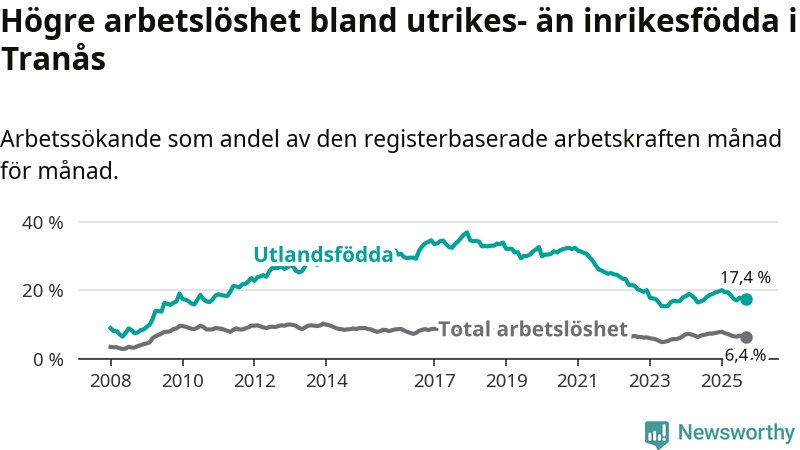 Arbetslösheten bland utlandsfödda var 17,4 procent i Tranås under september månad, motsvarande 308 av 1 770 personer. Det är 1,2 procentenheter färre än vid samma tidpunkt i fjol (−28 om man räknar personer).