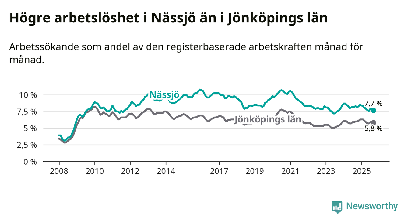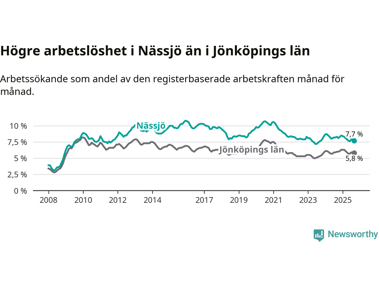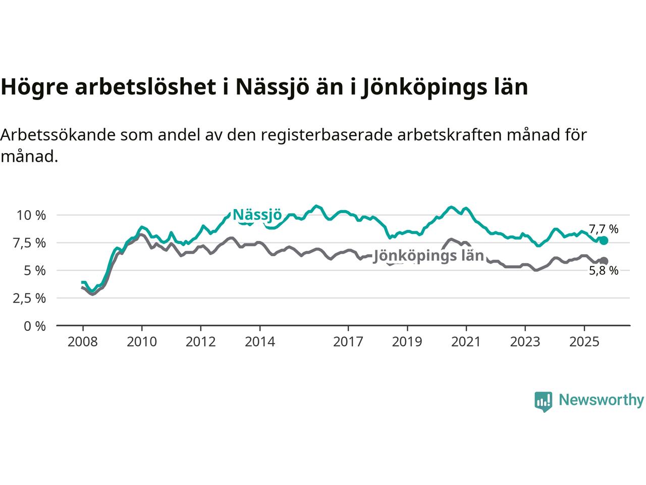 Under september månad rapporterade Nässjö kommun en total arbetslöshet på 7,7 procent. Det är en minskning jämfört med samma tidpunkt i fjol (−0,6 procentenheter). Även i Jönköpings län sjunker arbetslösheten något.