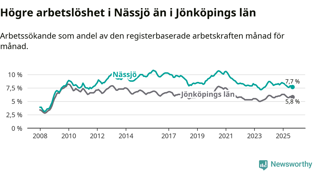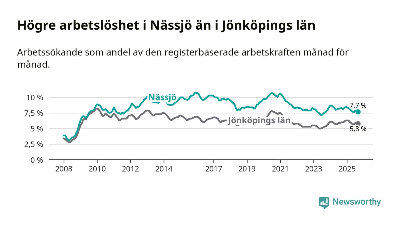 Även om arbetslösheten i Nässjö alltså minskar, så ligger den fortfarande över snittet i hela Jönköpings län (7,7 procent i kommunen, jämfört med 5,8 procent i hela länet). Nässjö har därmed även den högsta arbetslöshetsnivån i länet. Habo har den lägsta (3,6 procent). För att Nässjö skulle komma ner i samma arbetslöshetsnivå som Habo skulle 627 personer behöva sysselsättas.