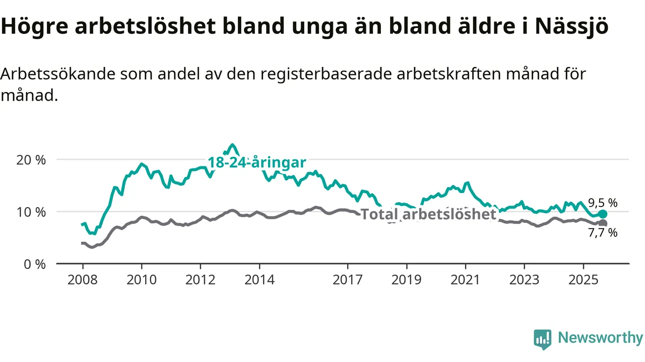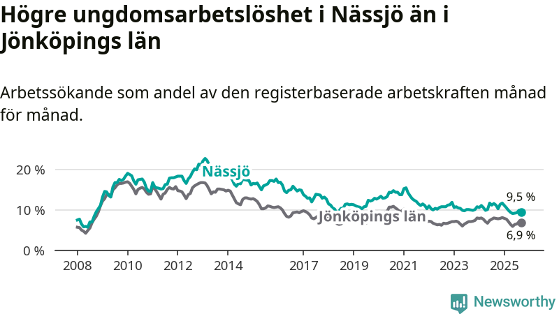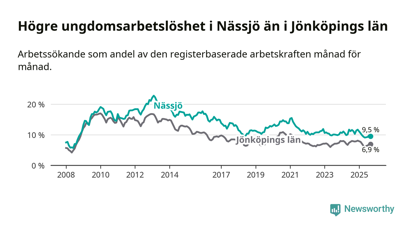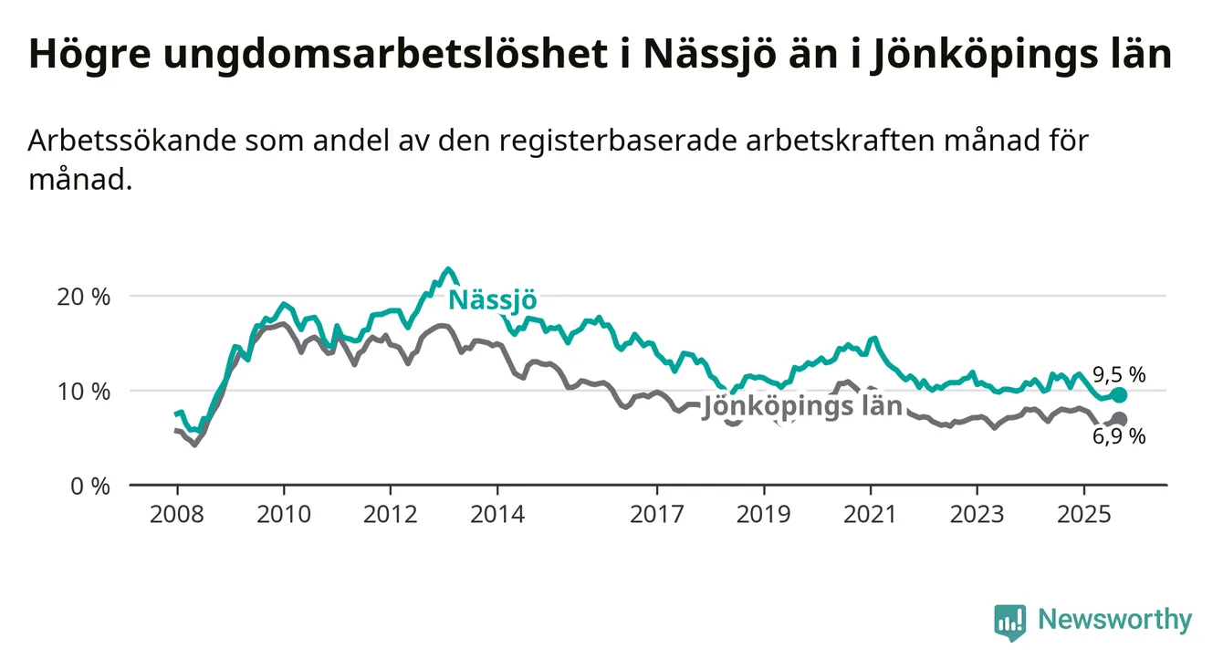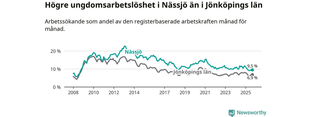 Precis som den totala arbetslösheten ligger ungdomsarbetslösheten i Nässjö högre än i Jönköpings län som helhet. Skillnaden mellan kommunen och länet är 2,6 procentenheter.