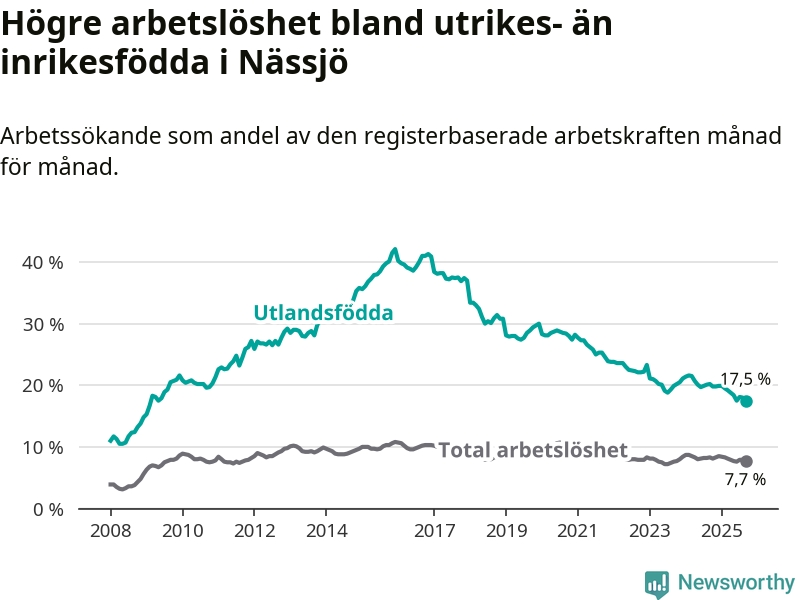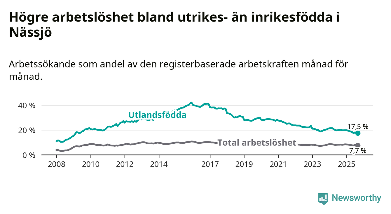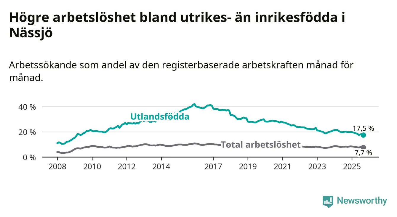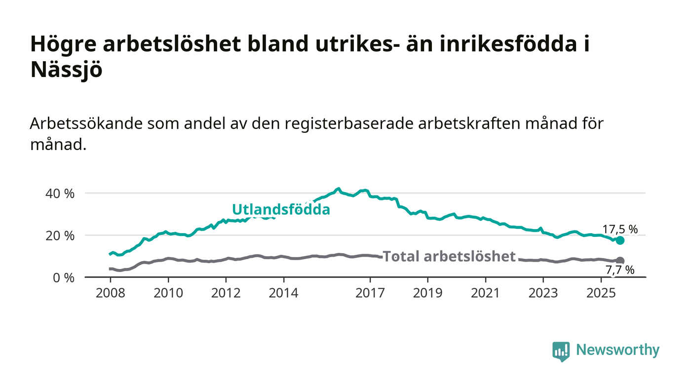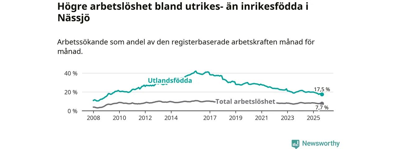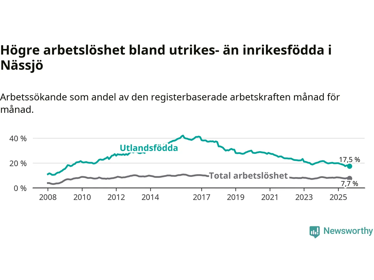 Arbetslösheten bland utlandsfödda var 17,5 procent i Nässjö under september månad, motsvarande 694 av 3 966 personer. Det är 2,7 procentenheter färre än vid samma tidpunkt i fjol (−106 om man räknar personer). Därmed är de utlandsföddas arbetslöshet lägre än vid samma tidpunkt i fjol för tolfte månaden i följd. Sedan september 2024 har arbetslösheten bland utlandsfödda minskat från 20,2 till 17,5 procent.