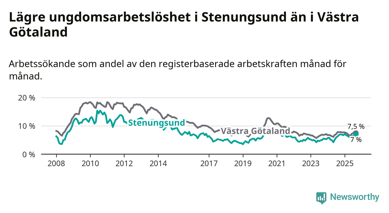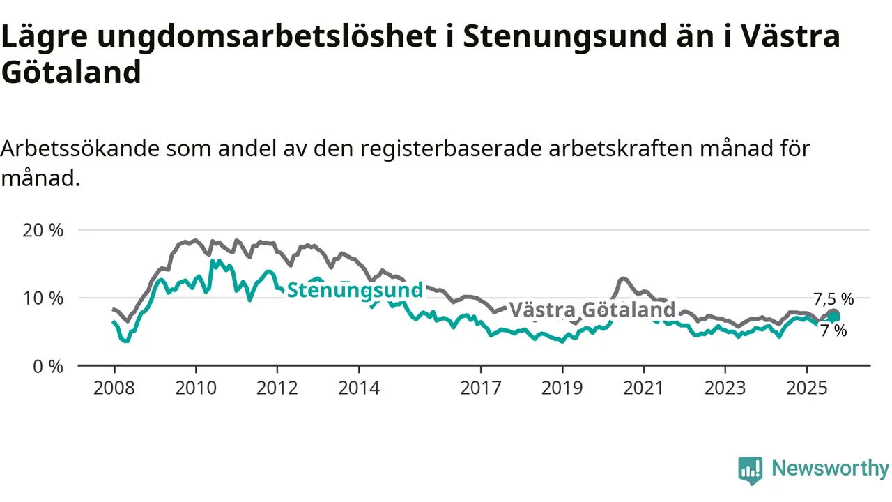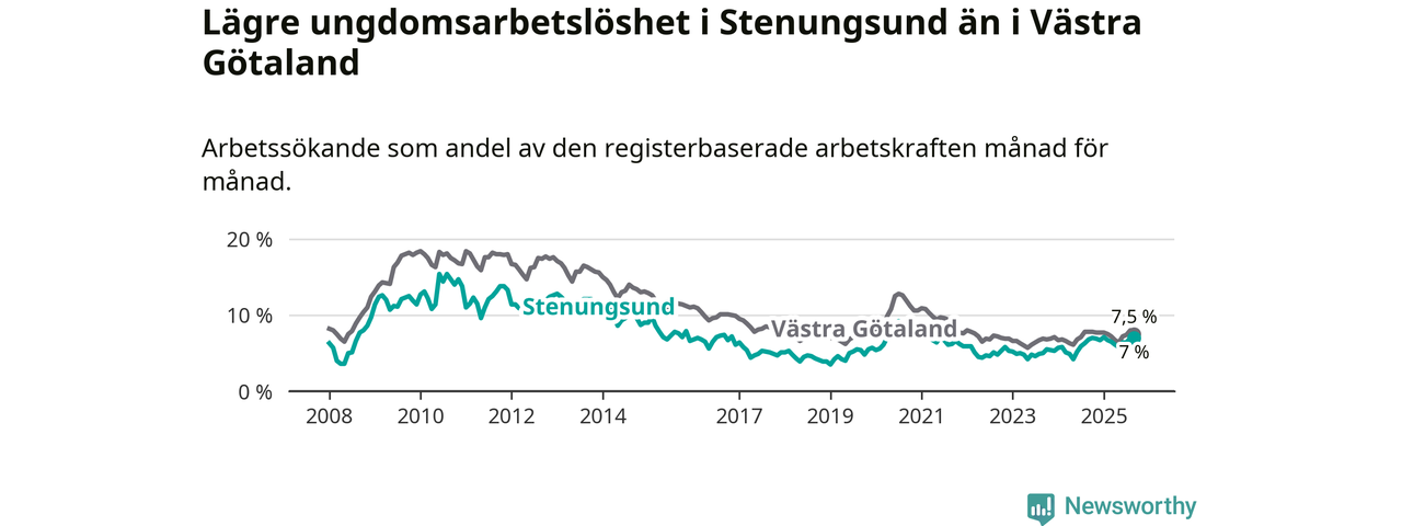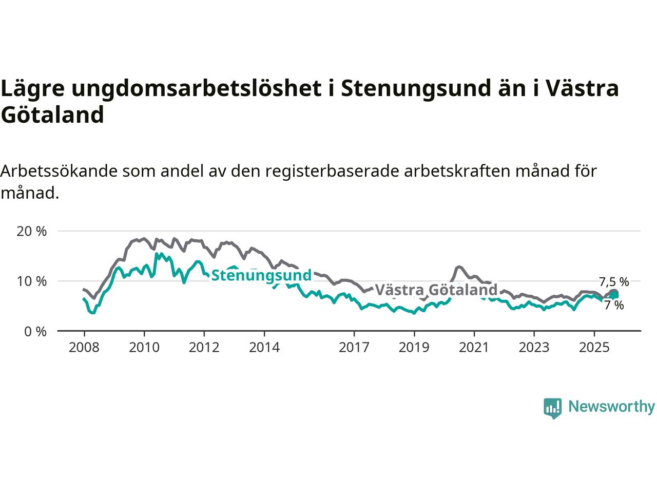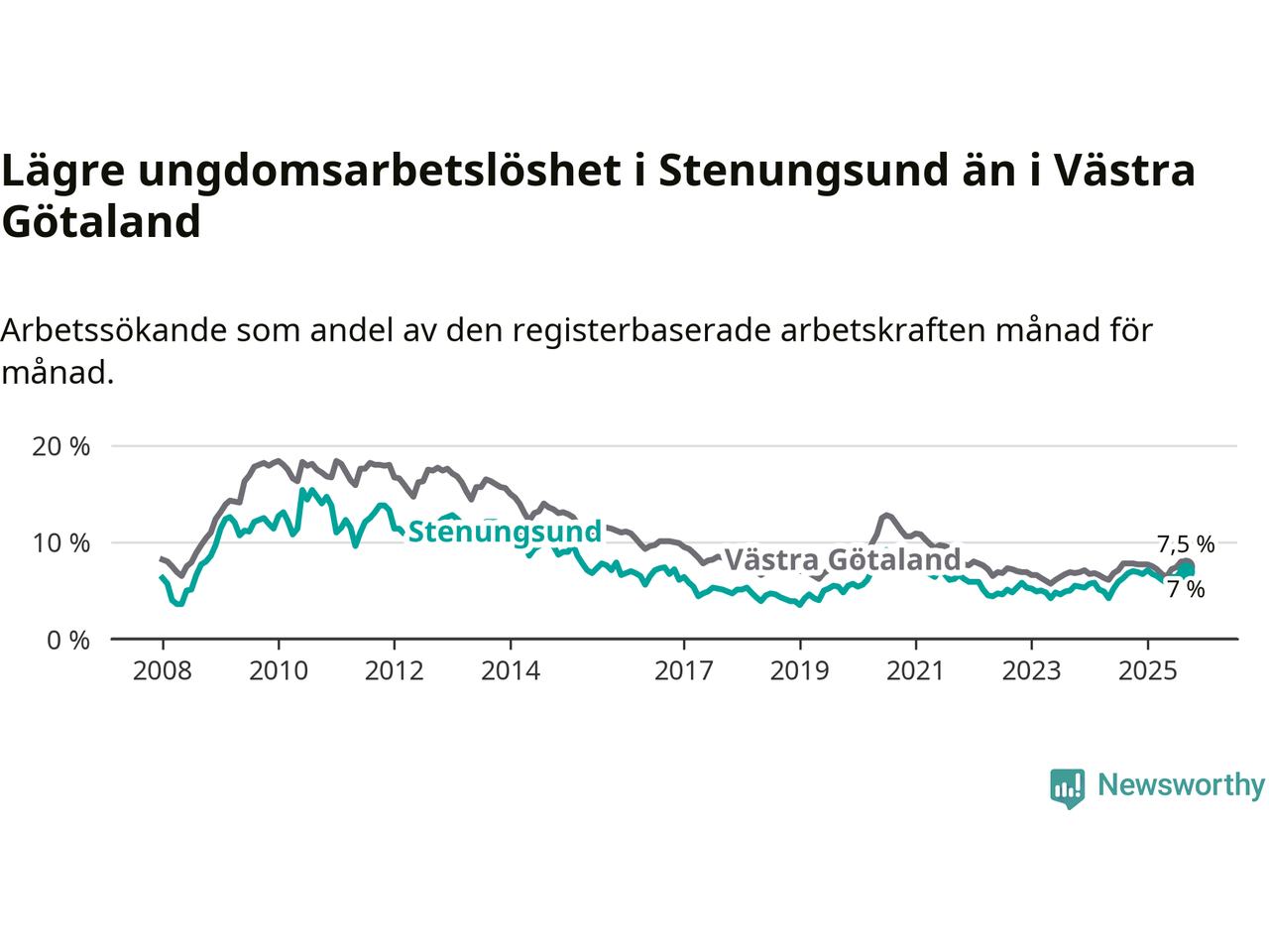 Precis som den totala arbetslösheten ligger ungdomsarbetslösheten i Stenungsund lägre än i Västra Götaland som helhet. Skillnaden mellan kommunen och länet är 0,5 procentenheter.