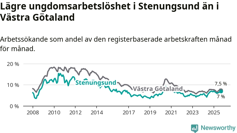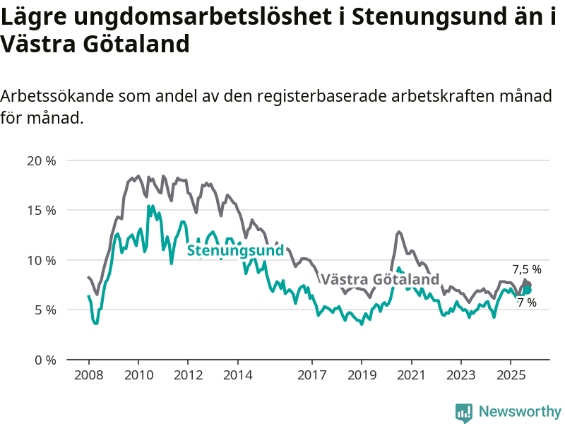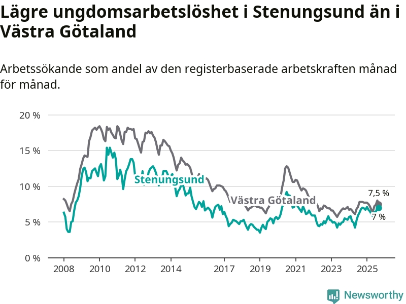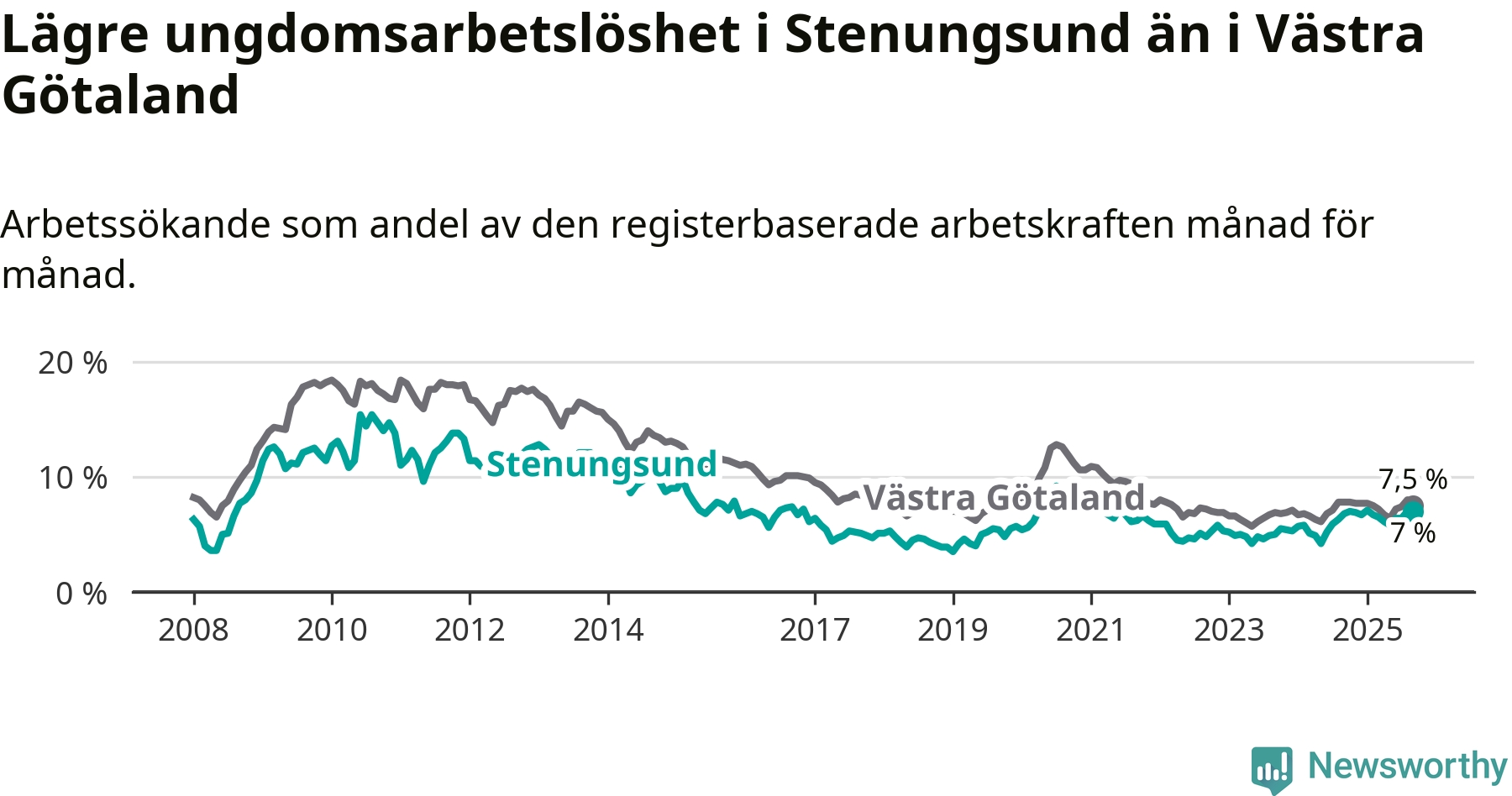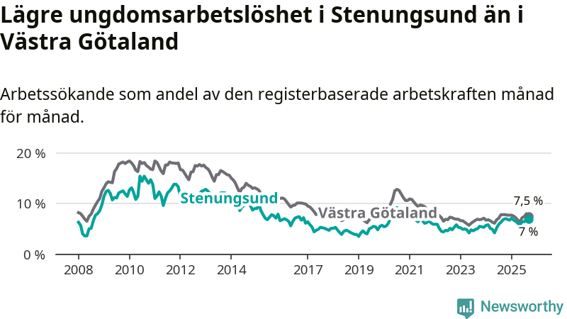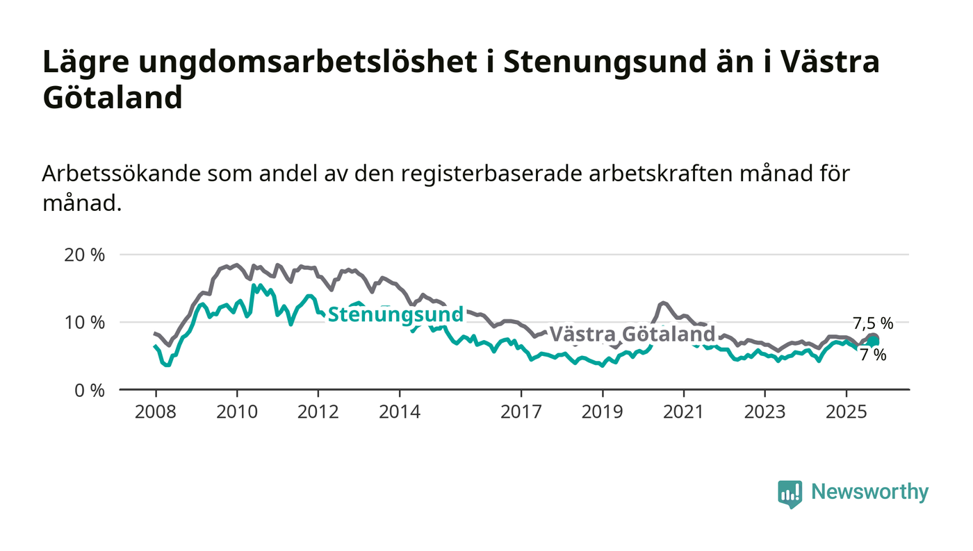 Precis som den totala arbetslösheten ligger ungdomsarbetslösheten i Stenungsund lägre än i Västra Götaland som helhet. Skillnaden mellan kommunen och länet är 0,5 procentenheter.