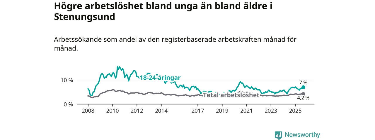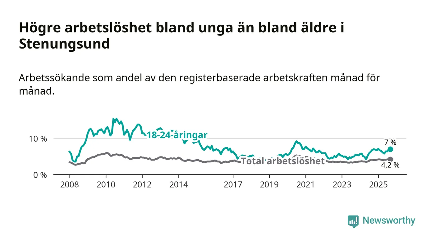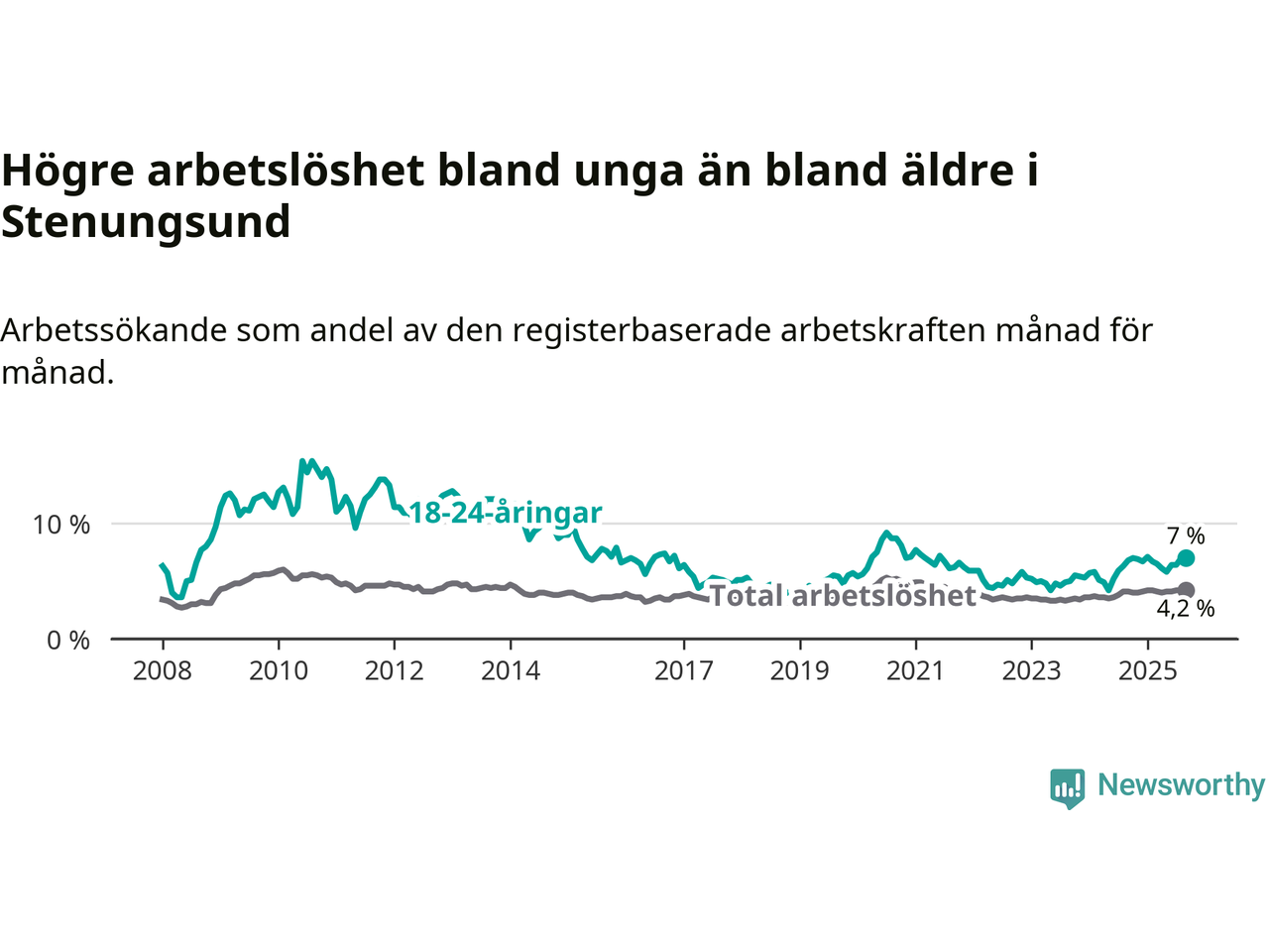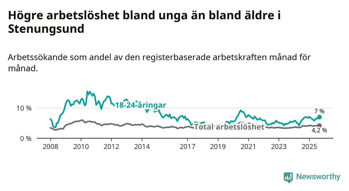 I och med den senaste månadens uppgång har de ungas arbetslöshet i Stenungsund stigit 16 månader i följd (upp från 4,2 procent i maj 2024 till 7,0 procent nu).