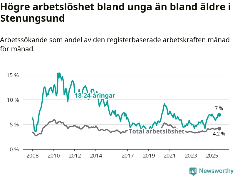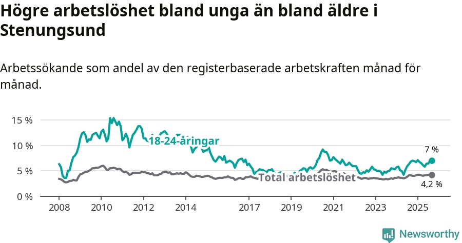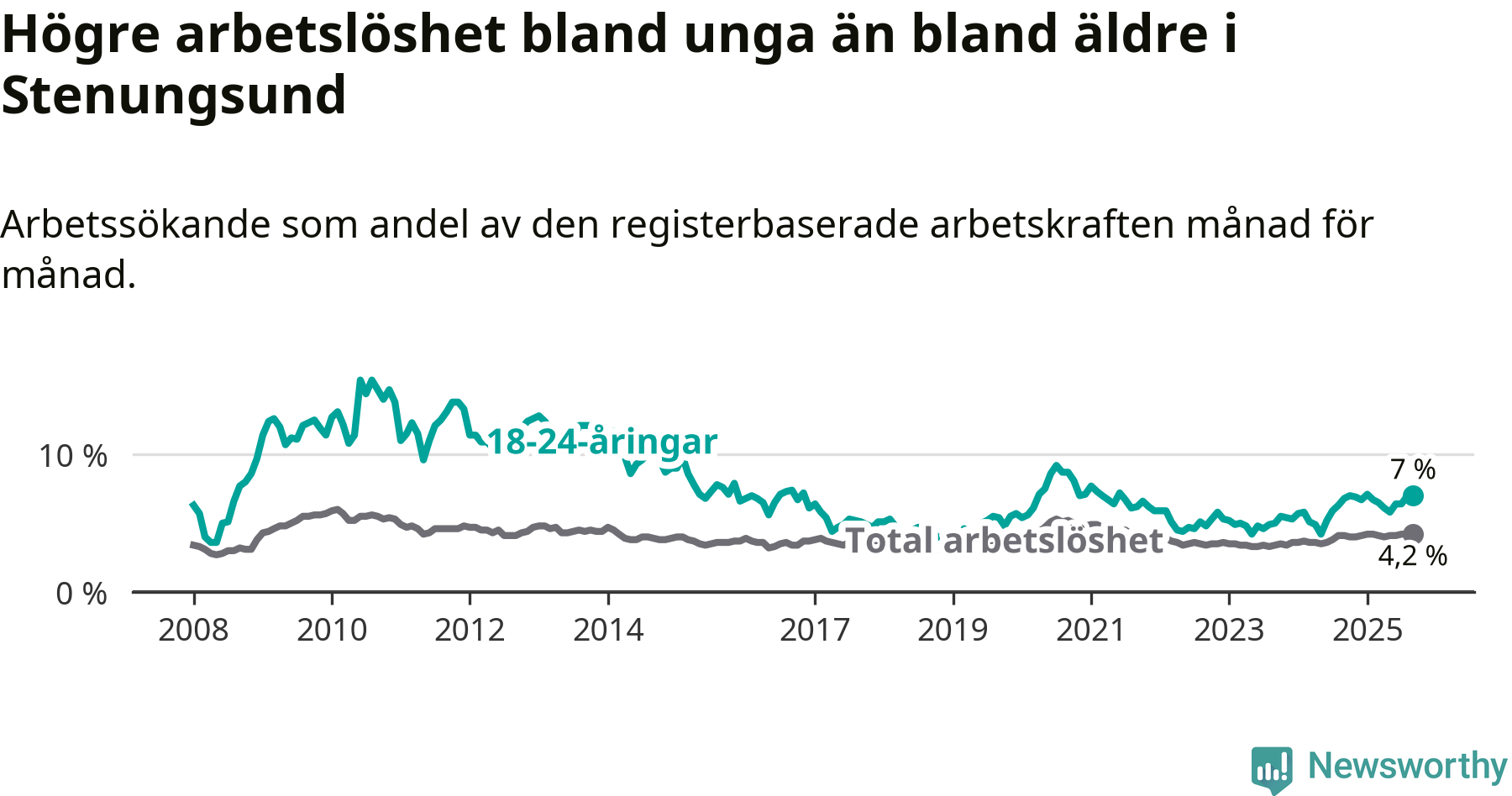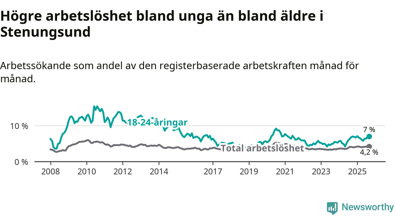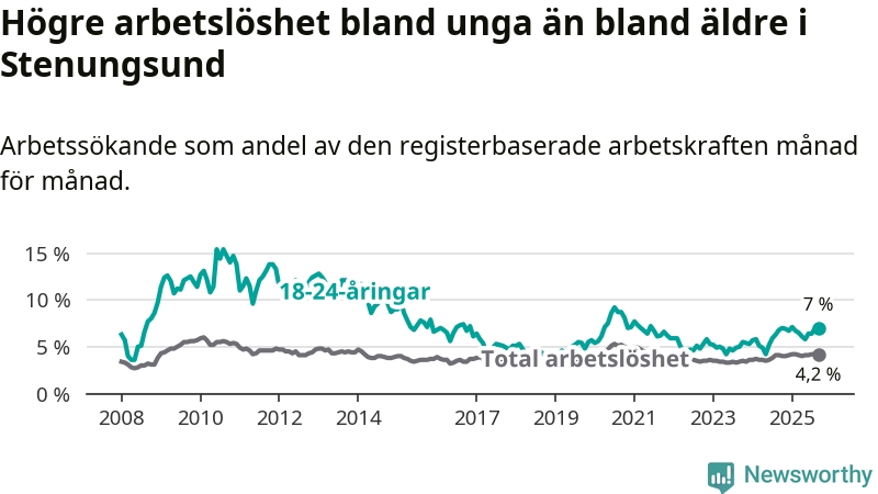I och med den senaste månadens uppgång har de ungas arbetslöshet i Stenungsund stigit 16 månader i följd (upp från 4,2 procent i maj 2024 till 7,0 procent nu).