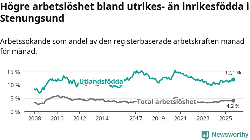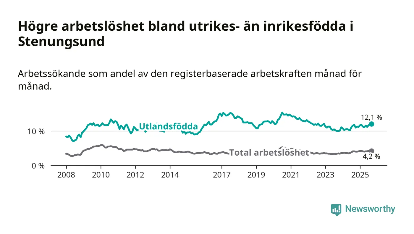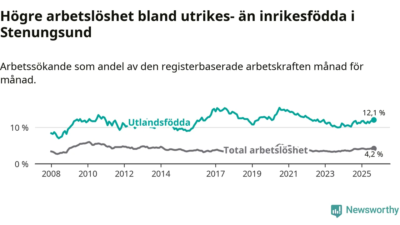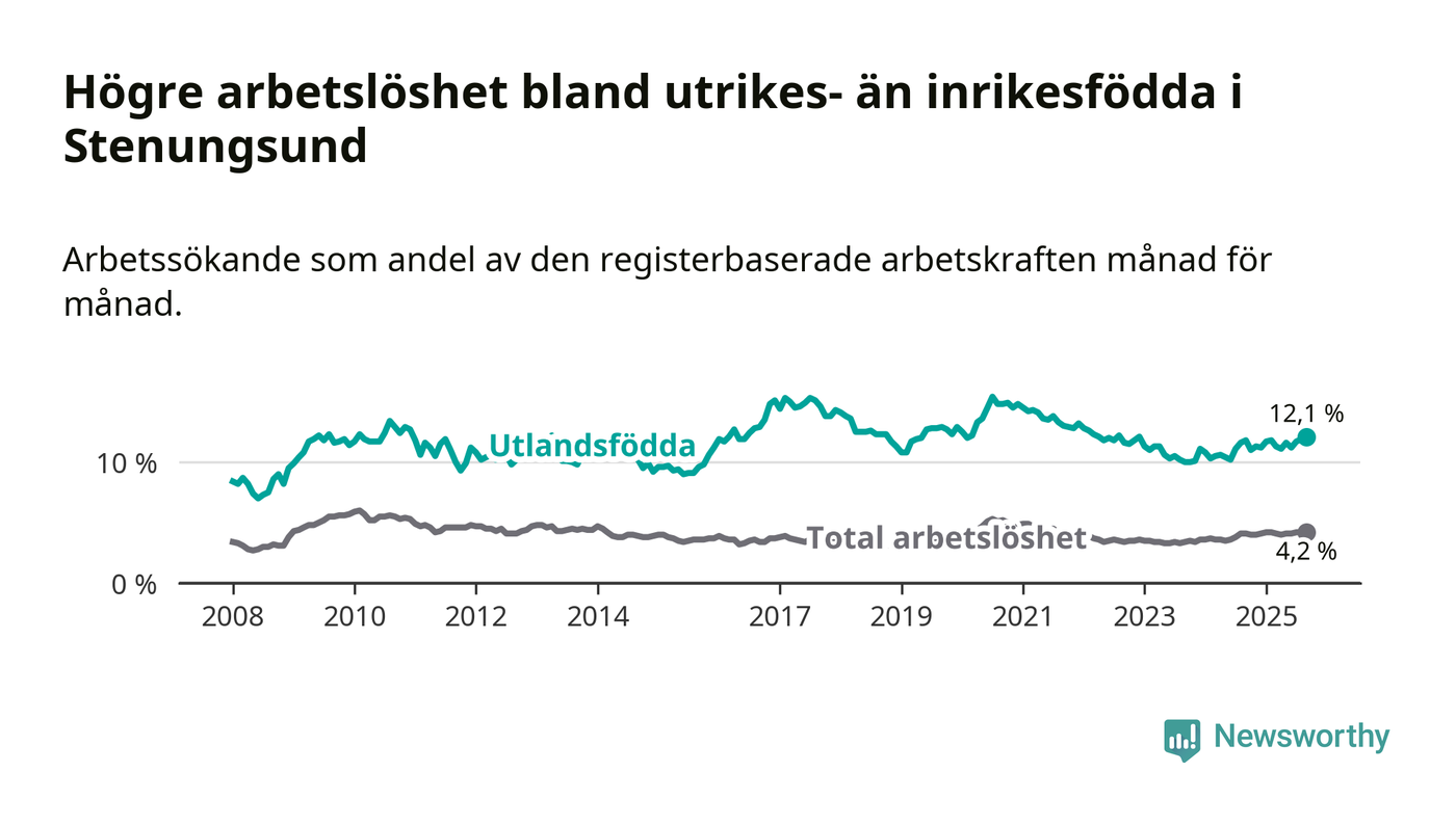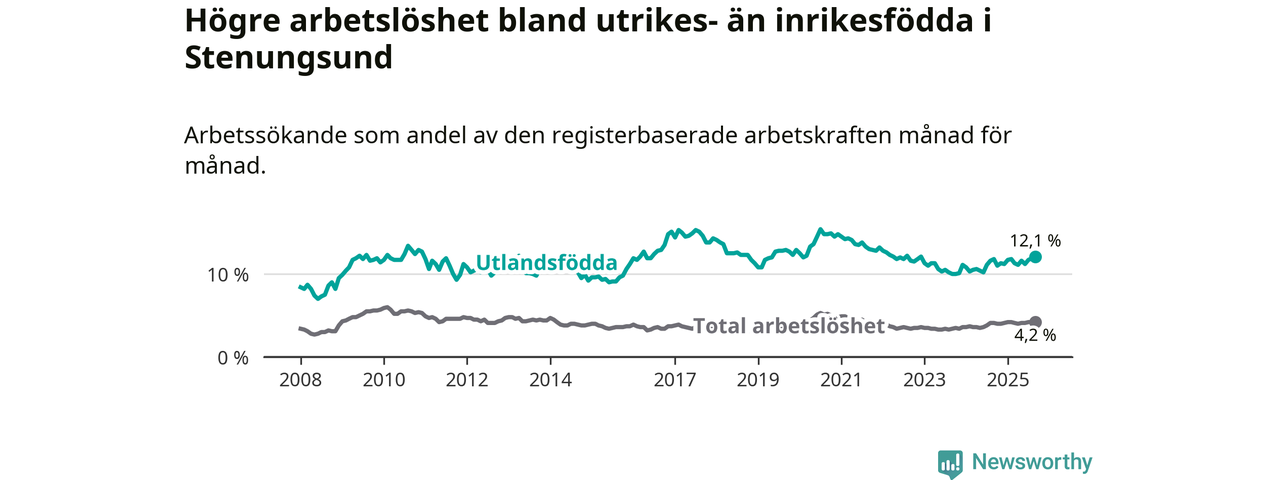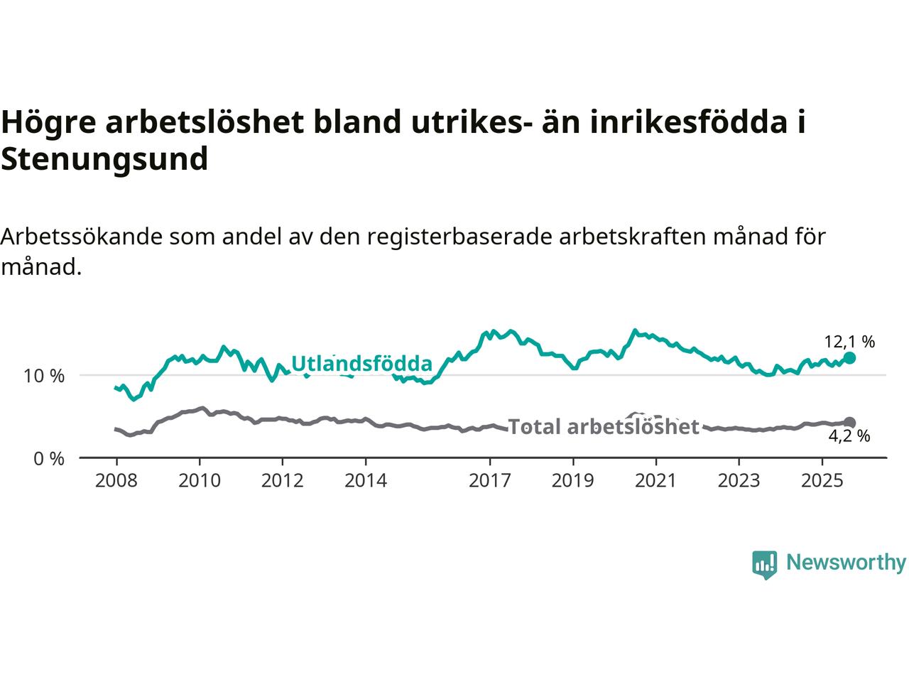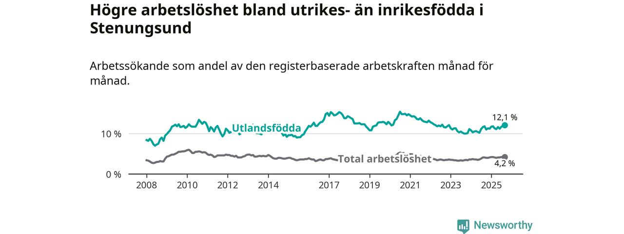 Arbetslösheten bland utlandsfödda var 12,1 procent i Stenungsund under september månad, motsvarande 234 av 1 934 personer. Det är 0,3 procentenheter fler än vid samma tidpunkt i fjol (+8 om man räknar personer). Därmed är de utlandsföddas arbetslöshet högre än vid samma tidpunkt i fjol för 15:e månaden i följd. Sedan juni 2024 har arbetslösheten bland utlandsfödda ökat från 10,2 till 12,1 procent.