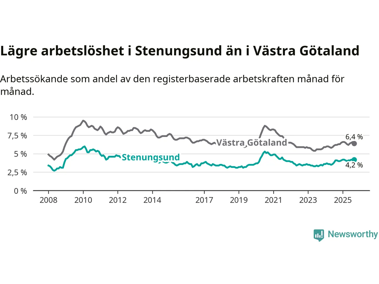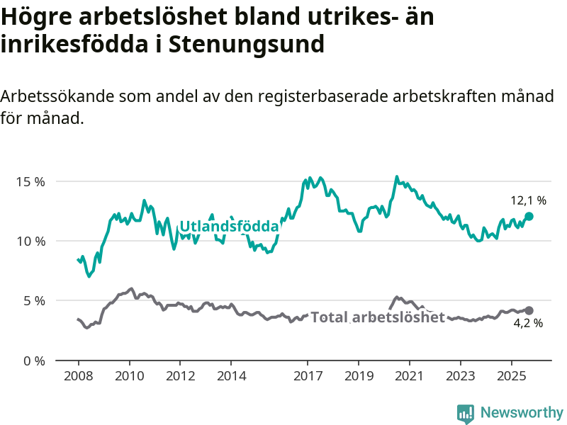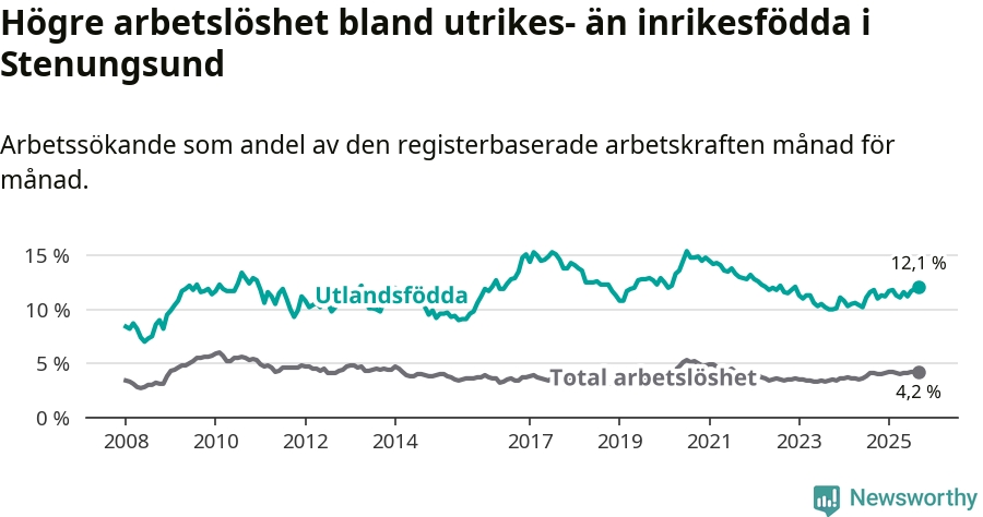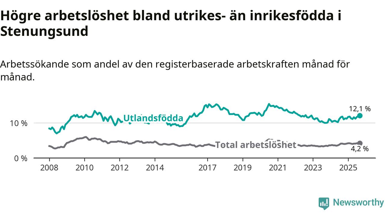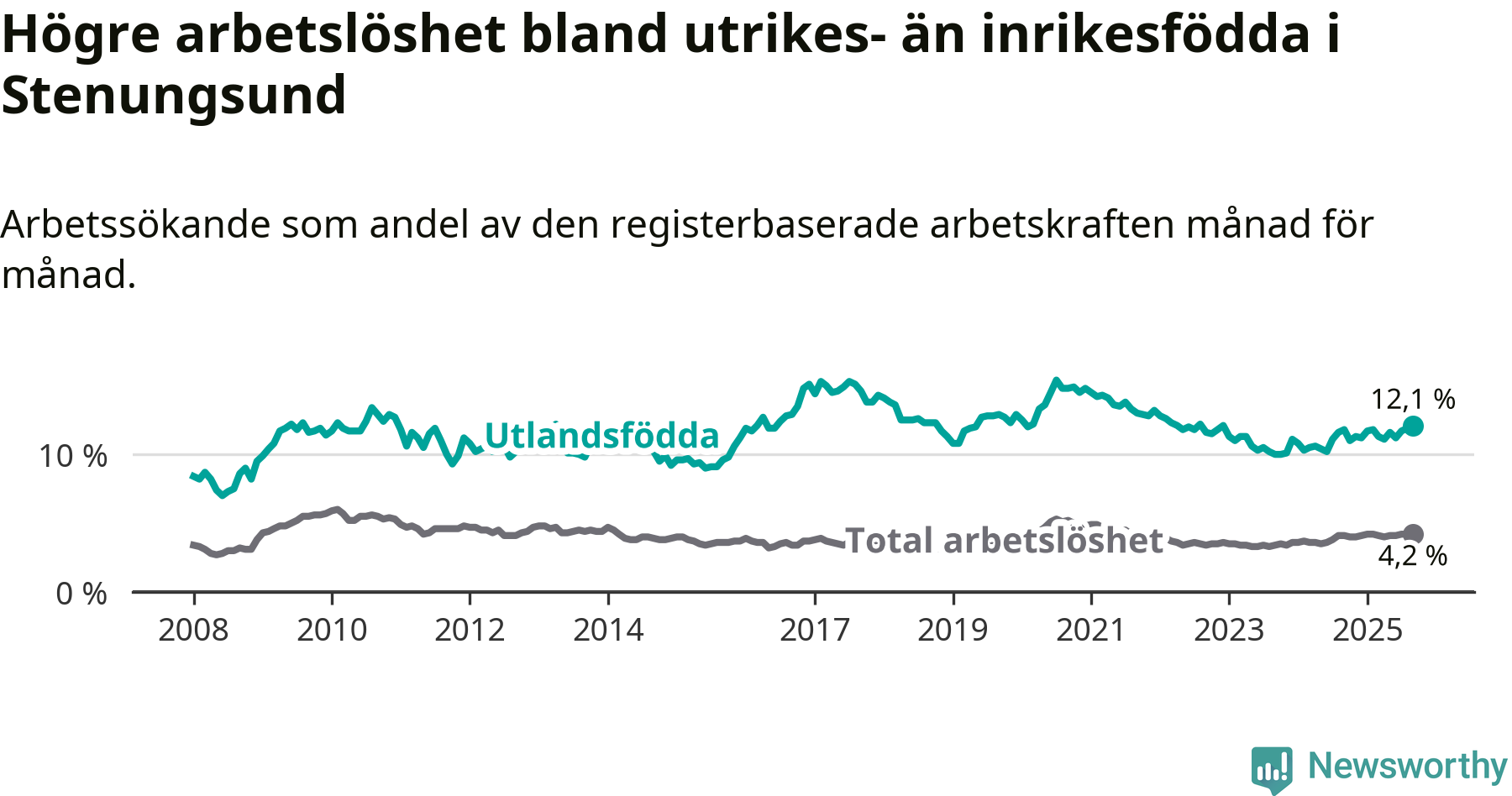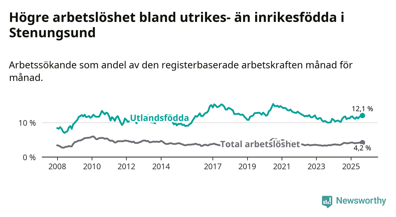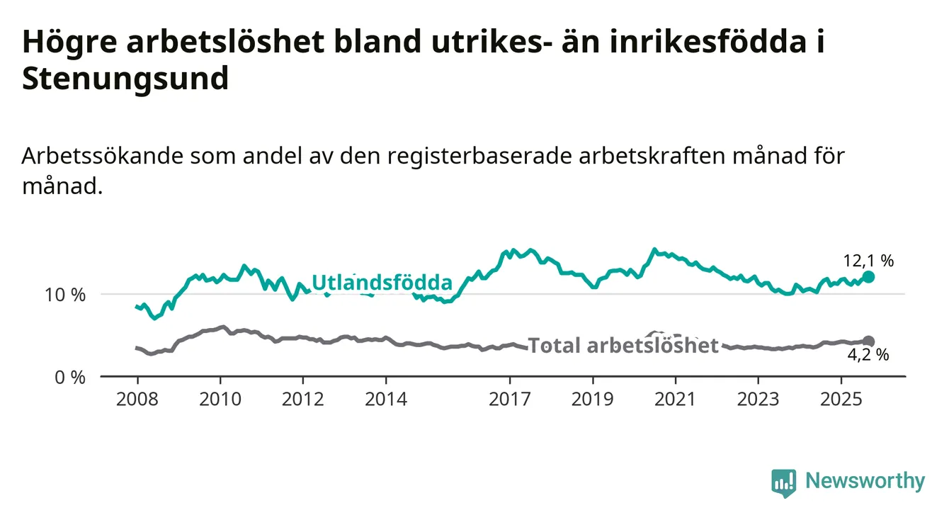 Arbetslösheten bland utlandsfödda var 12,1 procent i Stenungsund under september månad, motsvarande 234 av 1 934 personer. Det är 0,3 procentenheter fler än vid samma tidpunkt i fjol (+8 om man räknar personer). Därmed är de utlandsföddas arbetslöshet högre än vid samma tidpunkt i fjol för 15:e månaden i följd. Sedan juni 2024 har arbetslösheten bland utlandsfödda ökat från 10,2 till 12,1 procent.