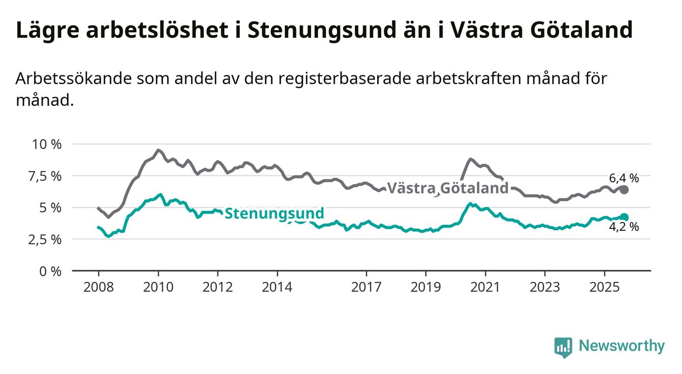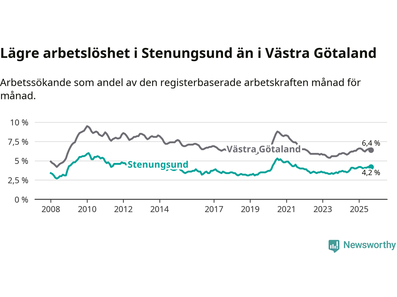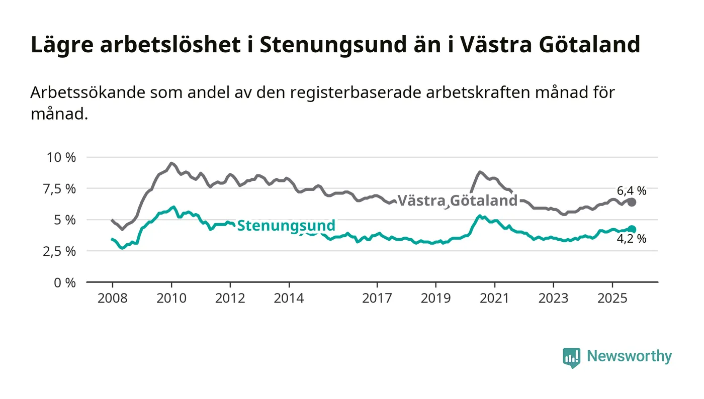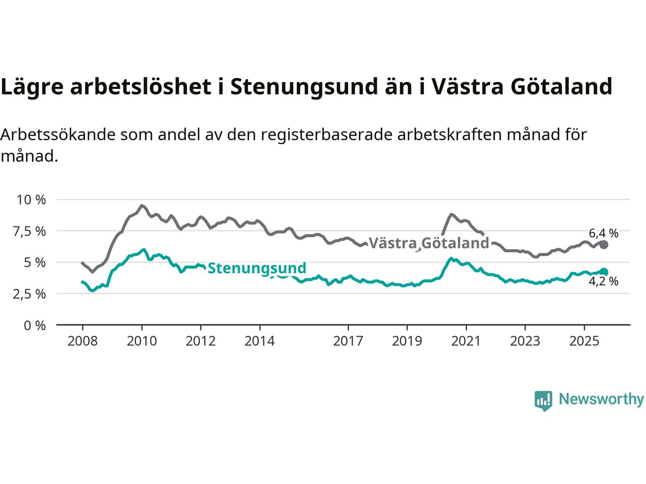 Även om arbetslösheten i Stenungsund alltså ökar, så ligger den fortfarande under snittet i hela Västra Götalands län (4,2 procent i kommunen, jämfört med 6,4 procent i hela länet). Öckerö har den lägsta arbetslösheten i länet (2,7 procent), medan Gullspång har den högsta (8,5 procent). För att Stenungsund skulle komma ner i samma arbetslöshetsnivå som Öckerö skulle 213 personer behöva sysselsättas.