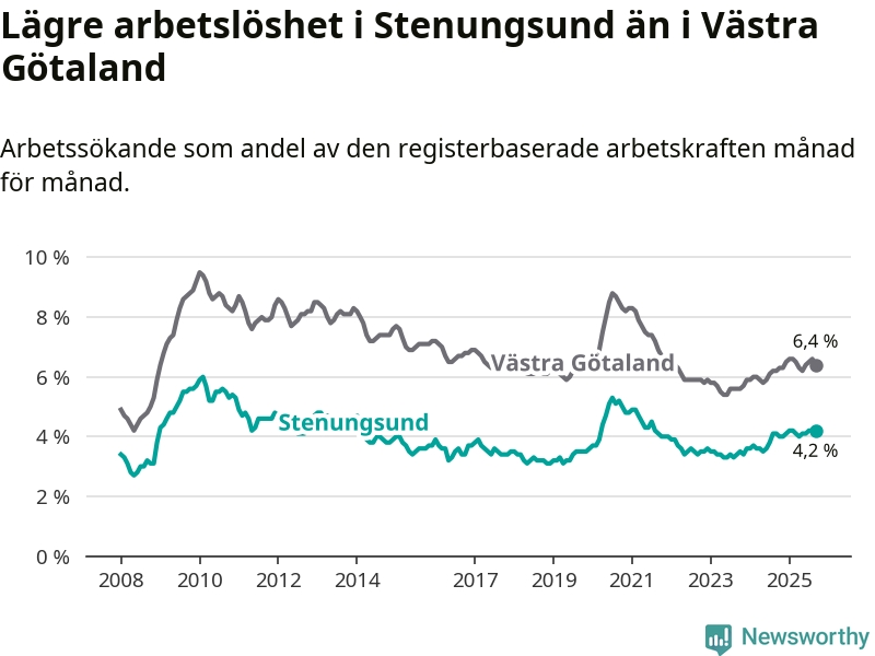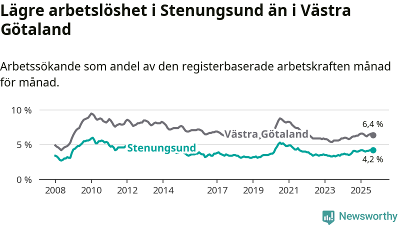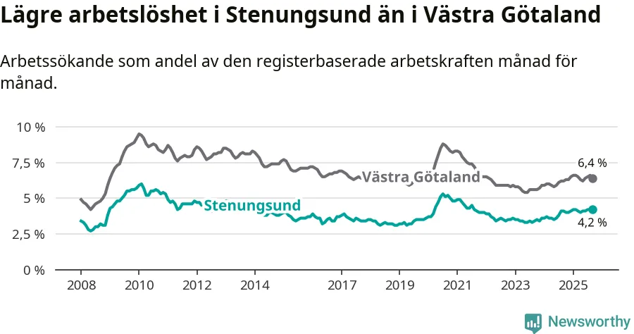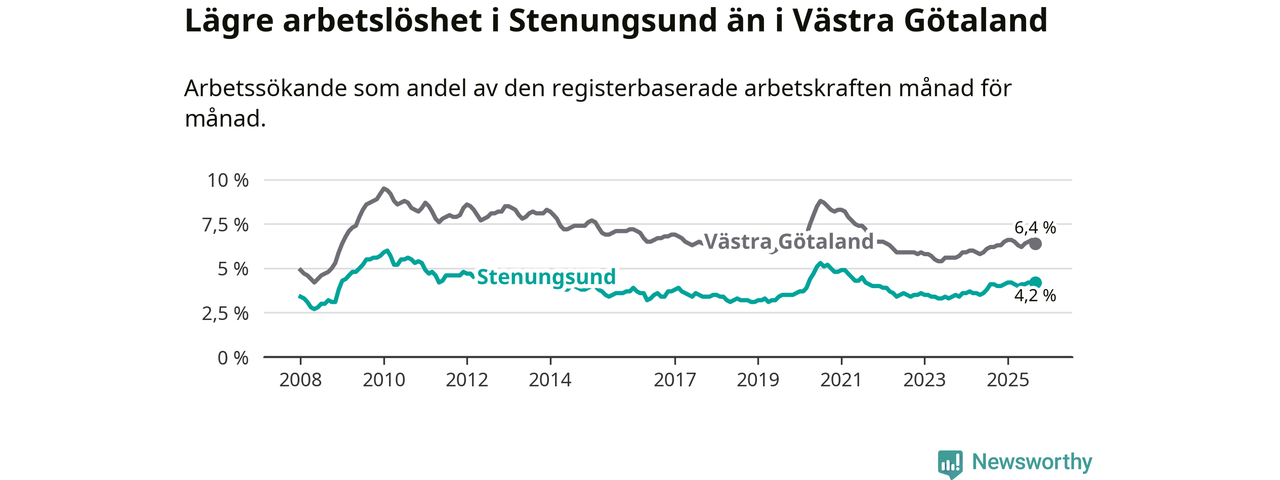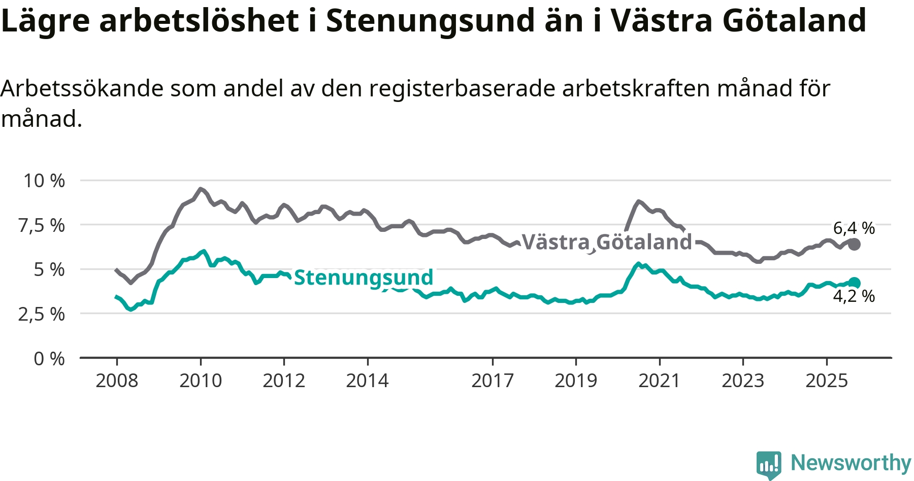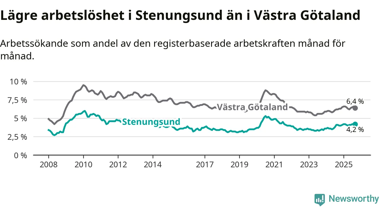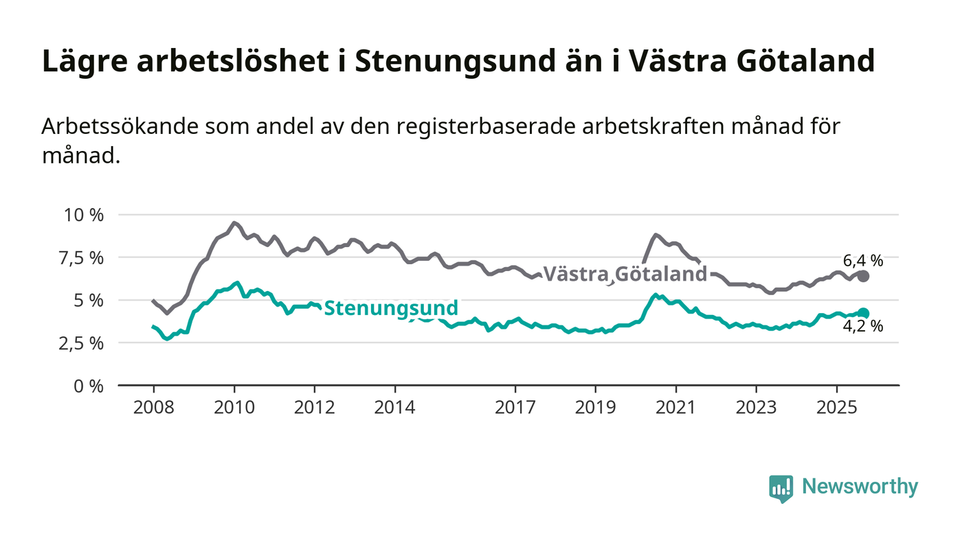 Även om arbetslösheten i Stenungsund alltså ökar, så ligger den fortfarande under snittet i hela Västra Götalands län (4,2 procent i kommunen, jämfört med 6,4 procent i hela länet). Öckerö har den lägsta arbetslösheten i länet (2,7 procent), medan Gullspång har den högsta (8,5 procent). För att Stenungsund skulle komma ner i samma arbetslöshetsnivå som Öckerö skulle 213 personer behöva sysselsättas.