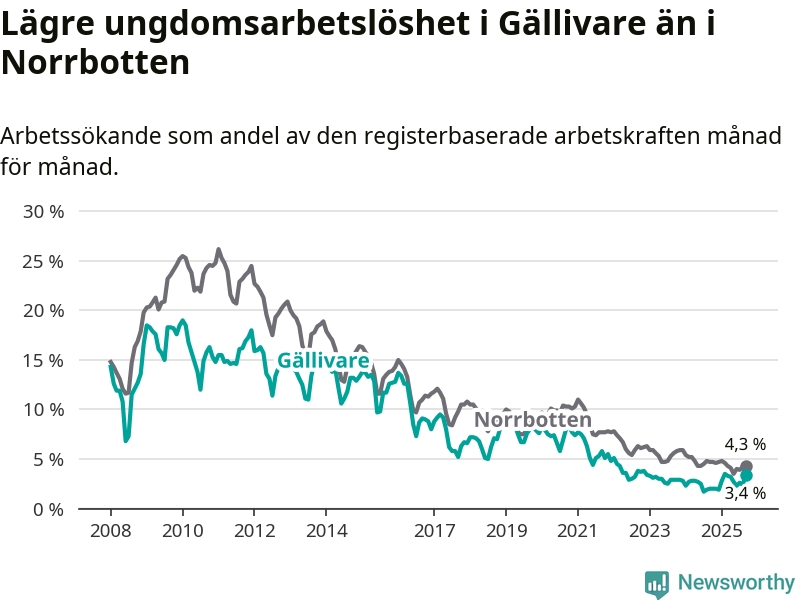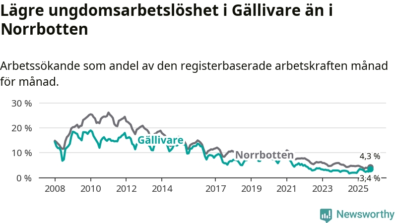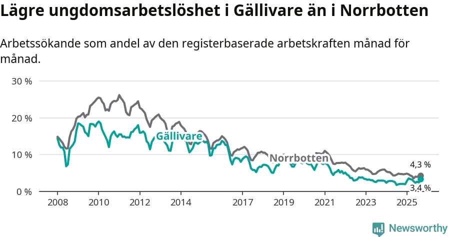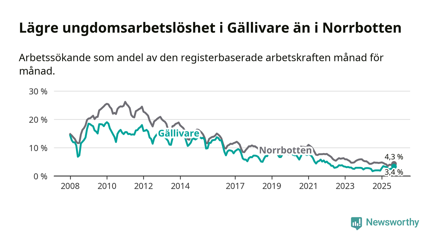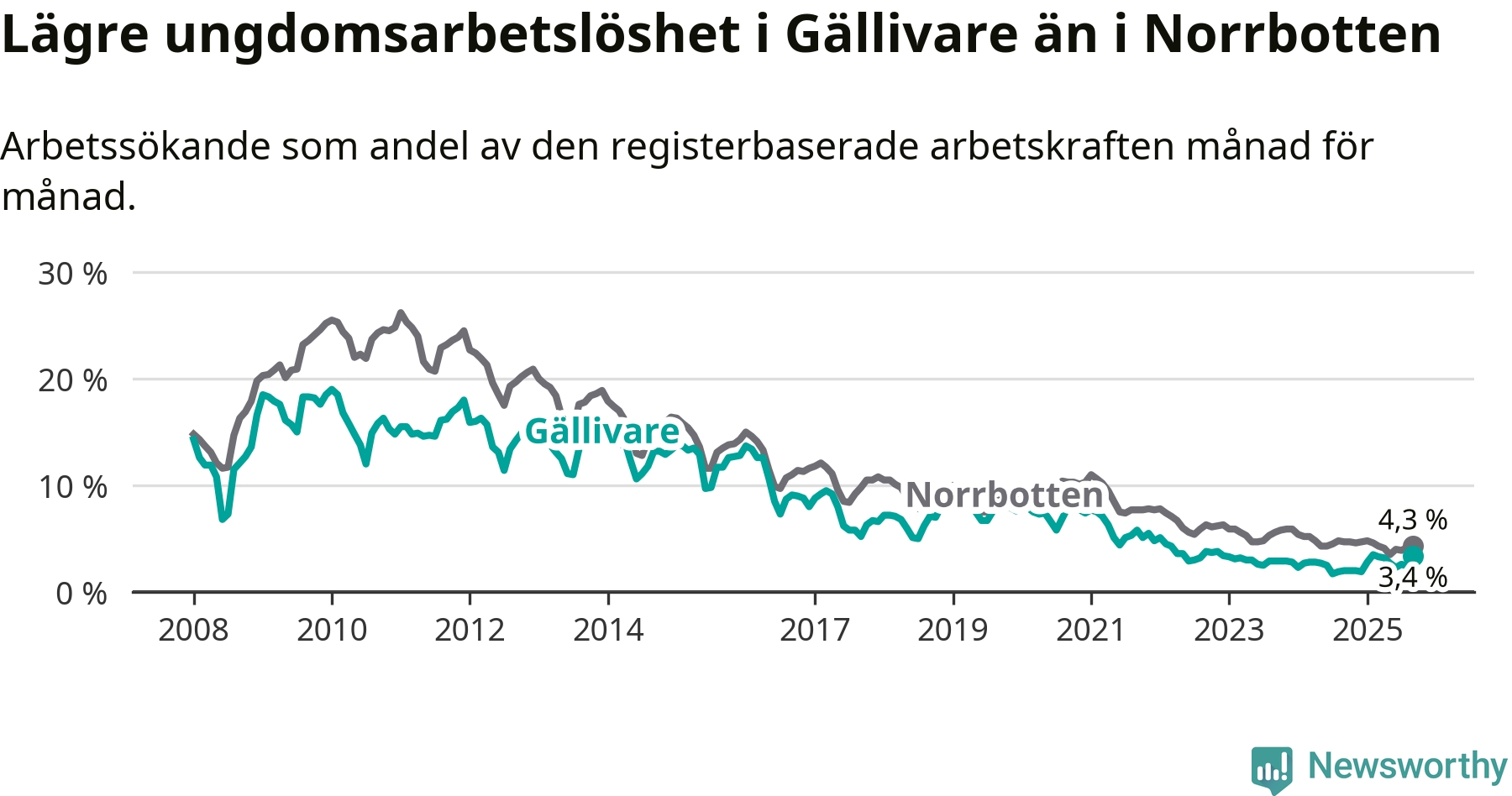 Precis som den totala arbetslösheten ligger ungdomsarbetslösheten i Gällivare lägre än i Norrbotten som helhet. Skillnaden mellan kommunen och länet är 0,9 procentenheter.