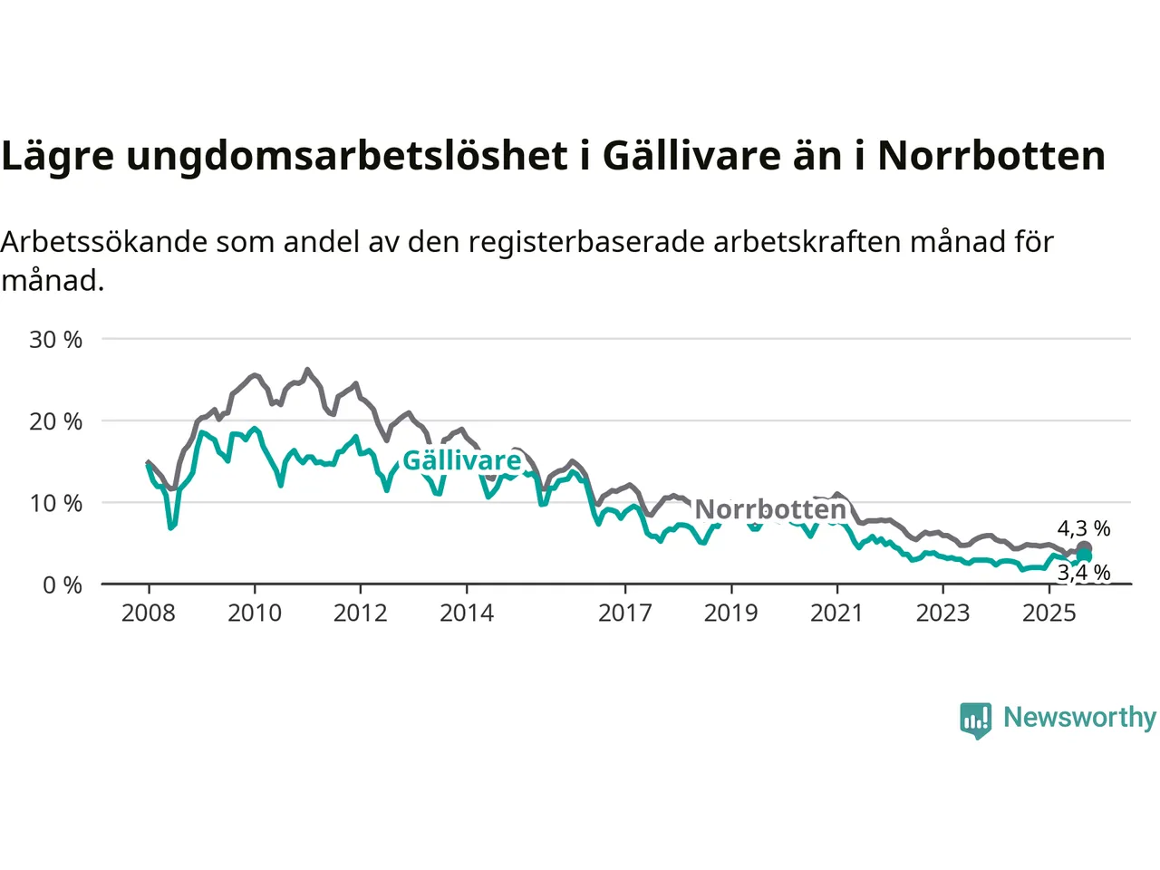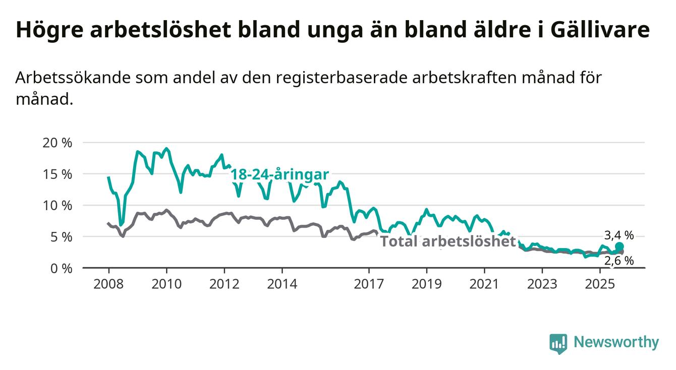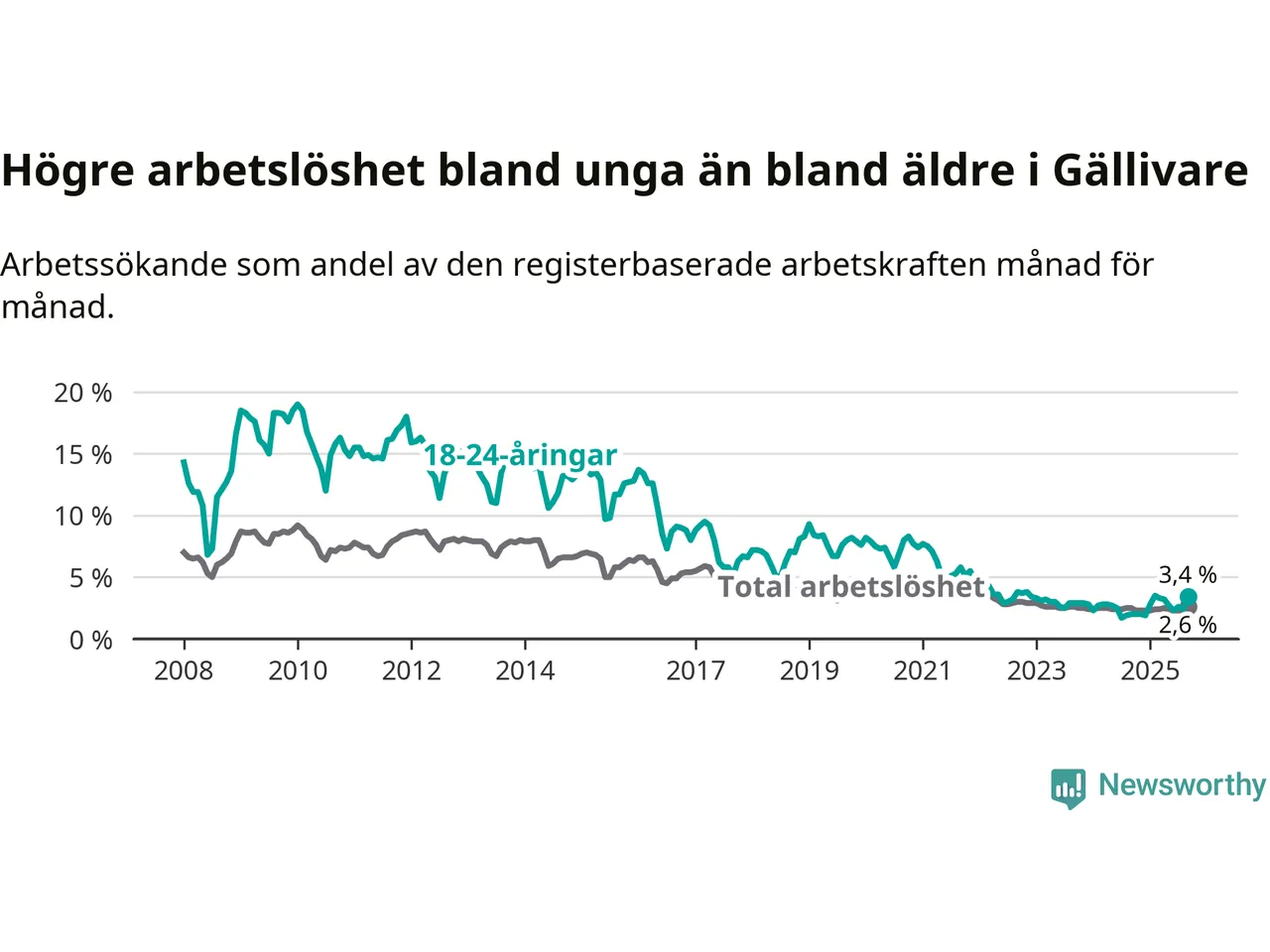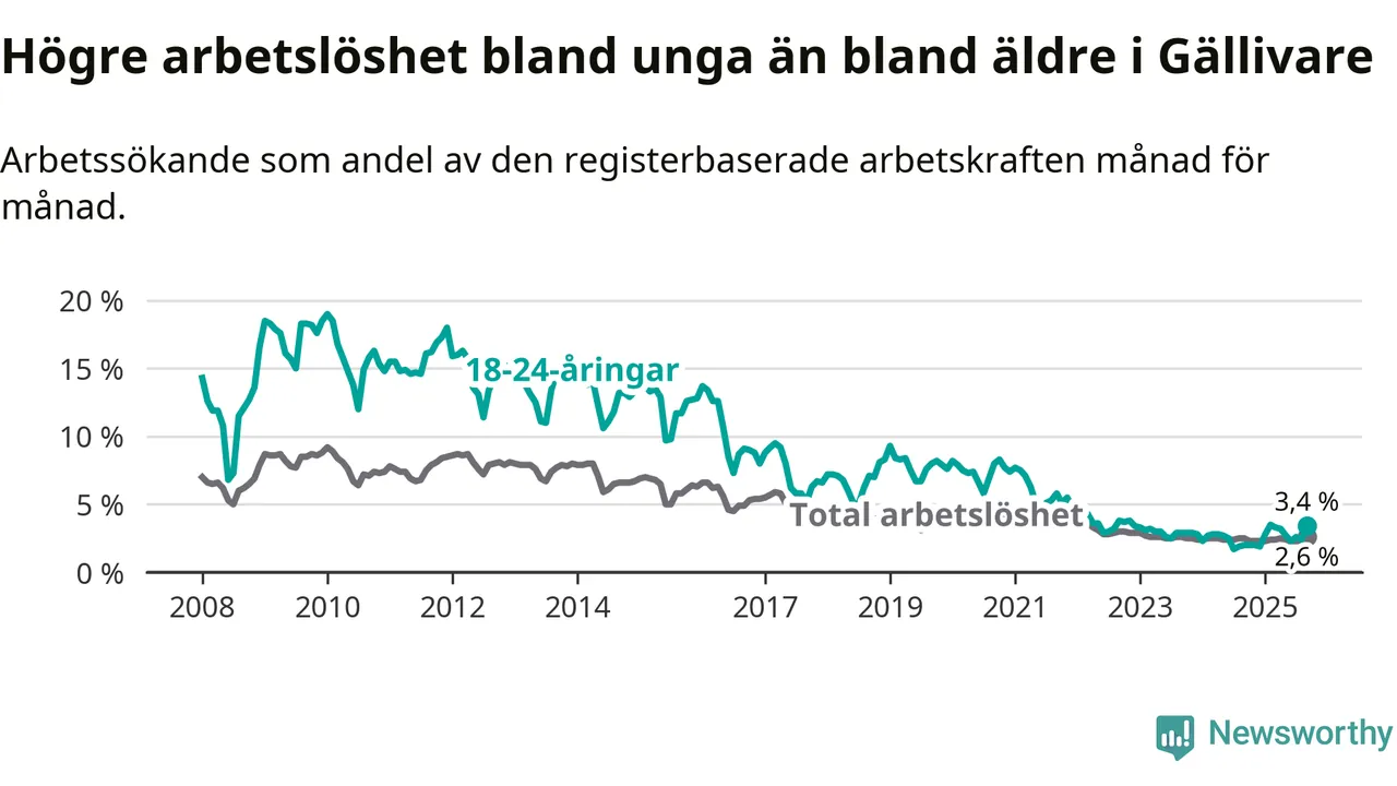 Den senaste månadsstatistiken från Arbetsförmedlingen visar på en uppgång i ungdomsarbetslöshet i Gällivare kommun med 1,4 procentenheter. Arbetslösheten bland personer i åldern 18–24 år låg i september på 3,4 procent.