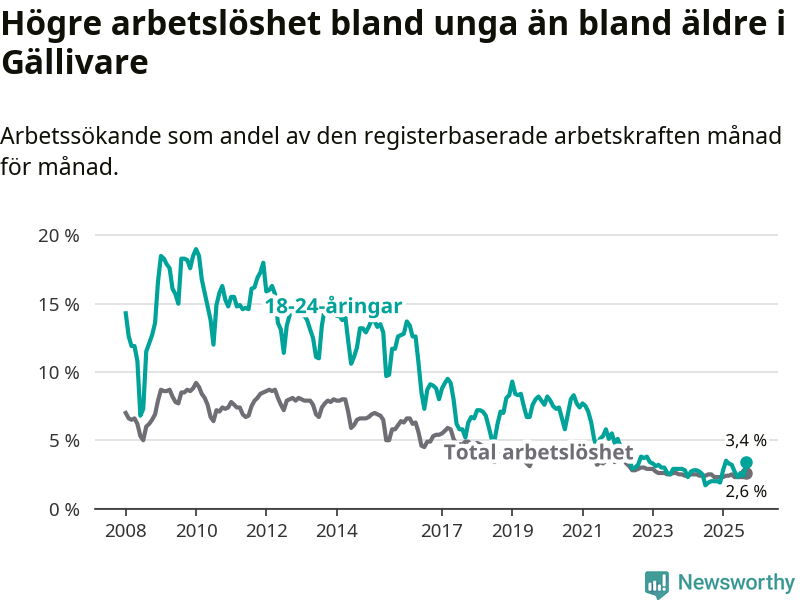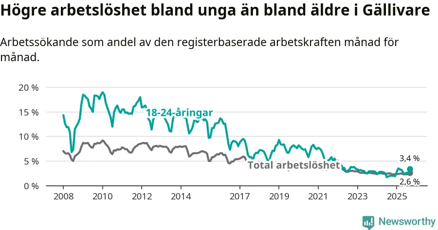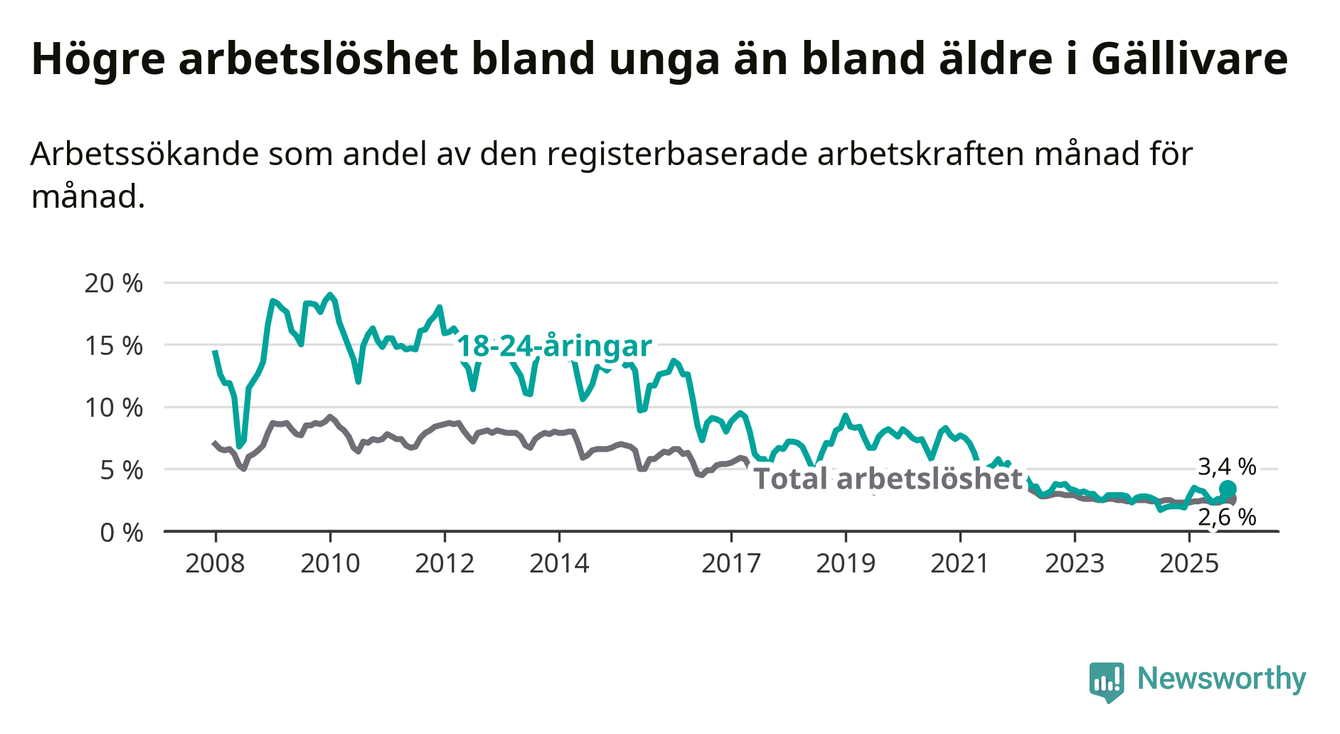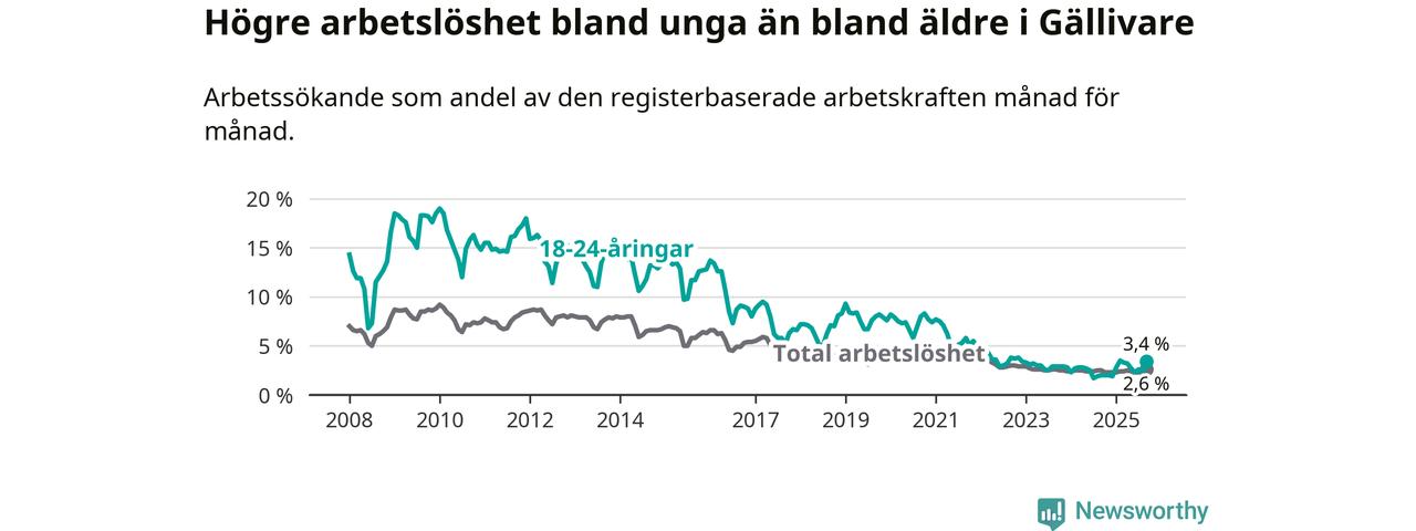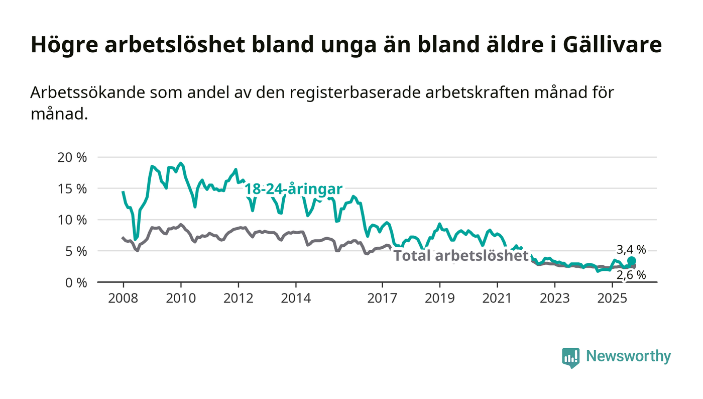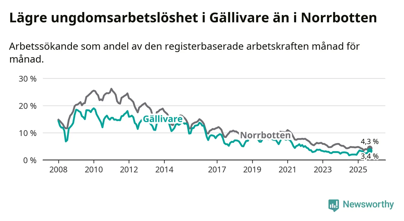 Den senaste månadsstatistiken från Arbetsförmedlingen visar på en uppgång i ungdomsarbetslöshet i Gällivare kommun med 1,4 procentenheter. Arbetslösheten bland personer i åldern 18–24 år låg i september på 3,4 procent.