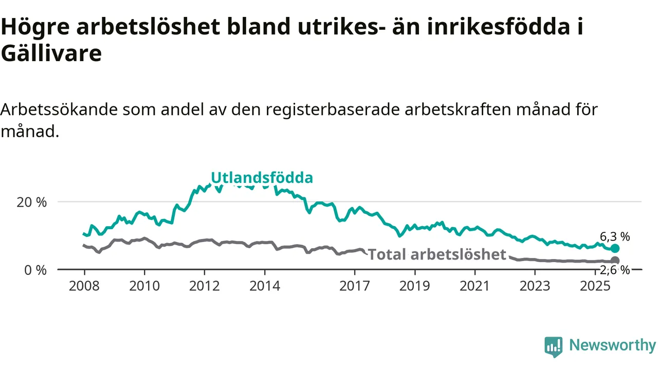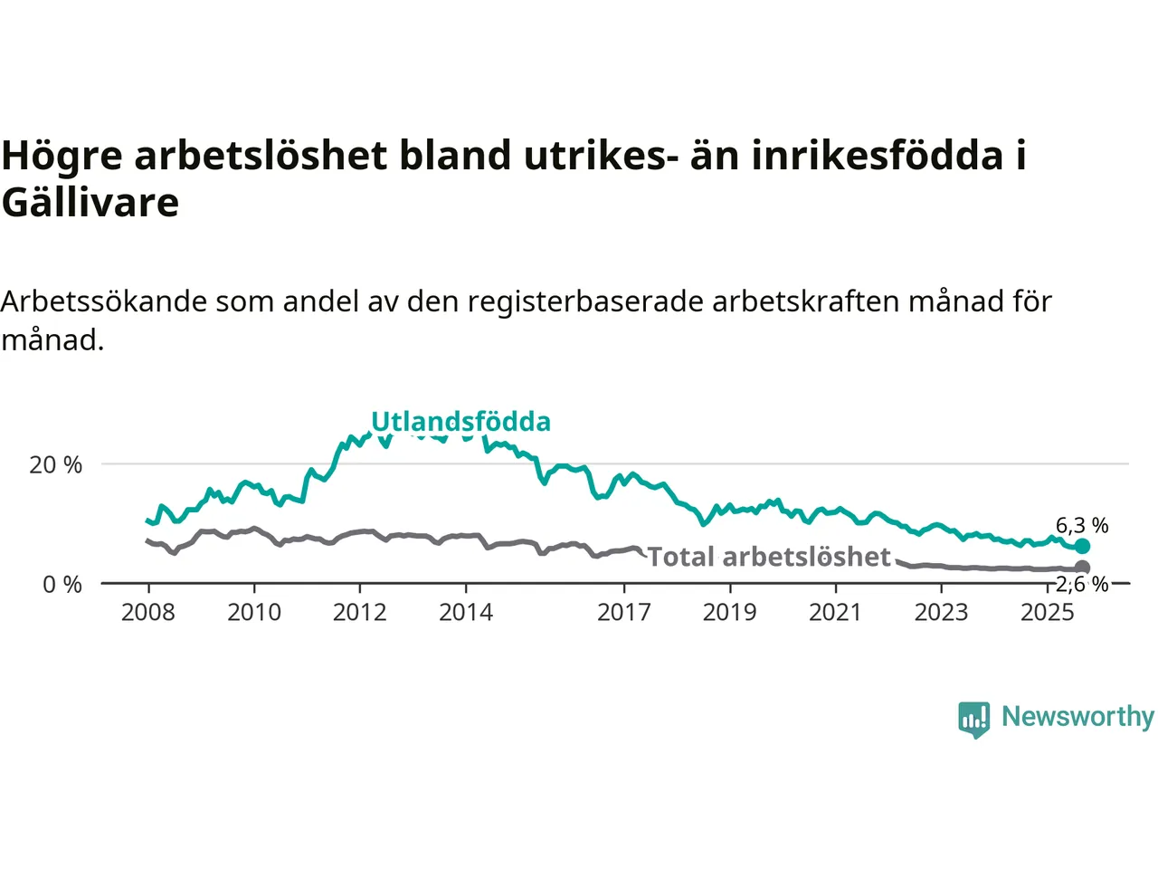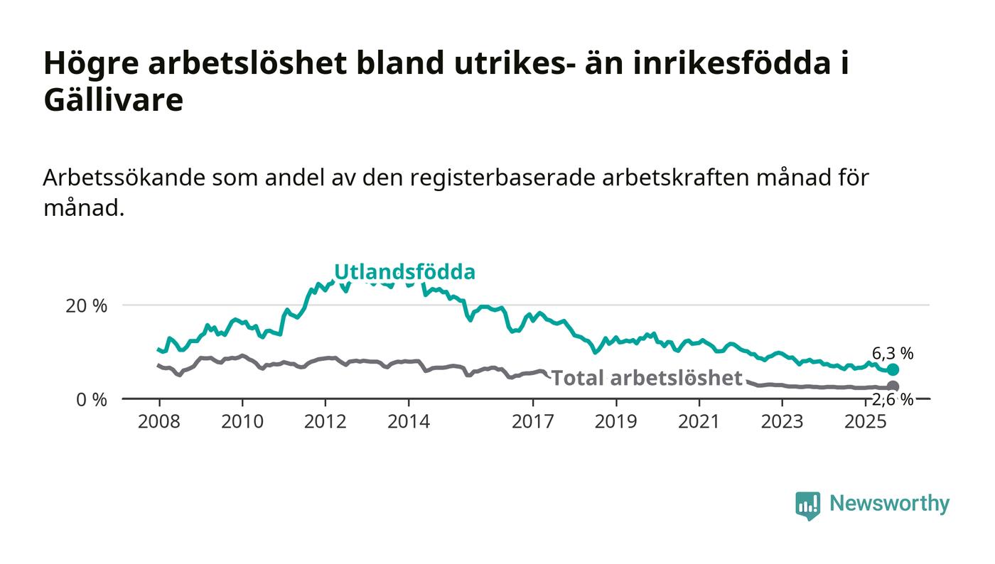 Skillnaden i arbetslöshet mellan utrikesfödda och hela befolkningen är 3,7 procentenheter i Gällivare. Det är en mindre skillnad än för ett år sedan (−0,9 procentenheter).