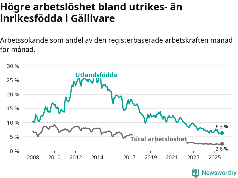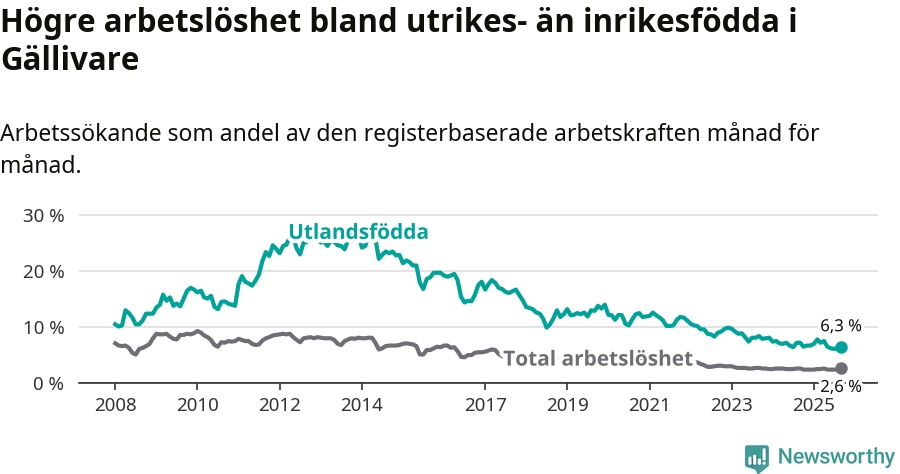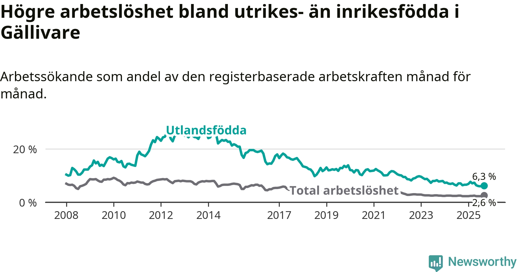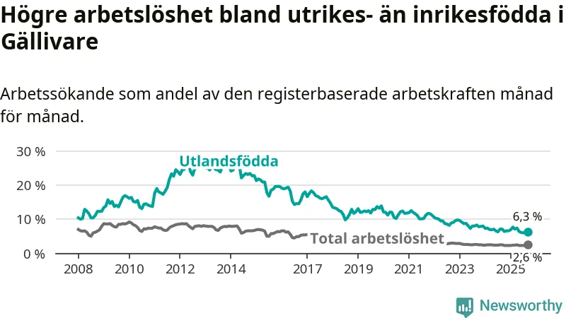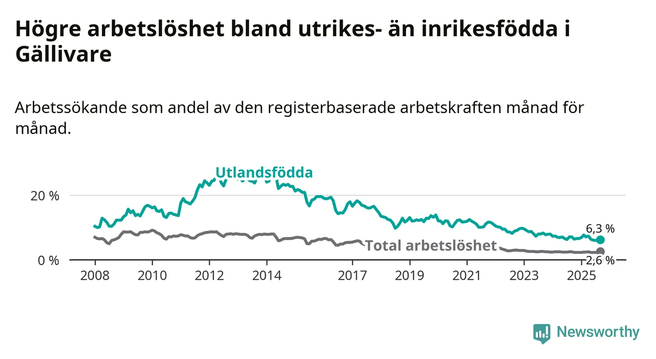 Skillnaden i arbetslöshet mellan utrikesfödda och hela befolkningen är 3,7 procentenheter i Gällivare. Det är en mindre skillnad än för ett år sedan (−0,9 procentenheter).