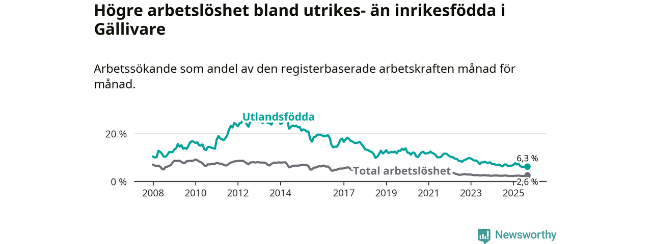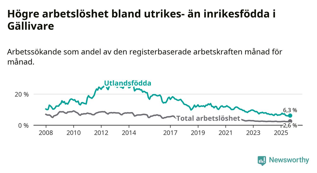 Arbetslösheten bland utlandsfödda var 6,3 procent i Gällivare under september månad, motsvarande 83 av 1 317 personer. Det är 0,8 procentenheter färre än vid samma tidpunkt i fjol (−7 om man räknar personer).