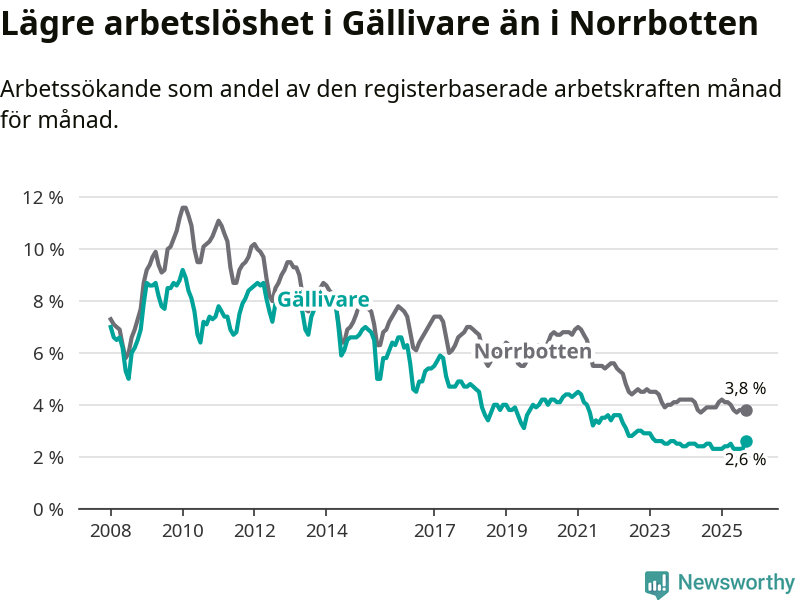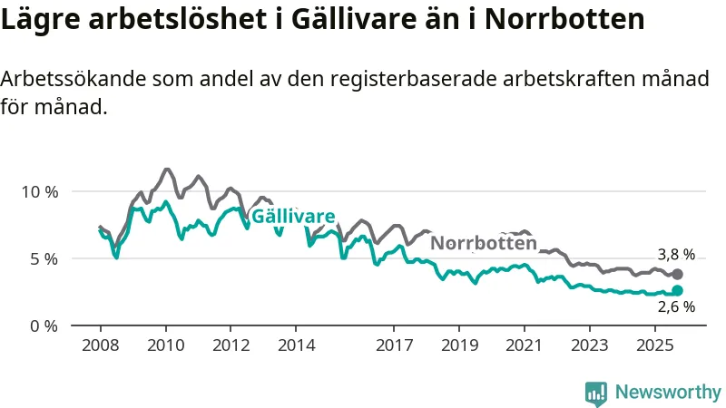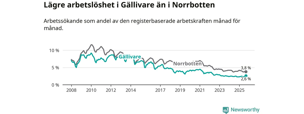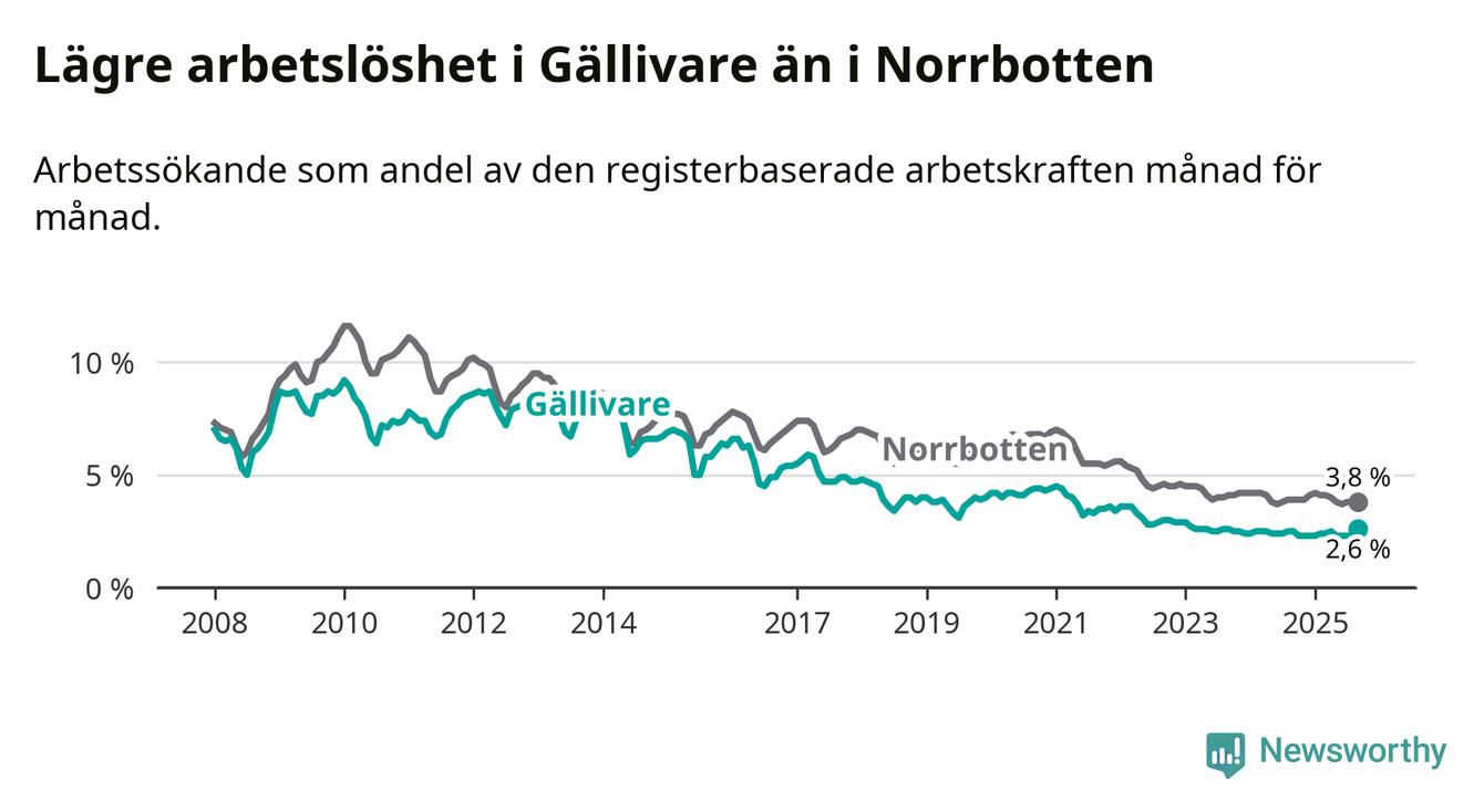 Även om arbetslösheten i Gällivare alltså ökar, så ligger den fortfarande under snittet i hela Norrbottens län (2,6 procent i kommunen, jämfört med 3,8 procent i hela länet). Gällivare har därmed även den lägsta arbetslöshetsnivån i inte bara länet, utan även hela Sverige. Haparanda och Överkalix har den högsta (6,4 procent).