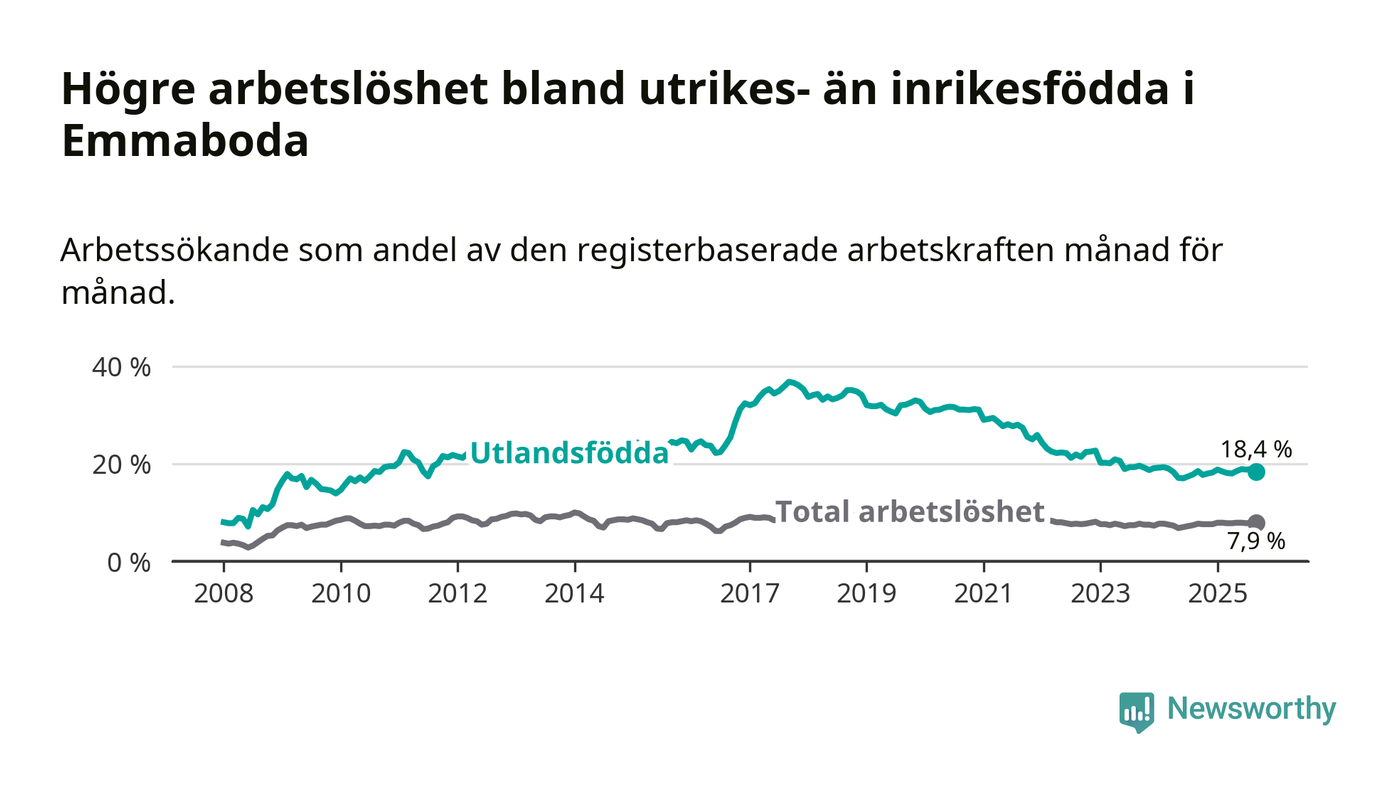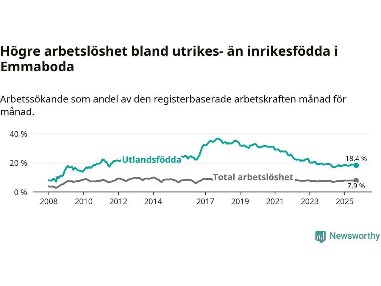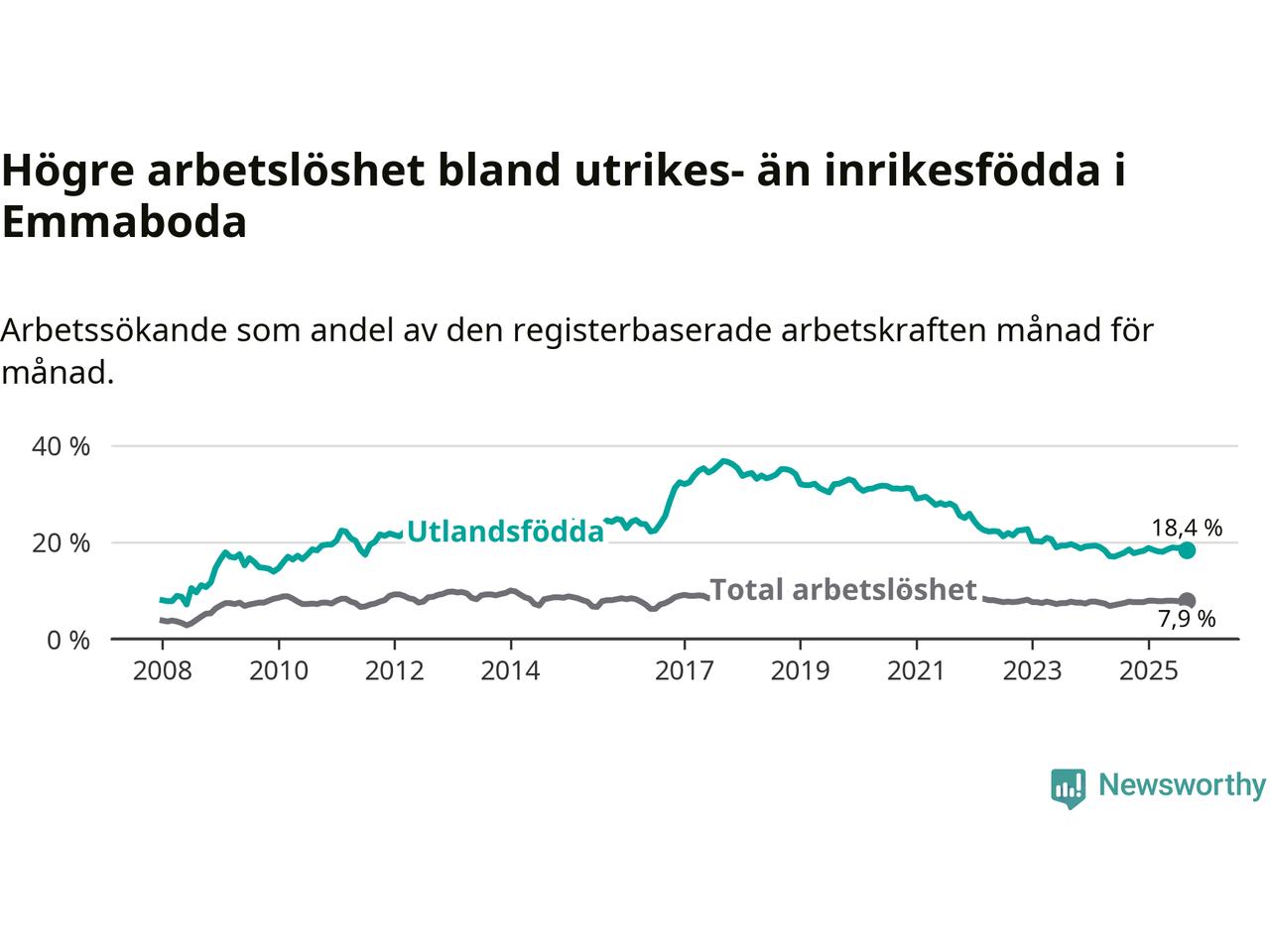 Arbetslösheten bland utlandsfödda var 18,4 procent i Emmaboda under september månad, motsvarande 171 av 929 personer. Det är 0,1 procentenheter färre än vid samma tidpunkt i fjol (−3 om man räknar personer). Den senaste månadens nedgång innebär ett trendbrott. Under de fyra föregående månaderna hade arbetslösheten bland utlandsfödda varit högre än motsvarande tidpunkt året innan.