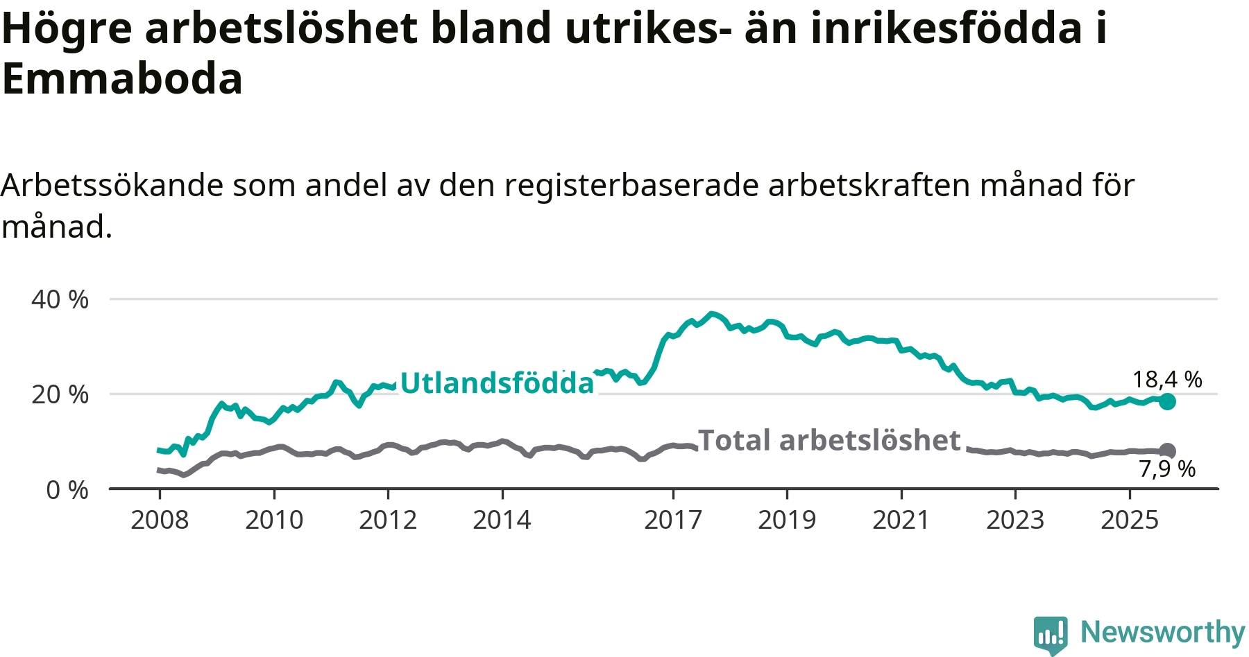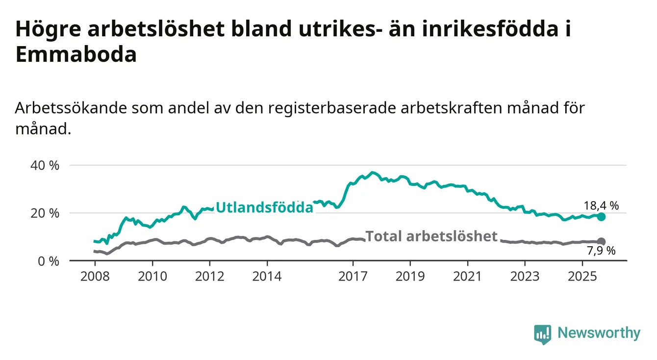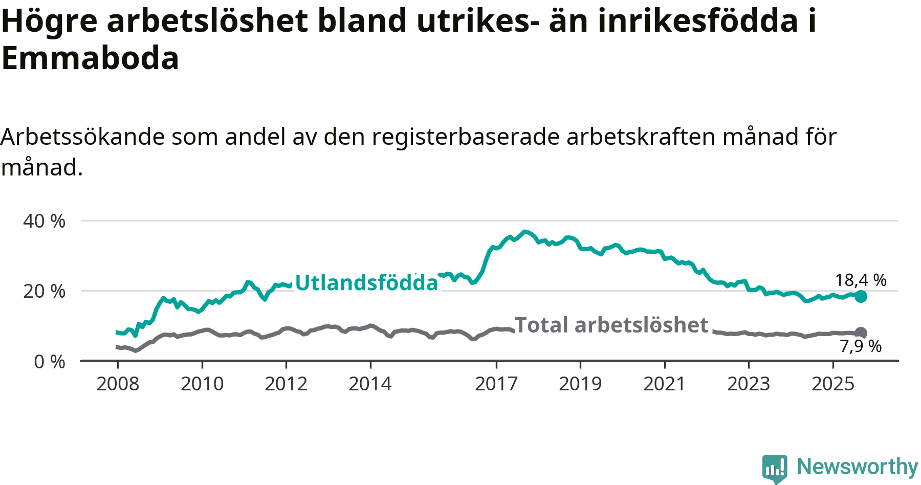 Arbetslösheten bland utlandsfödda var 18,4 procent i Emmaboda under september månad, motsvarande 171 av 929 personer. Det är 0,1 procentenheter färre än vid samma tidpunkt i fjol (−3 om man räknar personer). Den senaste månadens nedgång innebär ett trendbrott. Under de fyra föregående månaderna hade arbetslösheten bland utlandsfödda varit högre än motsvarande tidpunkt året innan.