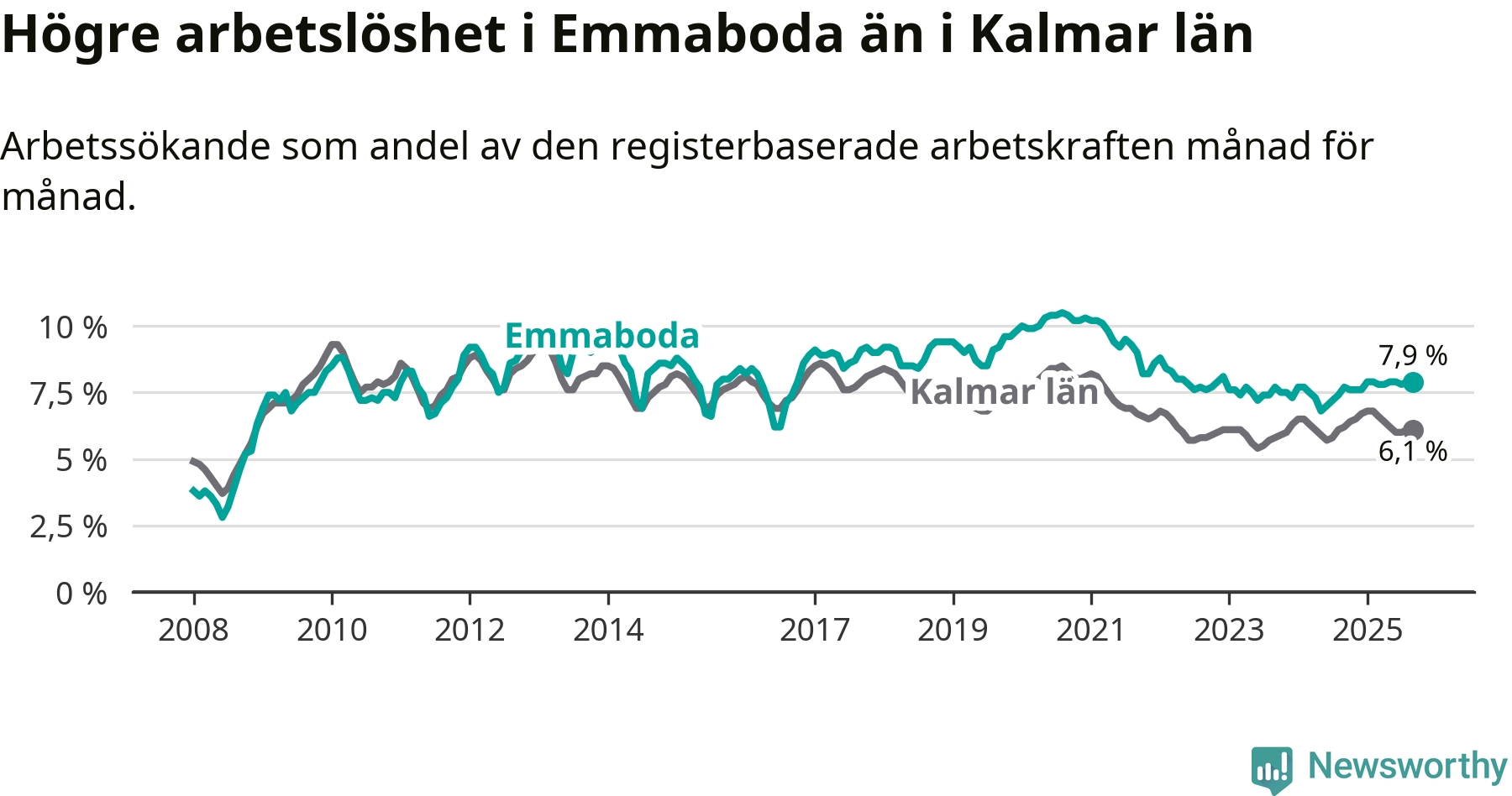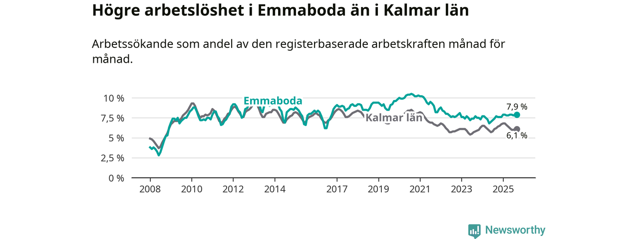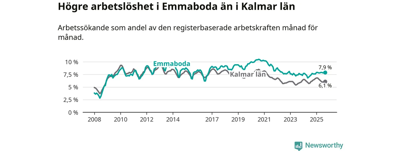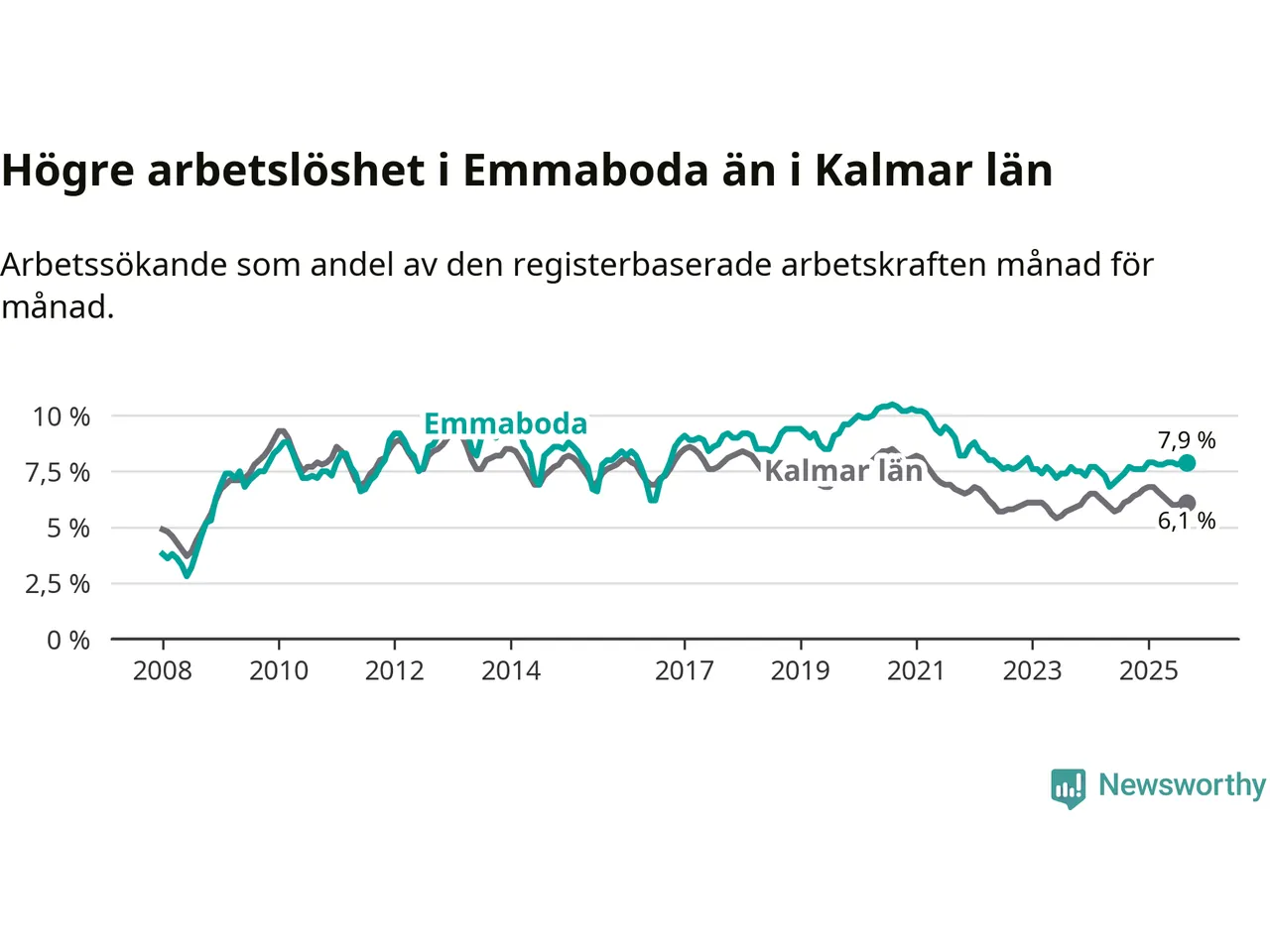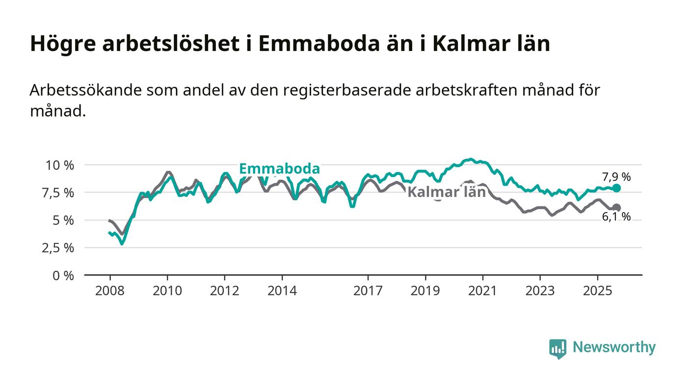 Under september månad rapporterade Emmaboda kommun en total arbetslöshet på 7,9 procent. Det är en ökning jämfört med samma tidpunkt i fjol (+0,2 procentenheter). I Kalmar län däremot sjunker arbetslösheten något.