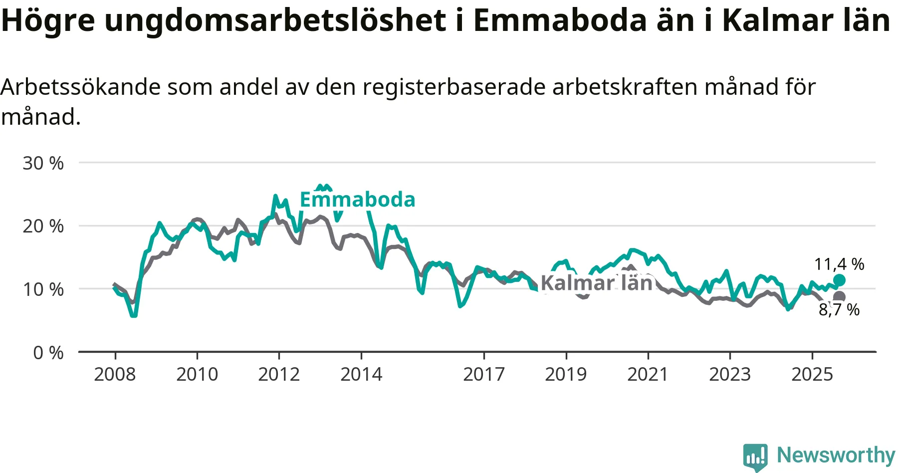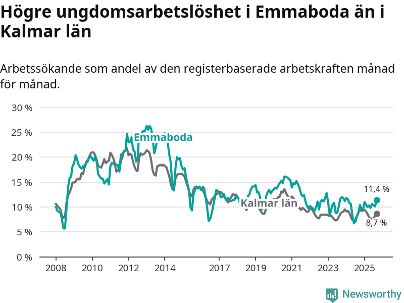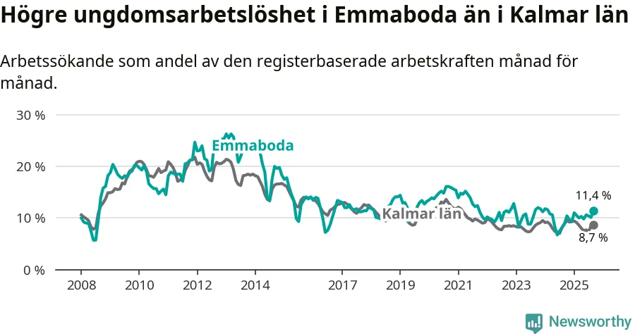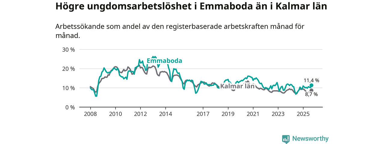 Precis som den totala arbetslösheten ligger ungdomsarbetslösheten i Emmaboda högre än i Kalmar län som helhet. Skillnaden mellan kommunen och länet är 2,7 procentenheter.