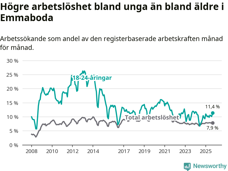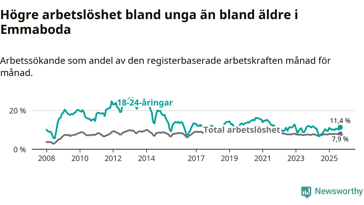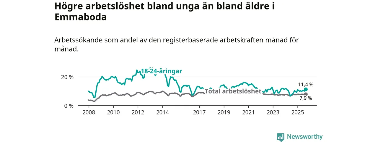 Den senaste månadsstatistiken från Arbetsförmedlingen visar på en uppgång i ungdomsarbetslöshet i Emmaboda kommun med 2,5 procentenheter. Arbetslösheten bland personer i åldern 18–24 år låg i september på 11,4 procent.