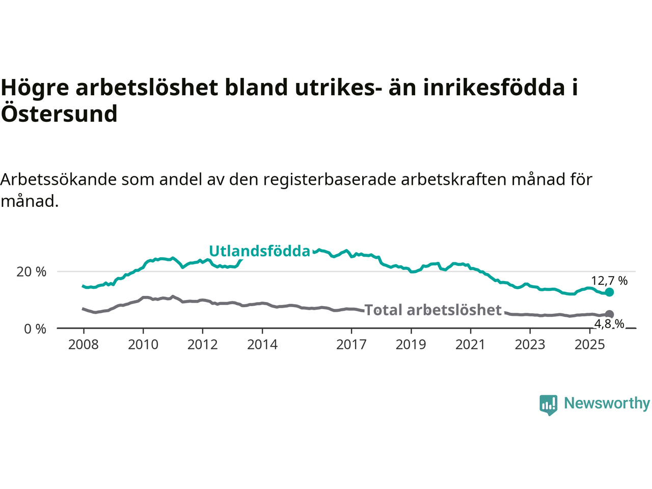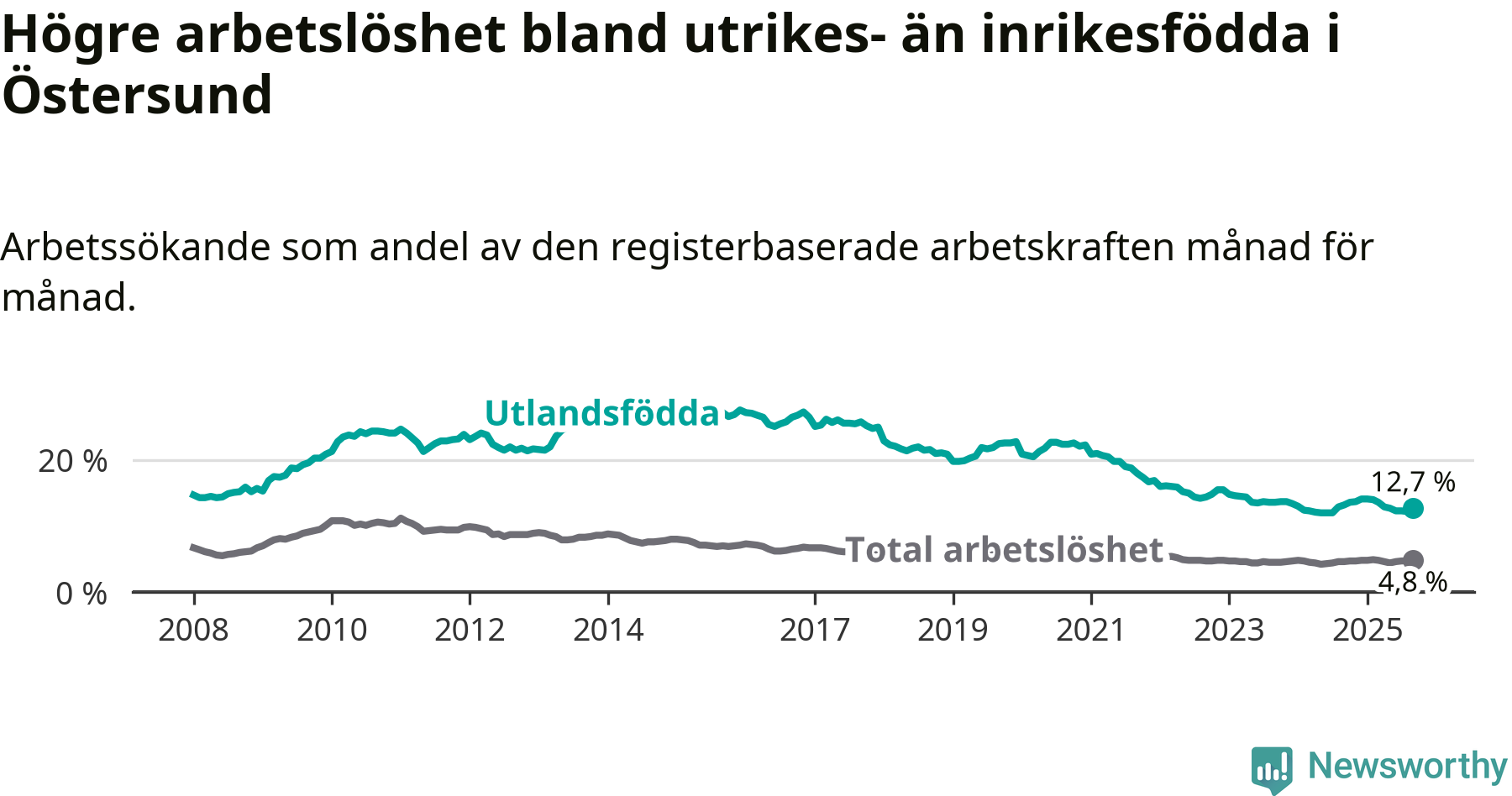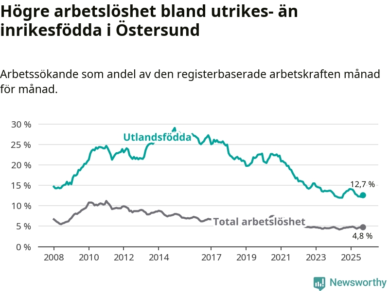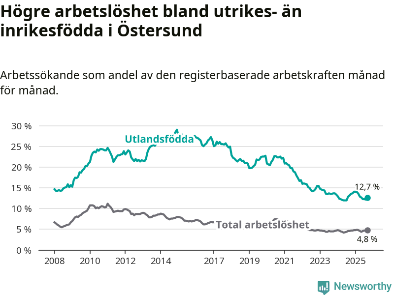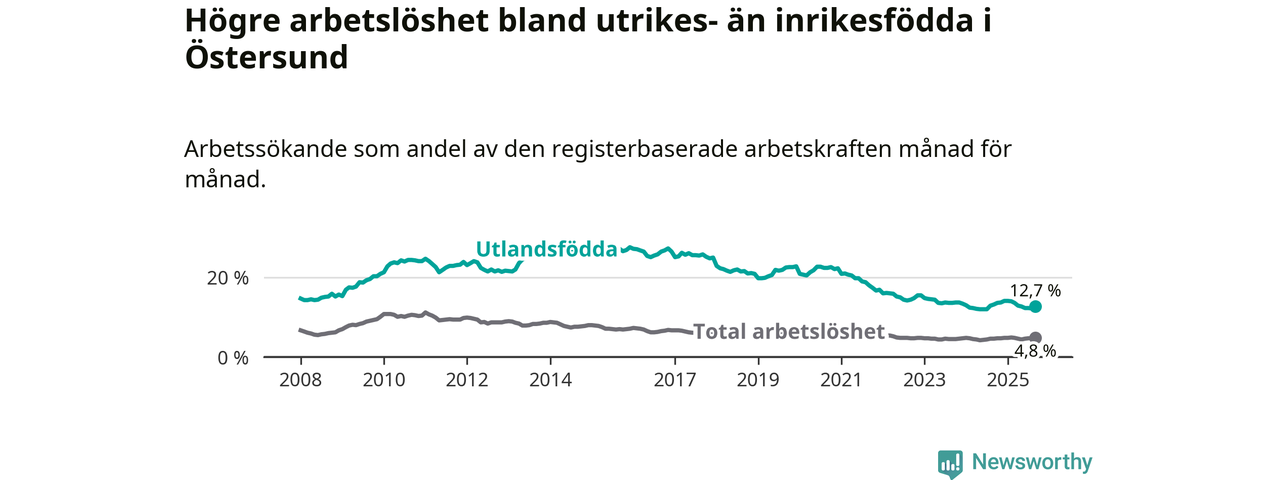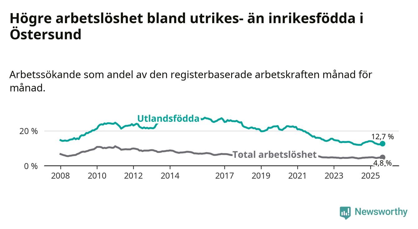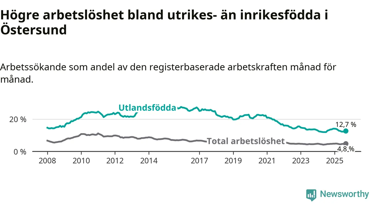 Arbetslösheten bland utlandsfödda var 12,7 procent i Östersund under september månad, motsvarande 571 av 4 496 personer. Det är 0,5 procentenheter färre än vid samma tidpunkt i fjol (−8 om man räknar personer).