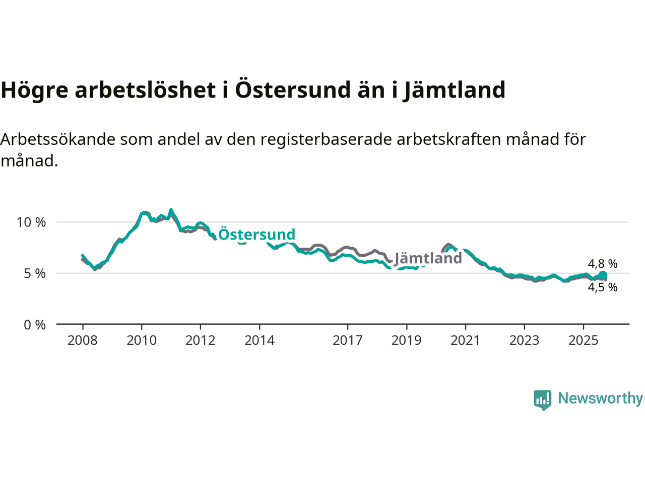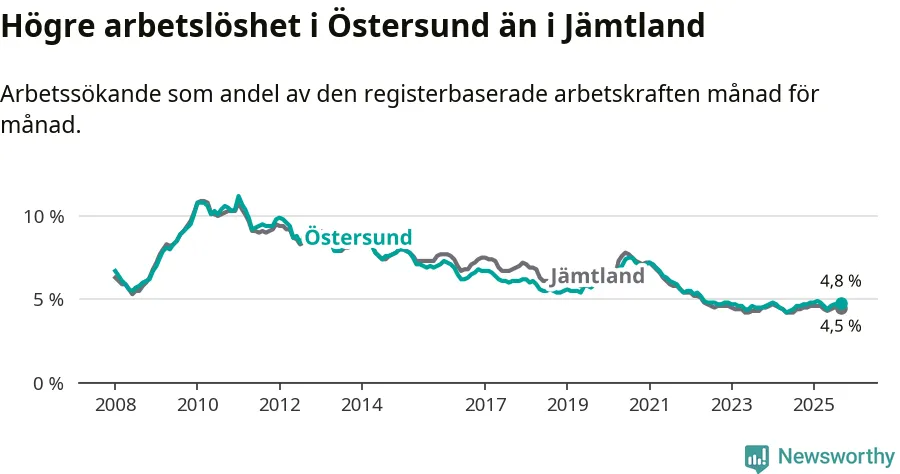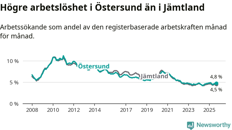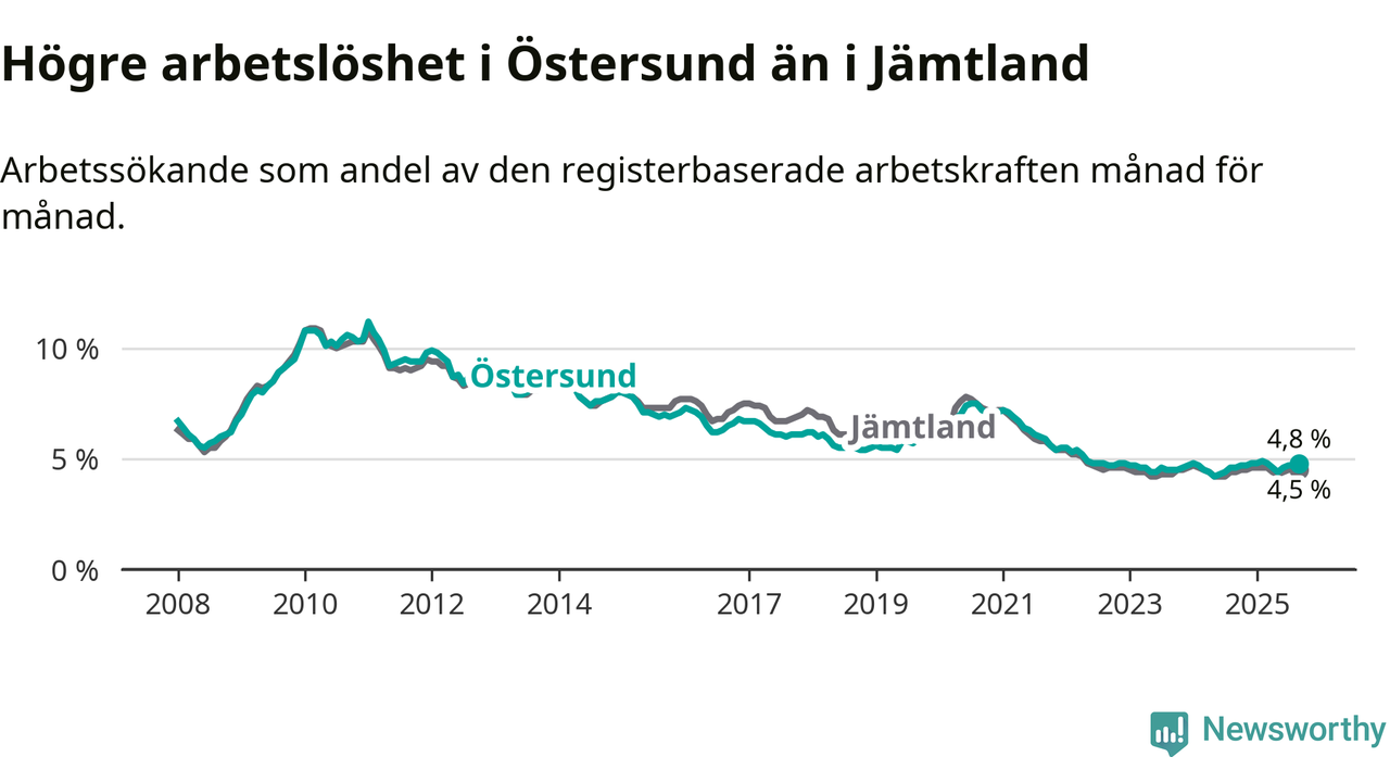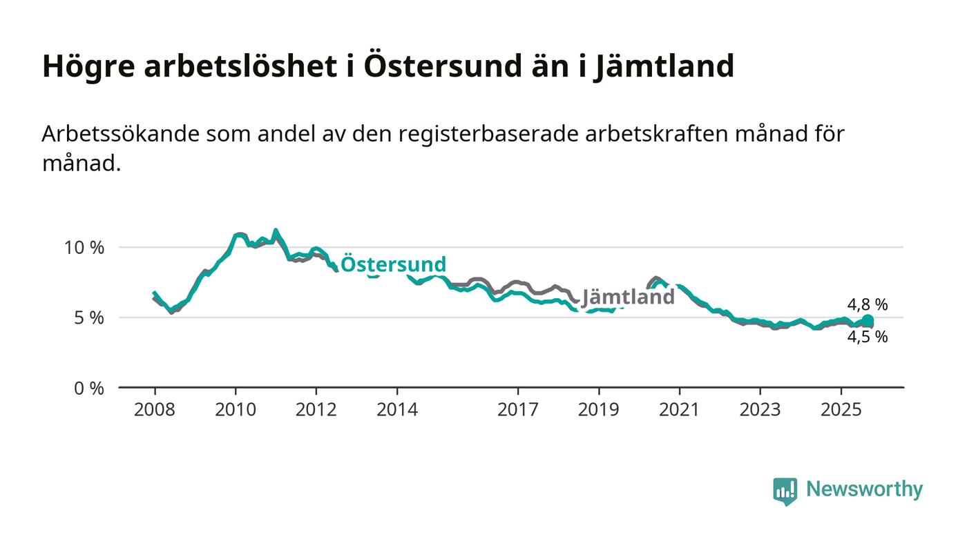 Östersund hade redan tidigare högre arbetslöshet än snittet i hela Jämtlands län och nu växer klyftan (4,8 procent i kommunen, jämfört med 4,5 procent i hela länet). Krokom har den lägsta arbetslösheten i länet (2,9 procent), medan Strömsund har den högsta (5,8 procent). För att Östersund skulle komma ner i samma arbetslöshetsnivå som Krokom skulle 618 personer behöva sysselsättas.