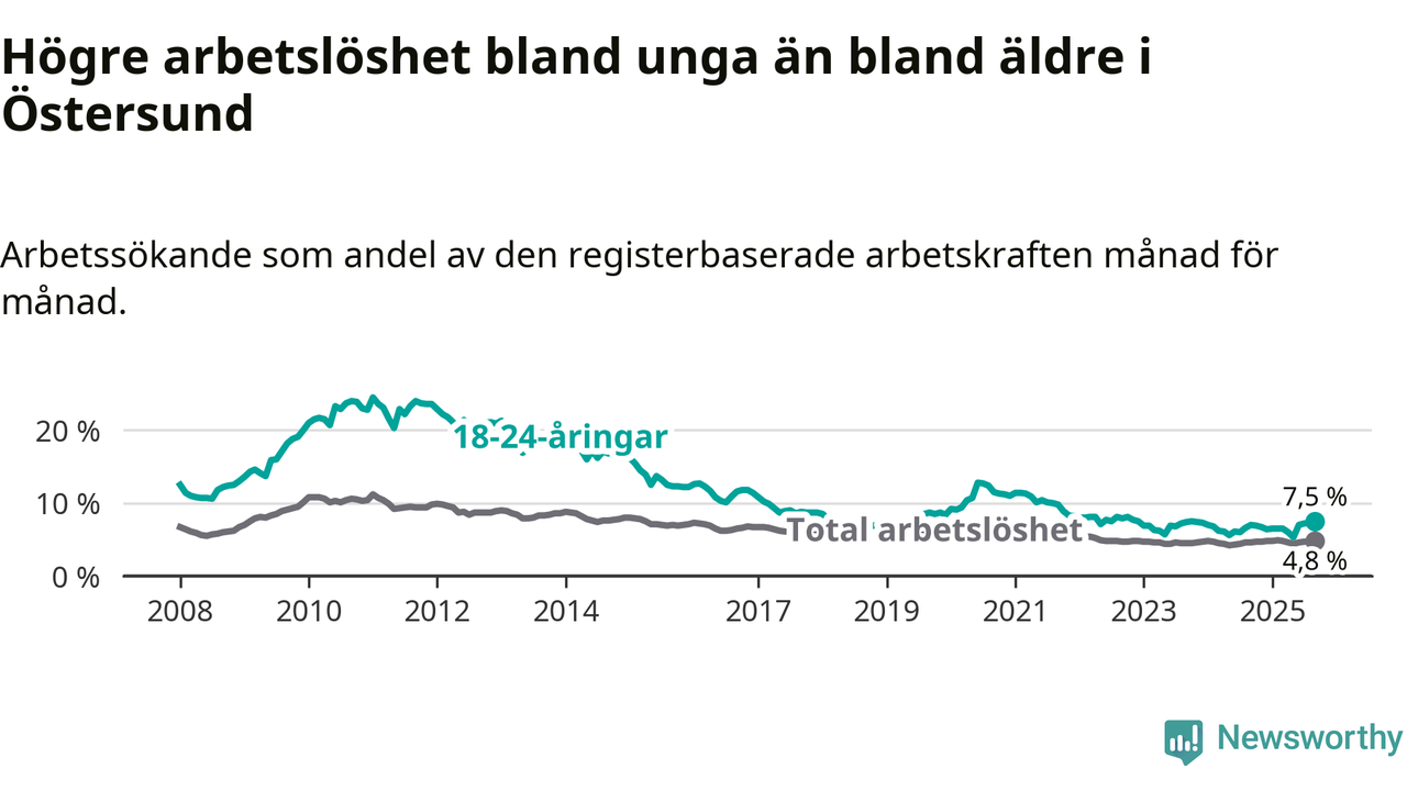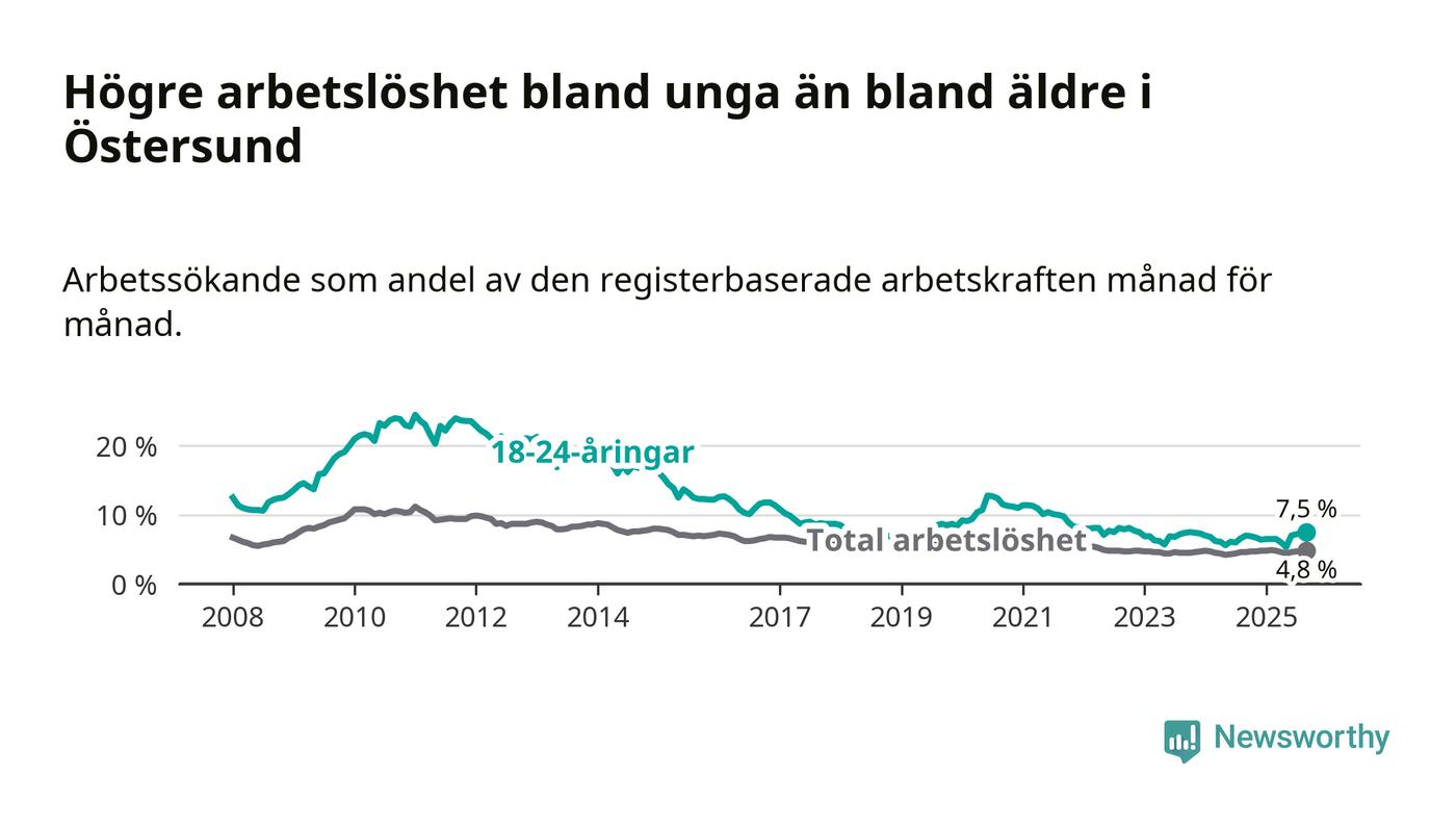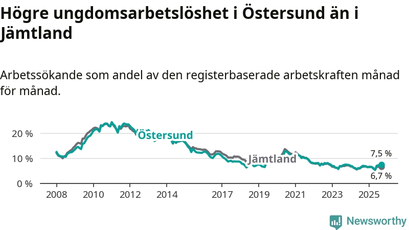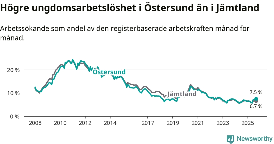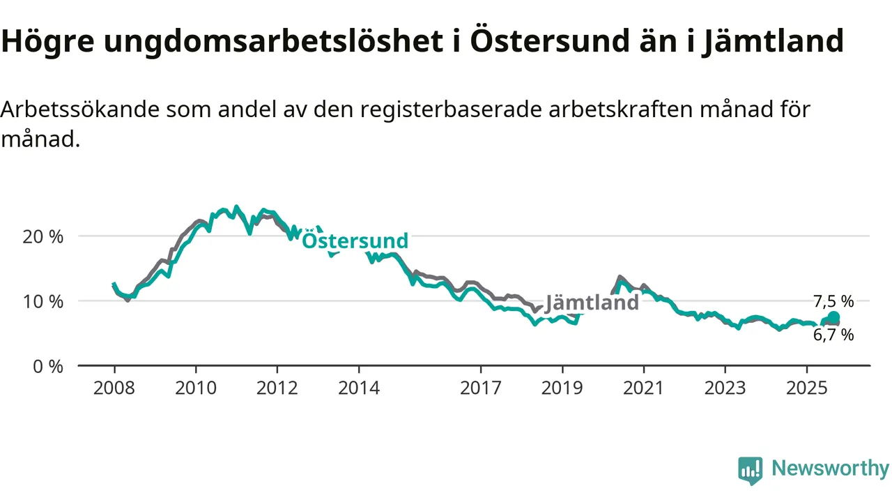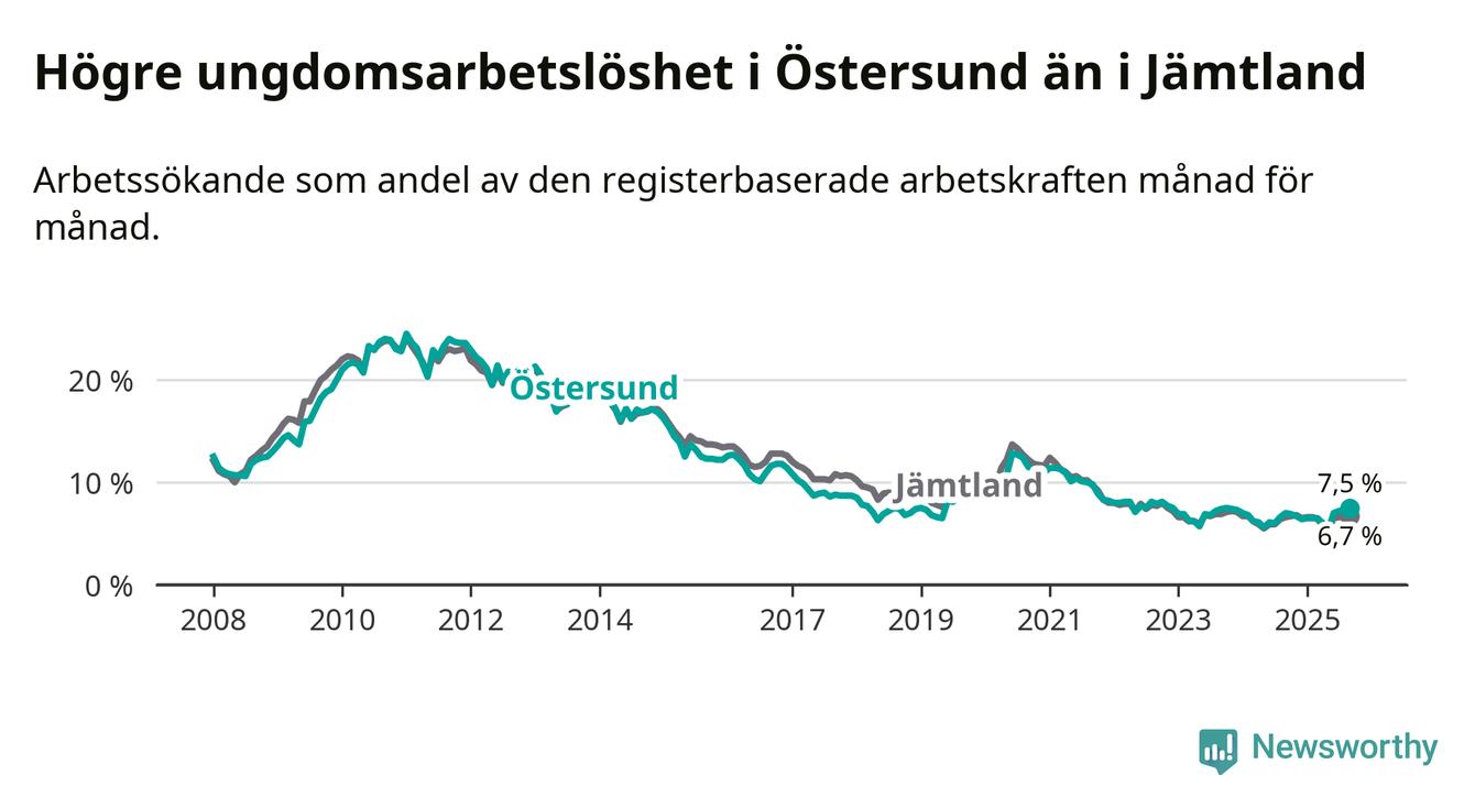 Precis som den totala arbetslösheten ligger ungdomsarbetslösheten i Östersund högre än i Jämtland som helhet. Skillnaden mellan kommunen och länet är 0,8 procentenheter.