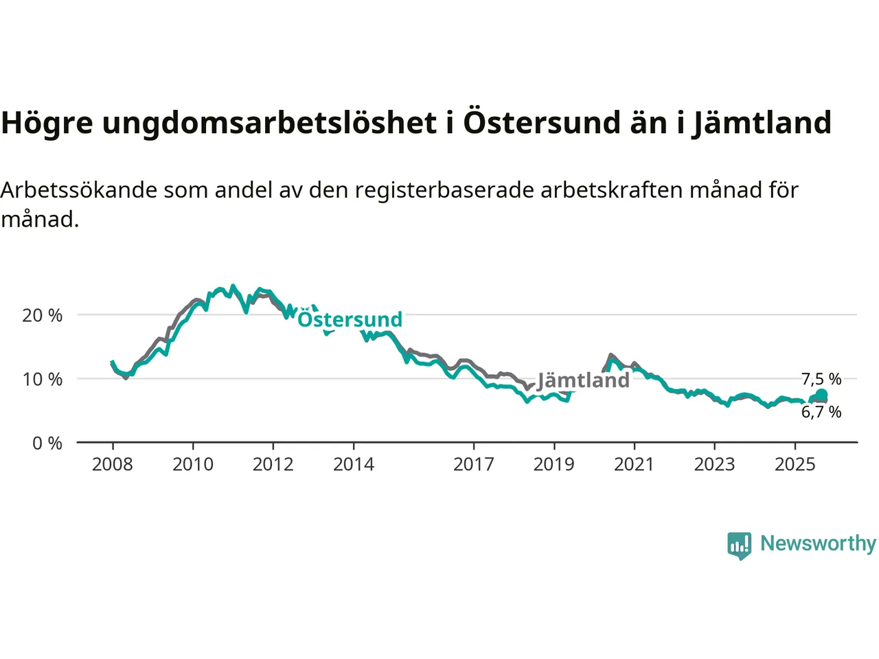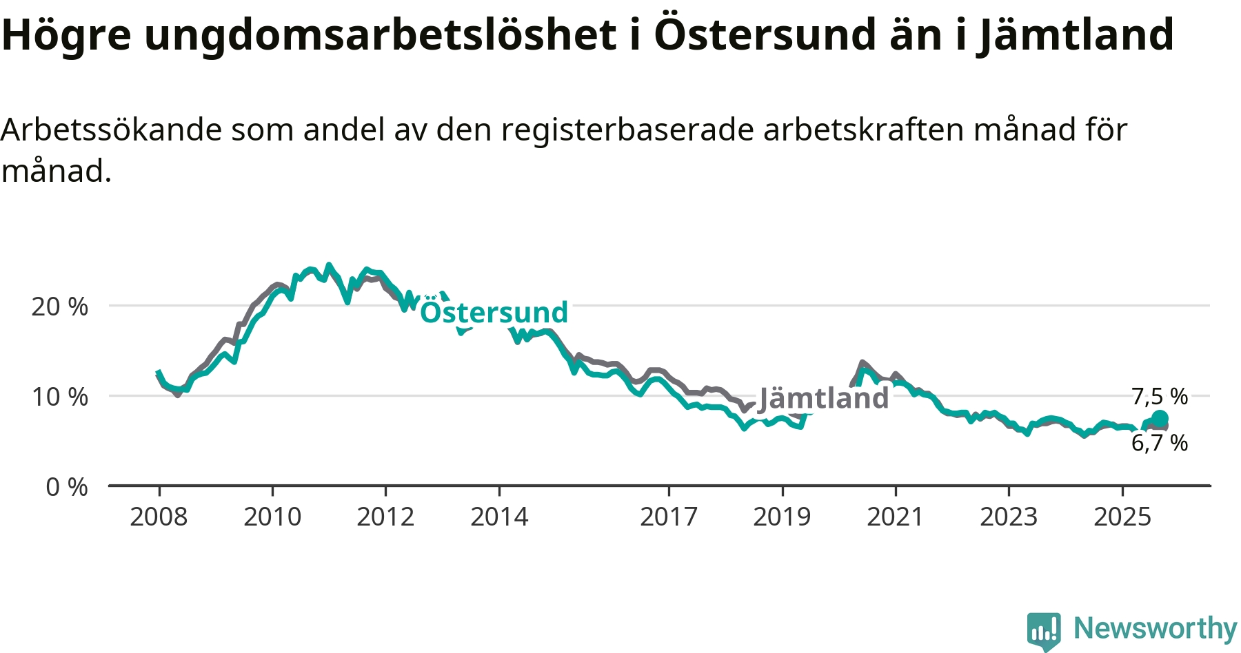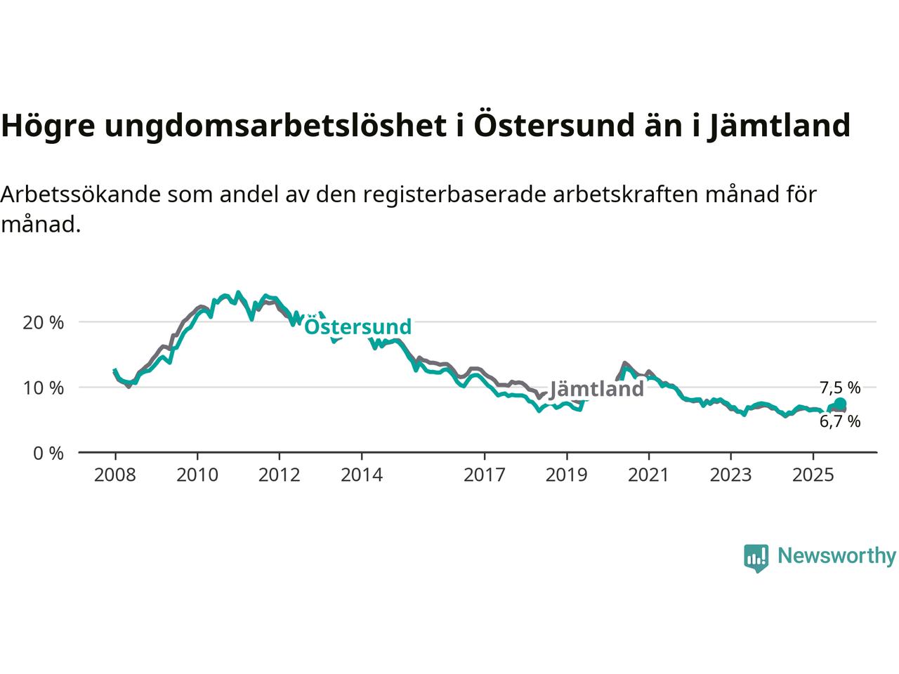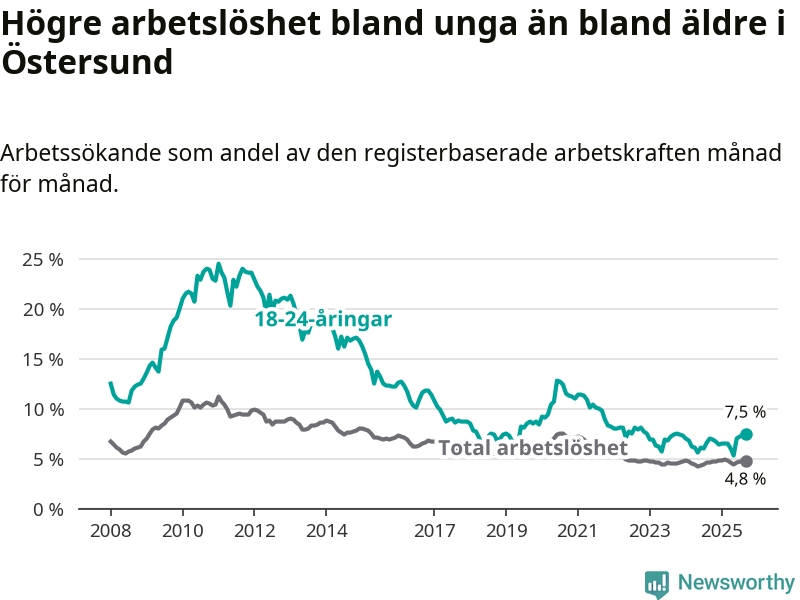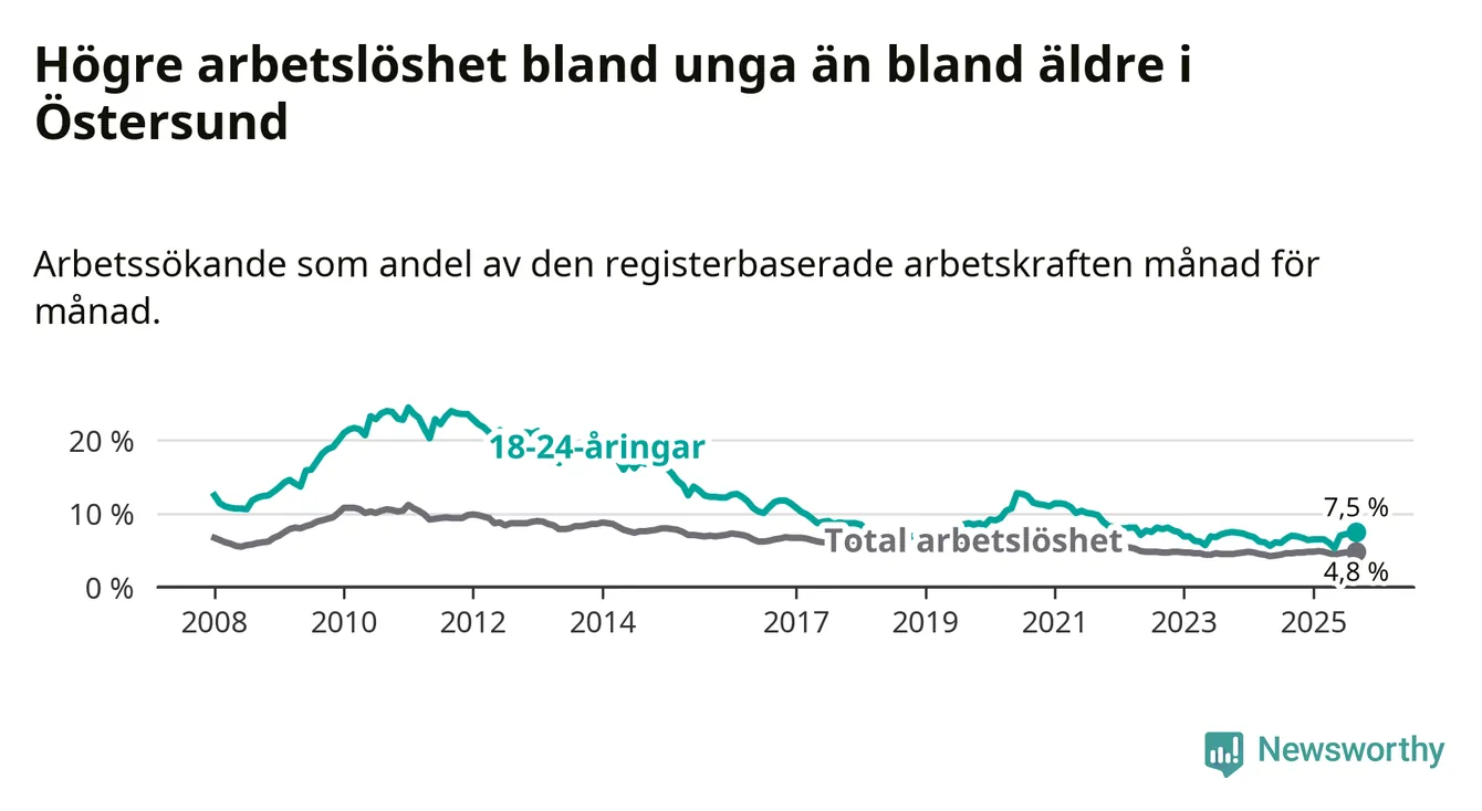 Precis som den totala arbetslösheten ligger ungdomsarbetslösheten i Östersund högre än i Jämtland som helhet. Skillnaden mellan kommunen och länet är 0,8 procentenheter.