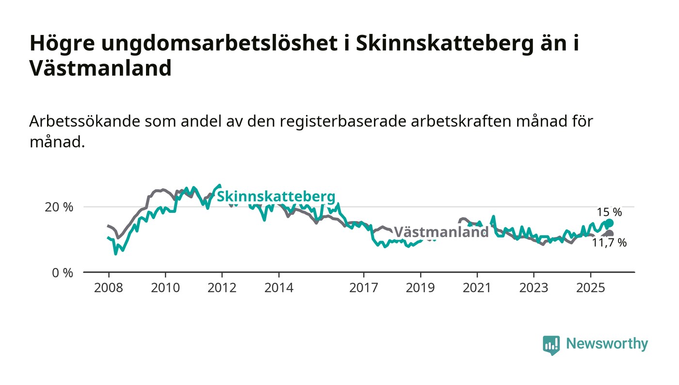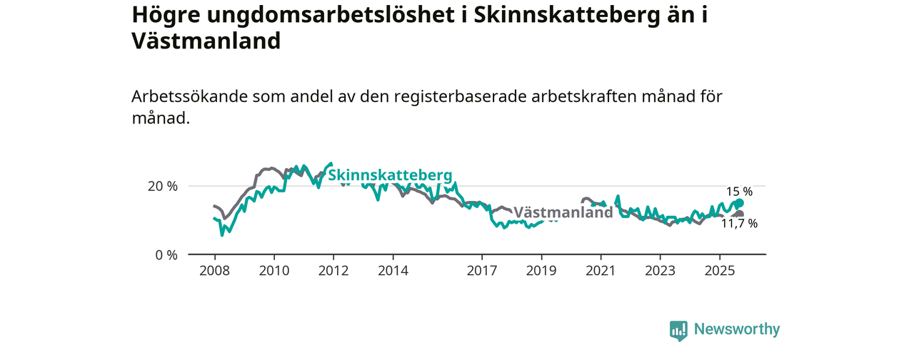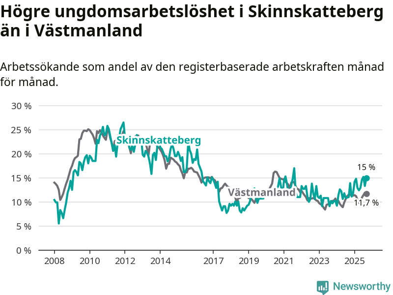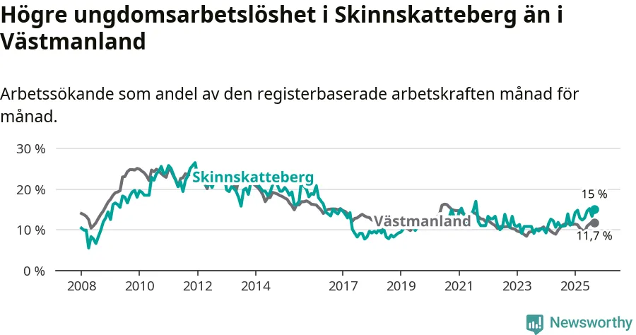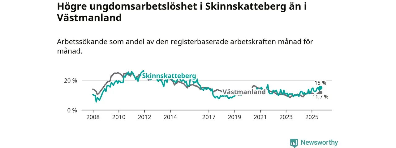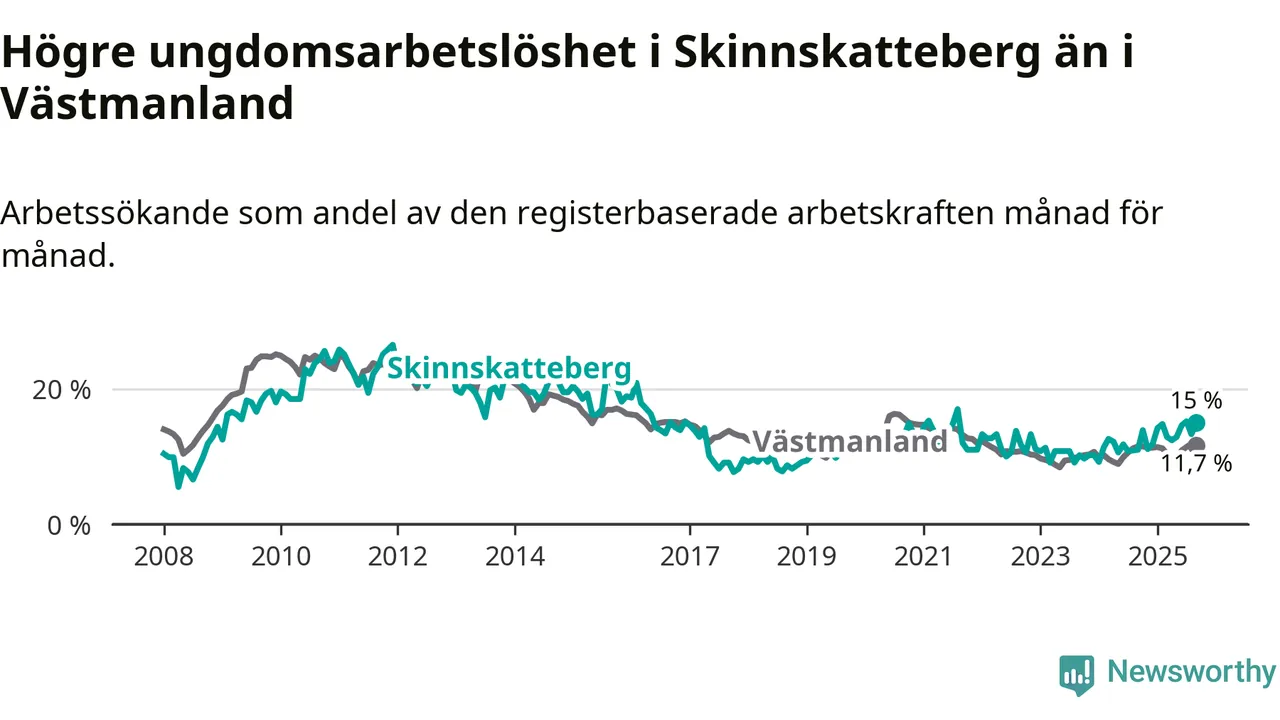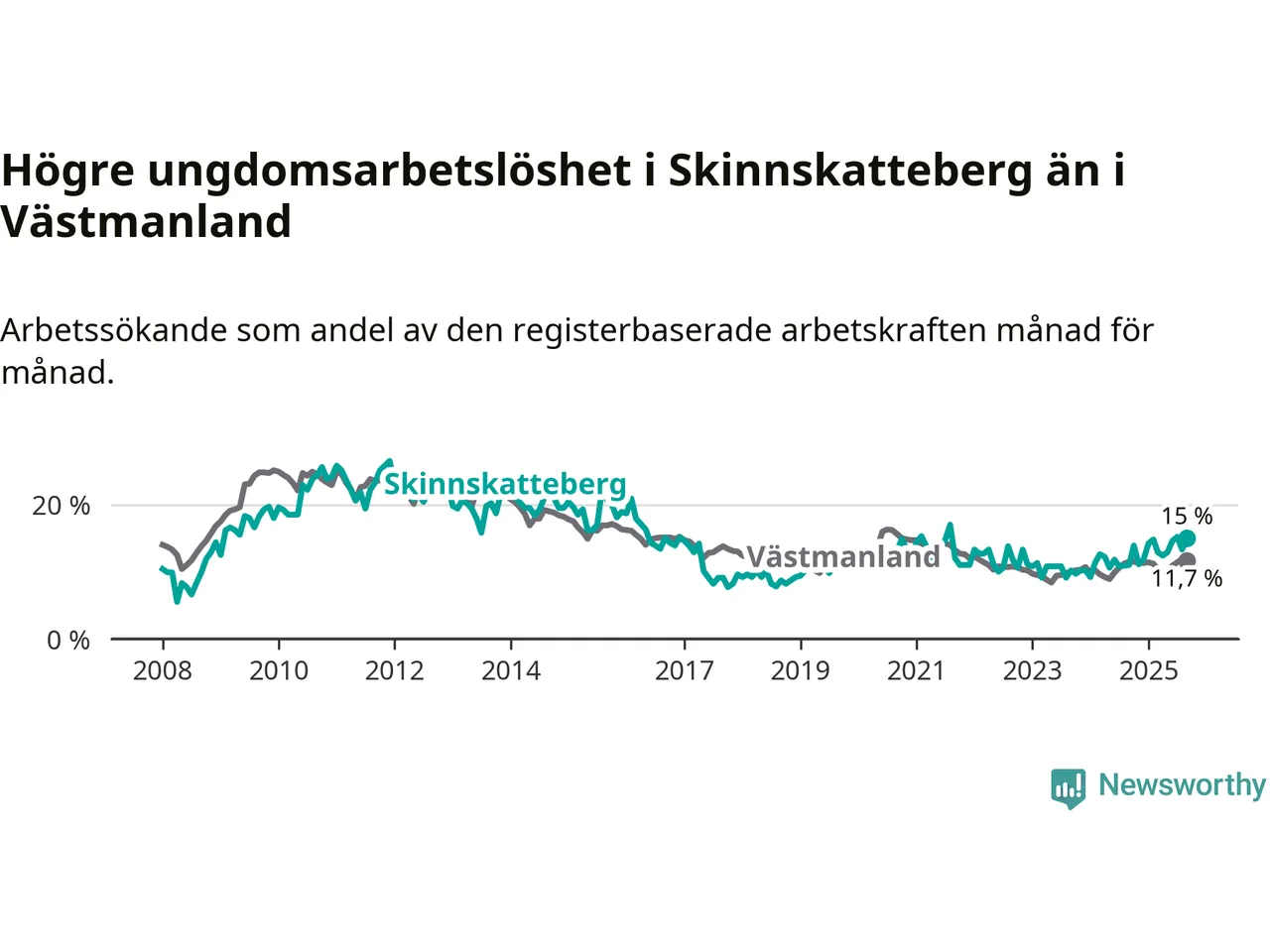 Medan Skinnskatteberg har lägre total arbetslöshet än Västmanland, ligger ungdomsarbetslösheten 3,3 procentenheter högre i Skinnskatteberg.