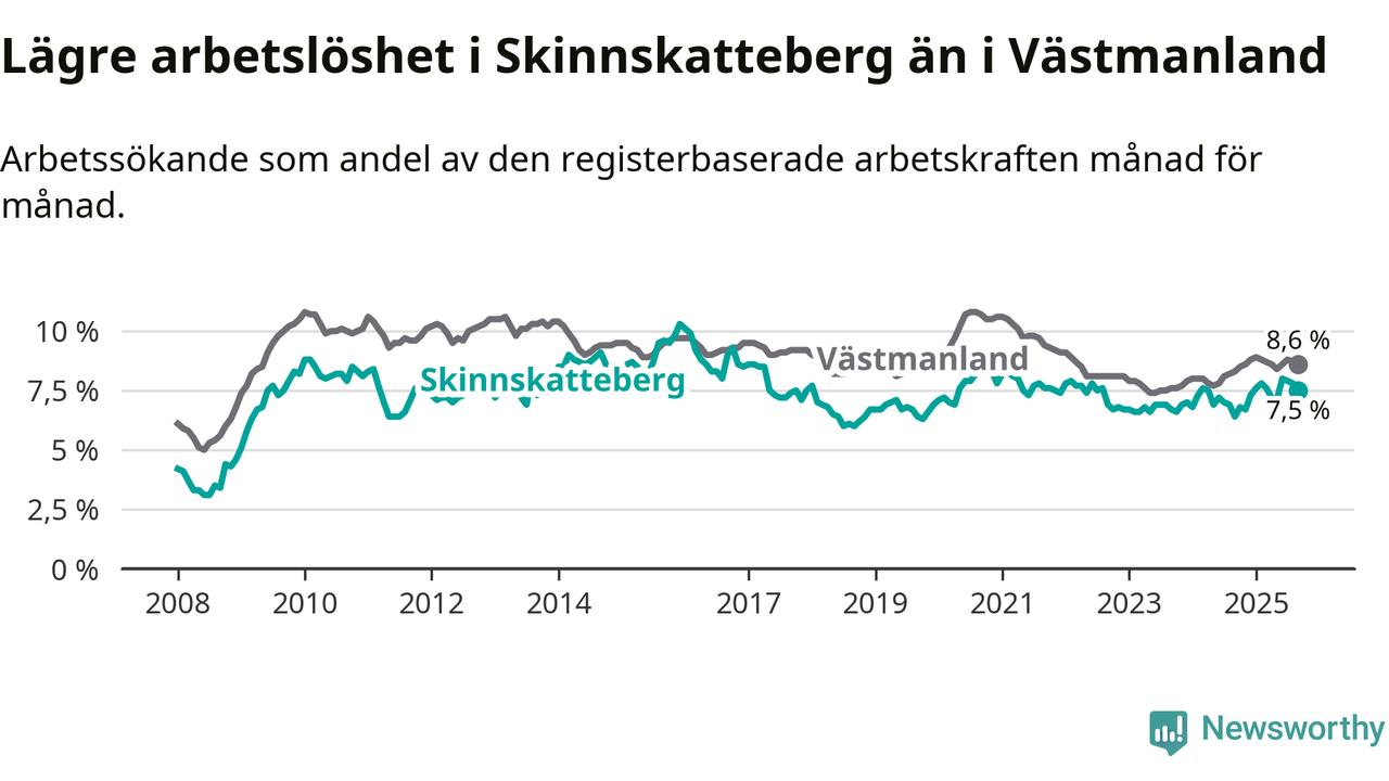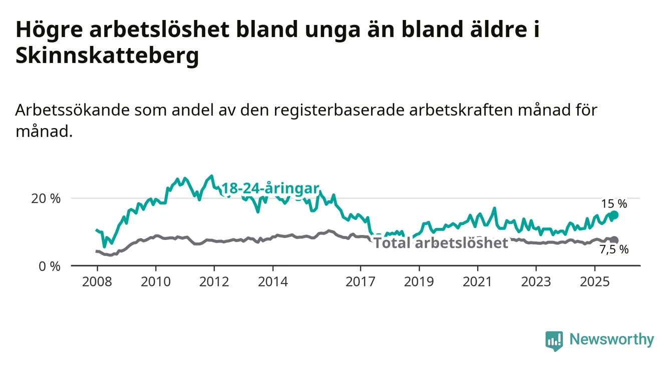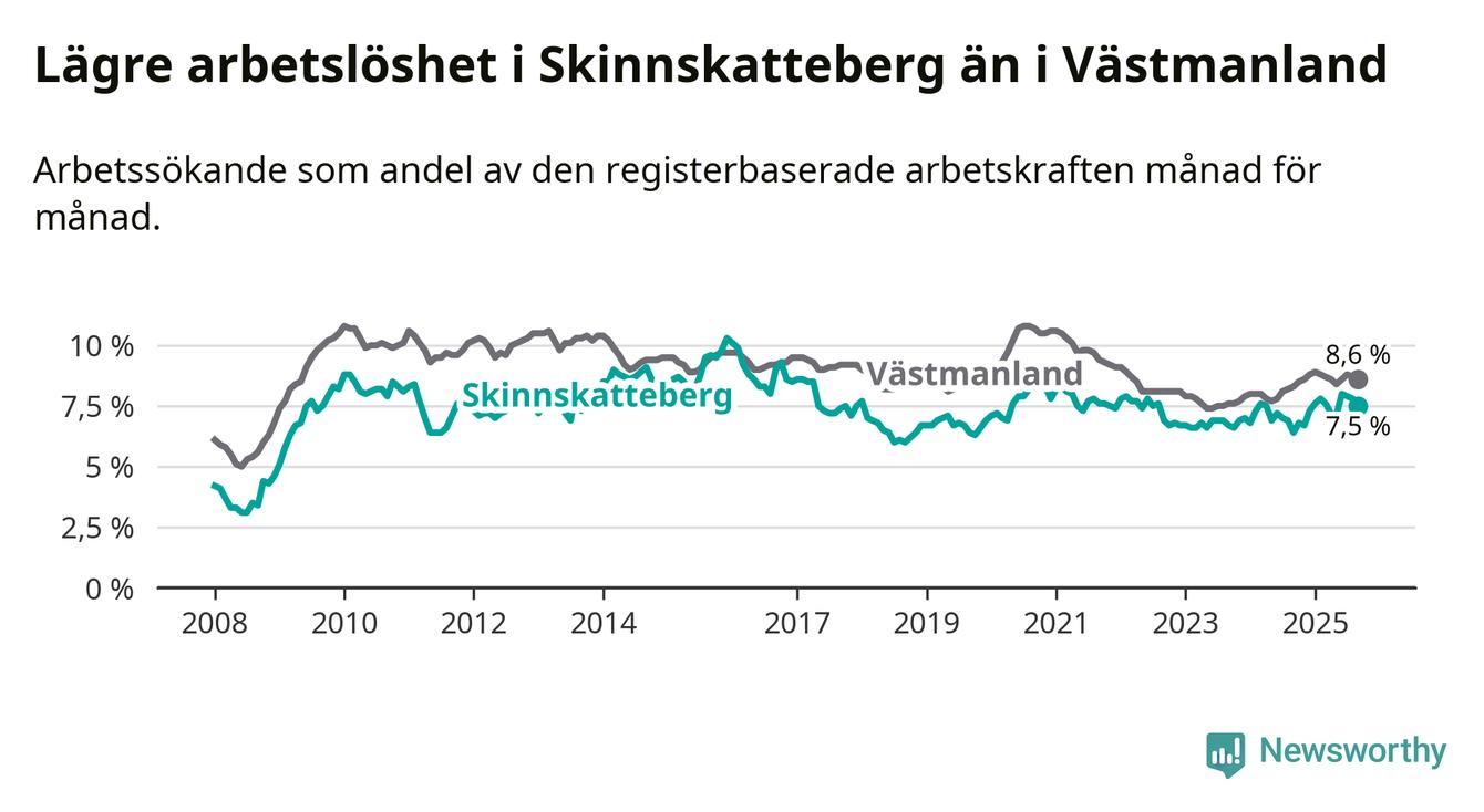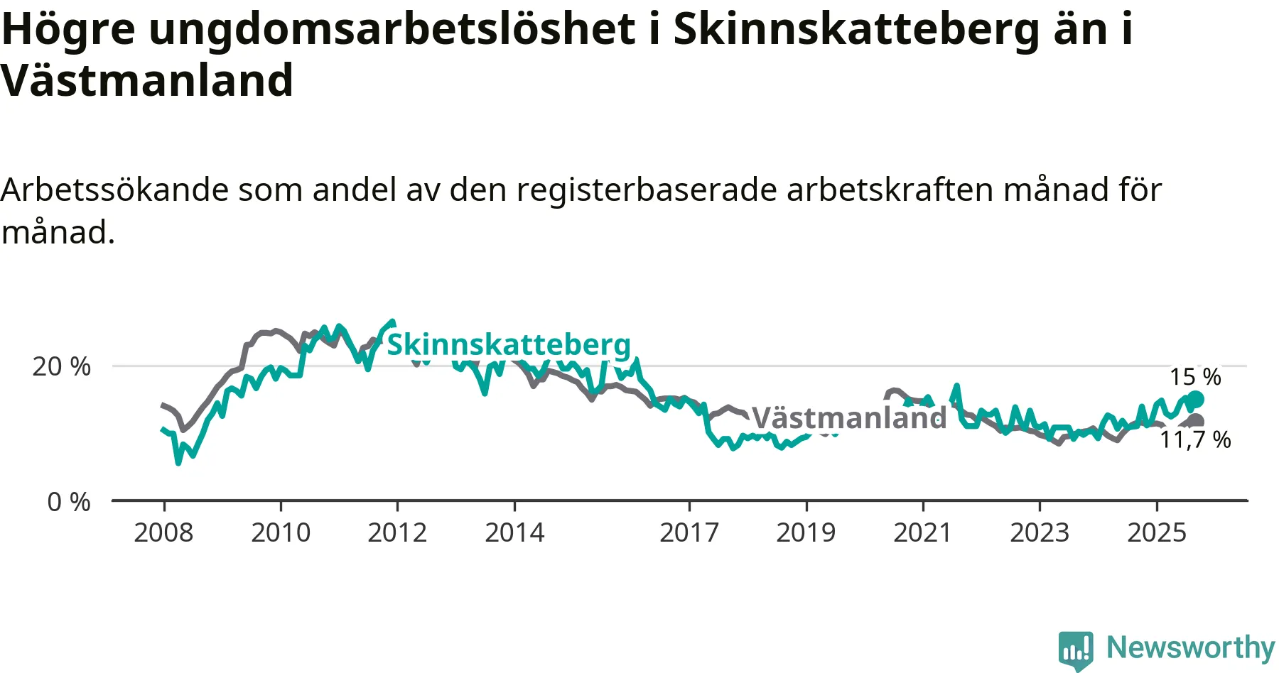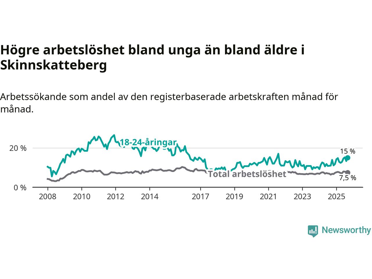 Medan Skinnskatteberg har lägre total arbetslöshet än Västmanland, ligger ungdomsarbetslösheten 3,3 procentenheter högre i Skinnskatteberg.