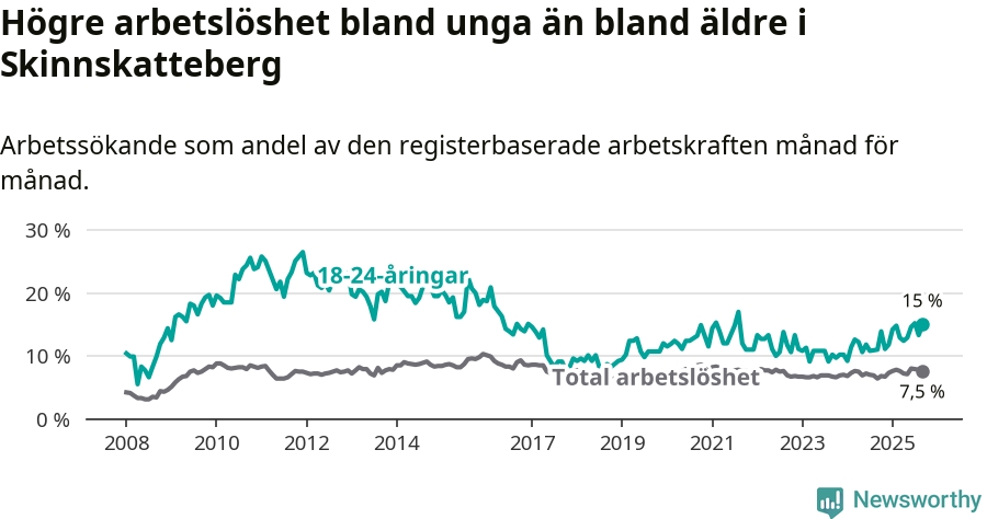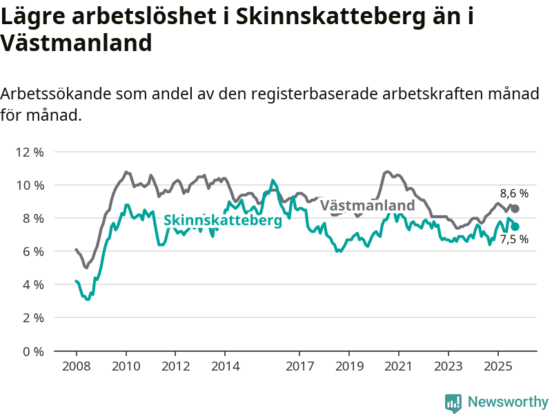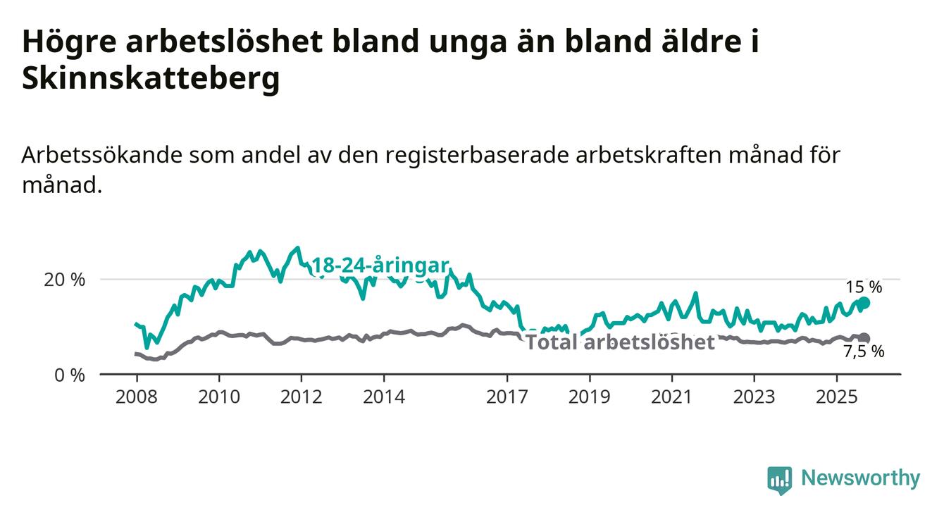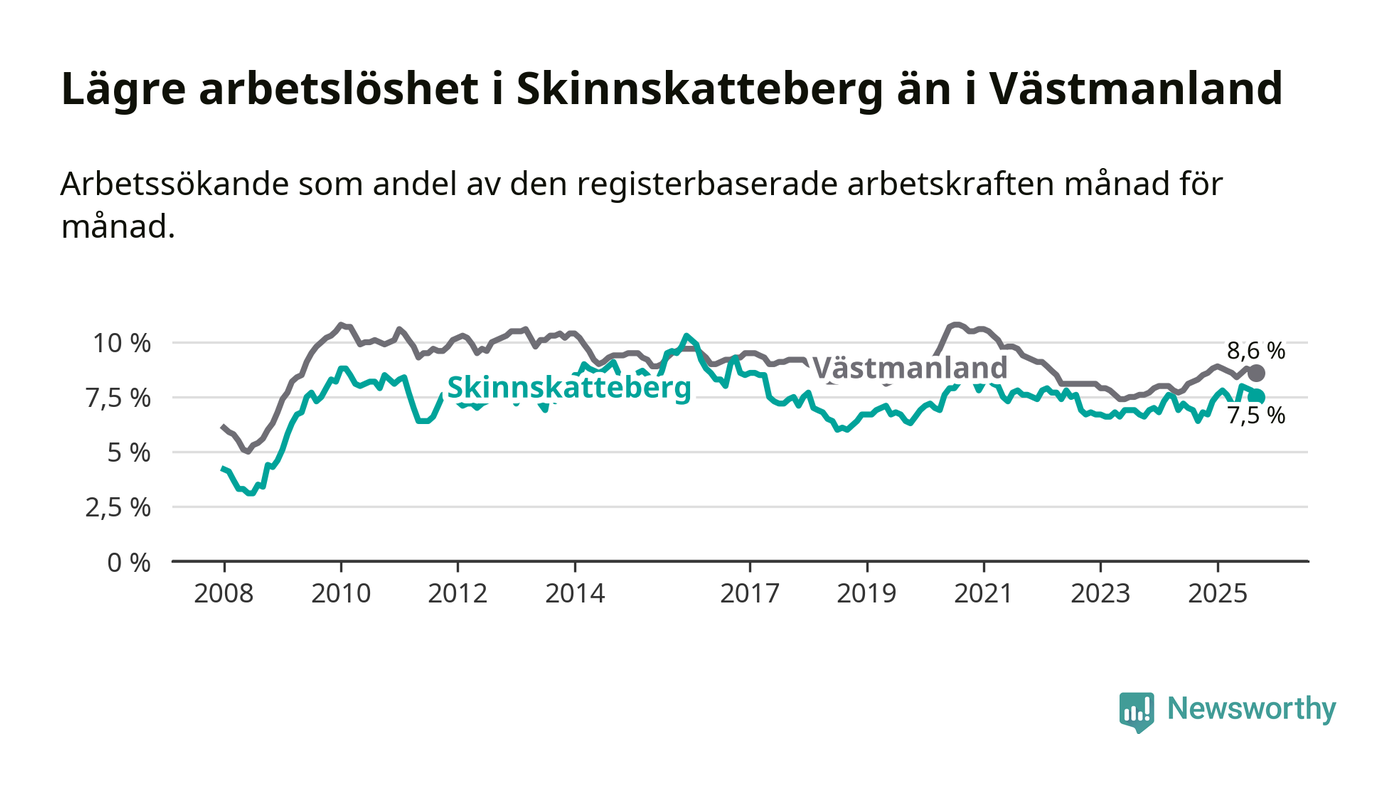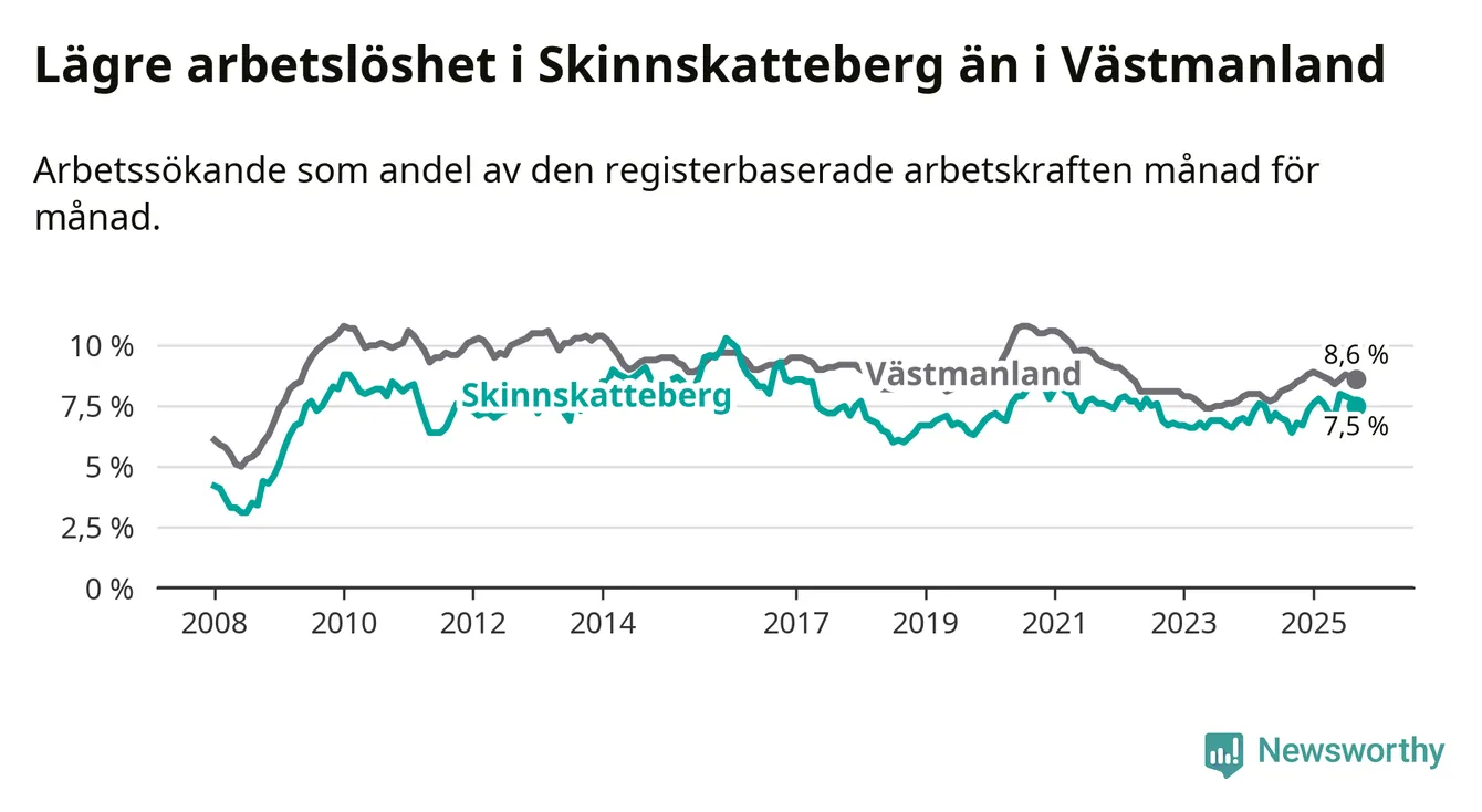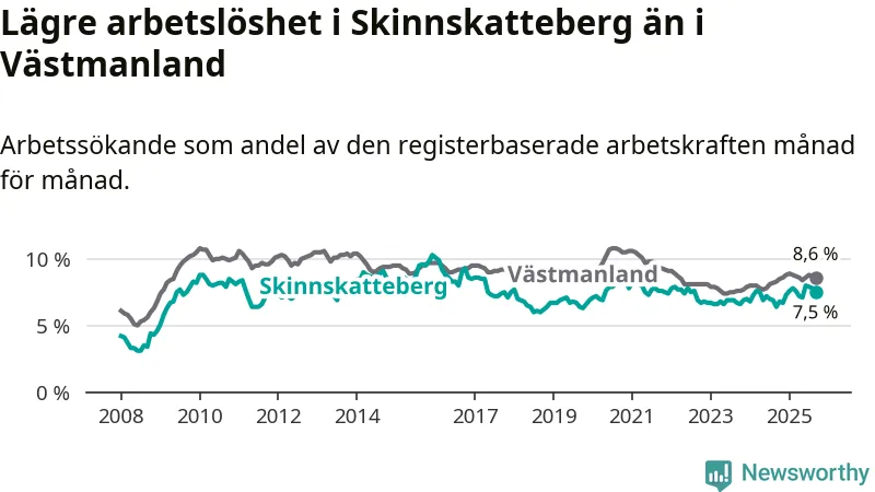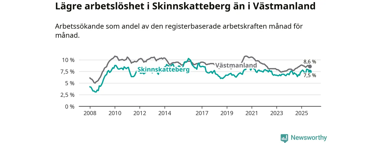 Medan Skinnskatteberg har lägre total arbetslöshet än Västmanland, ligger ungdomsarbetslösheten 3,3 procentenheter högre i Skinnskatteberg.