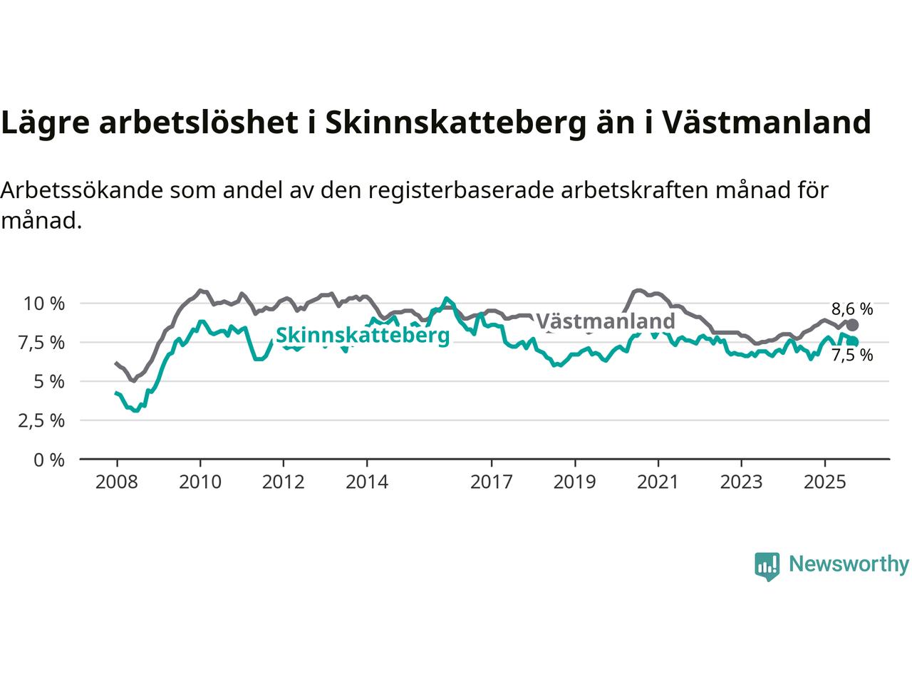 Under september månad rapporterade Skinnskattebergs kommun en total arbetslöshet på 7,5 procent. Det är en ökning jämfört med samma tidpunkt i fjol (+1,1 procentenheter). Även i Västmanlands län stiger arbetslösheten .