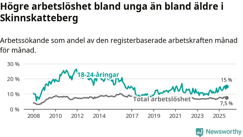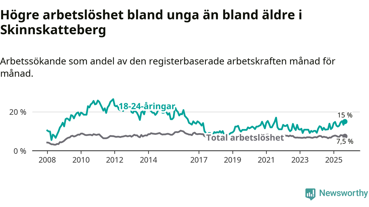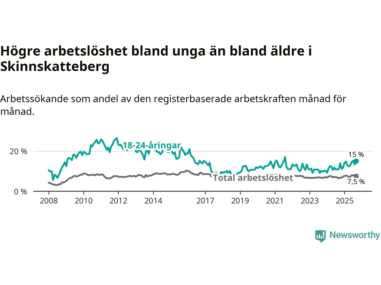 I och med den senaste månadens uppgång har de ungas arbetslöshet i Skinnskatteberg stigit 14 månader i följd (upp från 10,8 procent i juli 2024 till 15,0 procent nu).