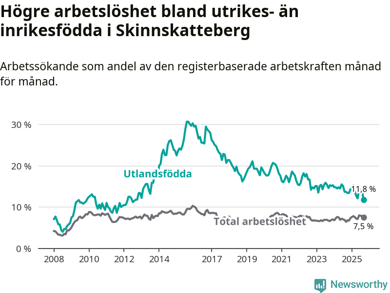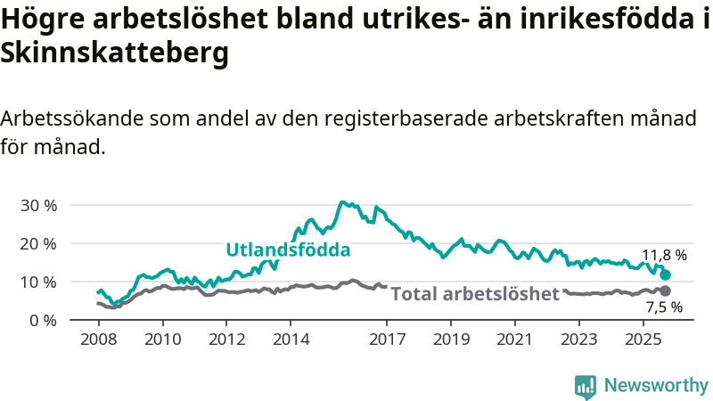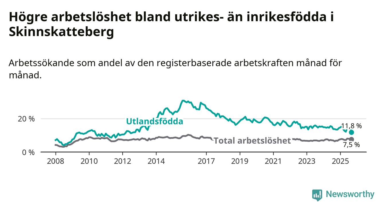 Arbetslösheten bland utlandsfödda var 11,8 procent i Skinnskatteberg under september månad, motsvarande 37 av 314 personer. Det är 1,9 procentenheter färre än vid samma tidpunkt i fjol (−8 om man räknar personer). Den nuvarande arbetslöshetsnivån är den lägsta sedan oktober 2012. Den senaste månadens nedgång innebär ett trendbrott. Under de ett föregående månaderna hade arbetslösheten bland utlandsfödda varit högre än motsvarande tidpunkt året innan.